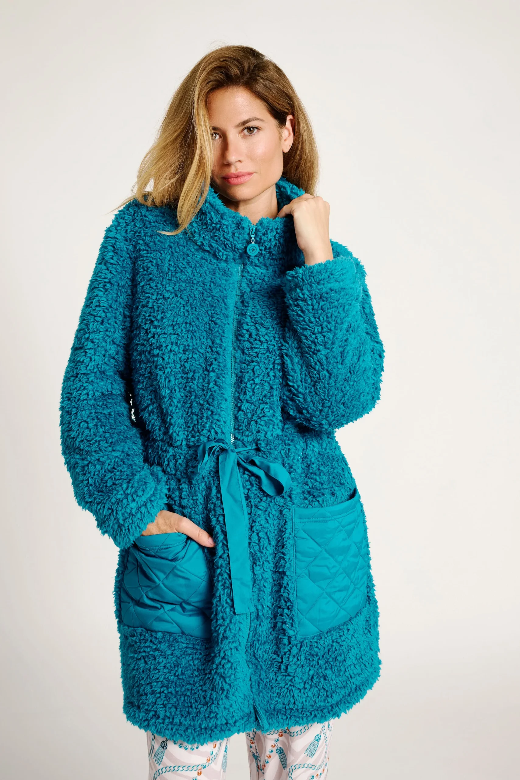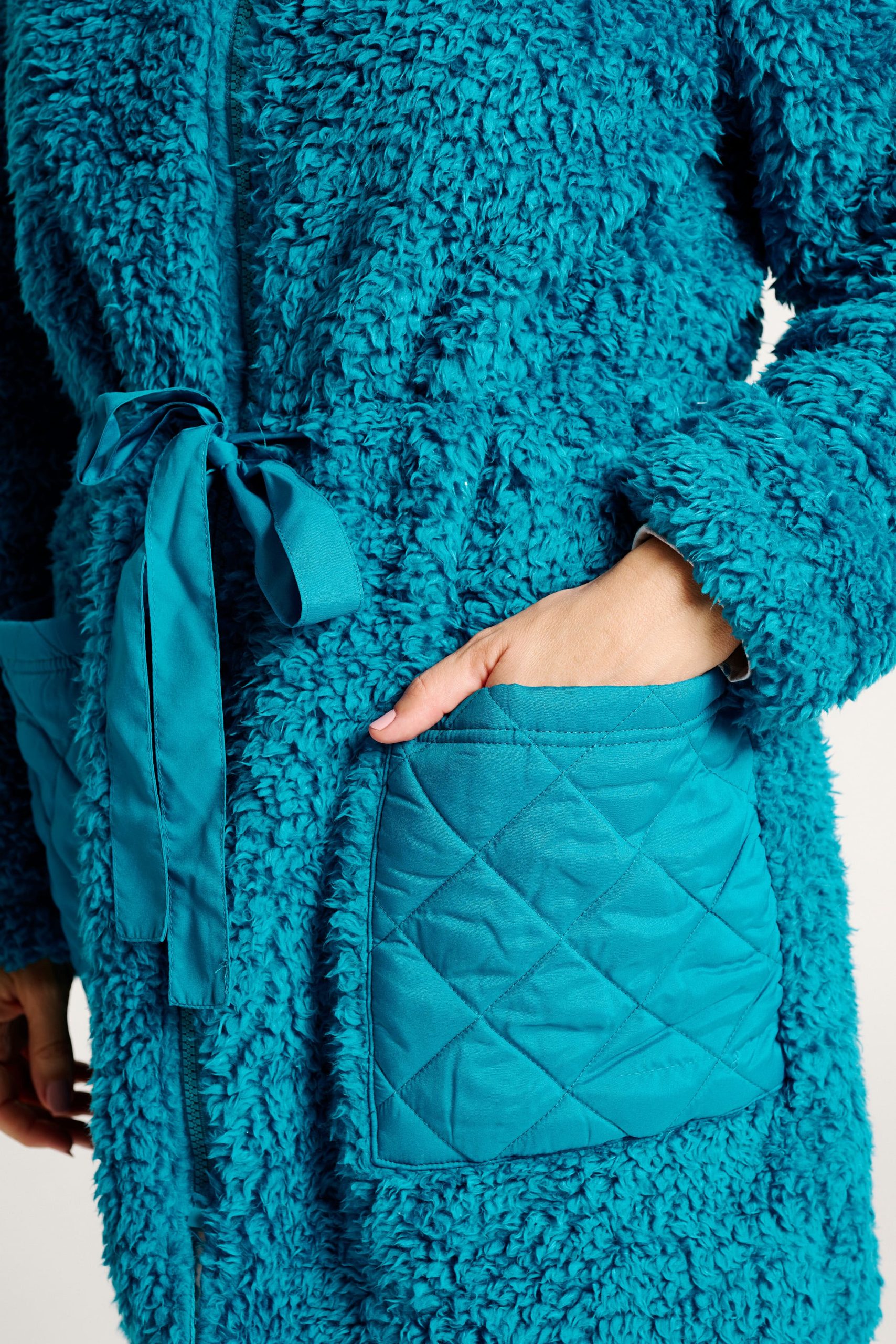 Accappatoio da donna realizzato in morbido tessuto effetto shearling, di colore blu intenso. Presenta una chiusura frontale con bottoni, una cintura regolabile e due ampie tasche imbottite in tessuto trapuntato a contrasto. Un design caldo e moderno, perfetto per godersi il comfort di casa nelle giornate fredde.