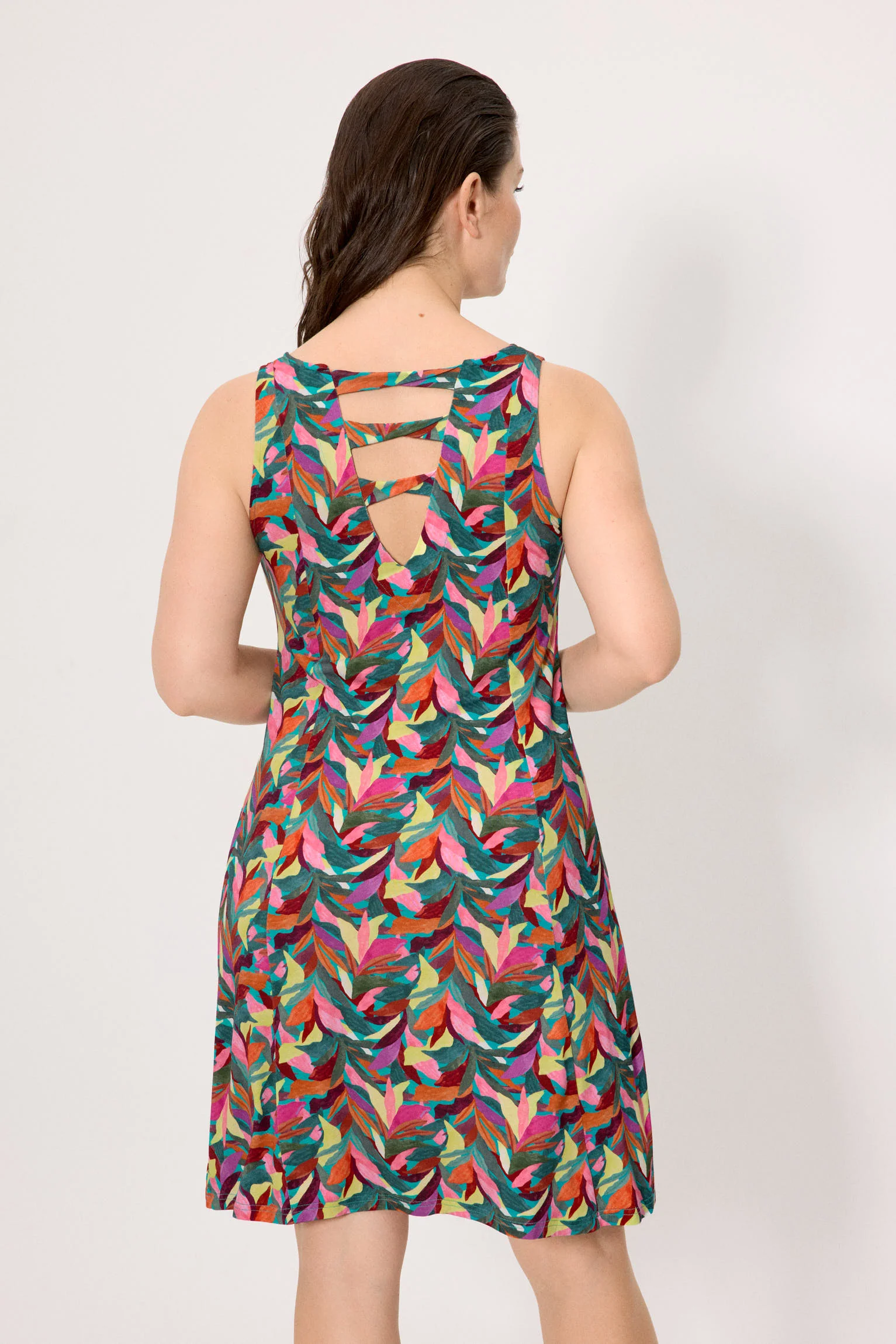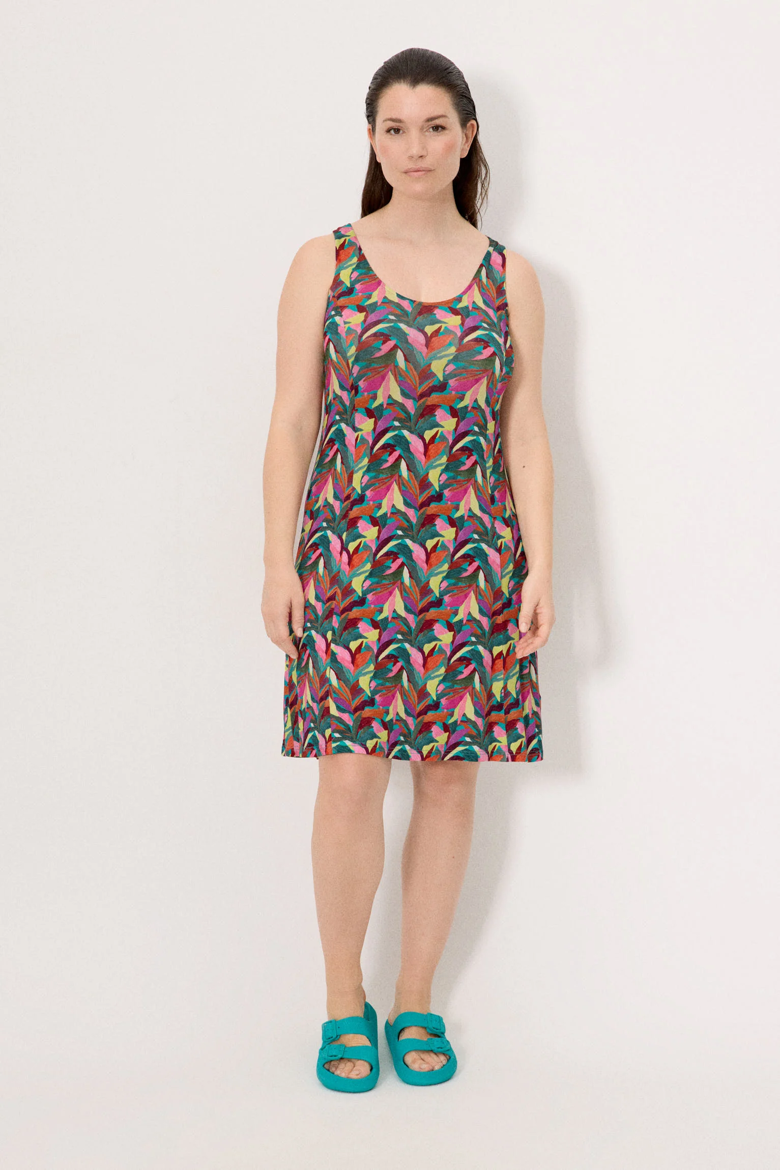 Abito lungo fino al ginocchio. Modello comodo in viscosa, un tessuto morbido, fresco e leggero, ideale per l’estate.