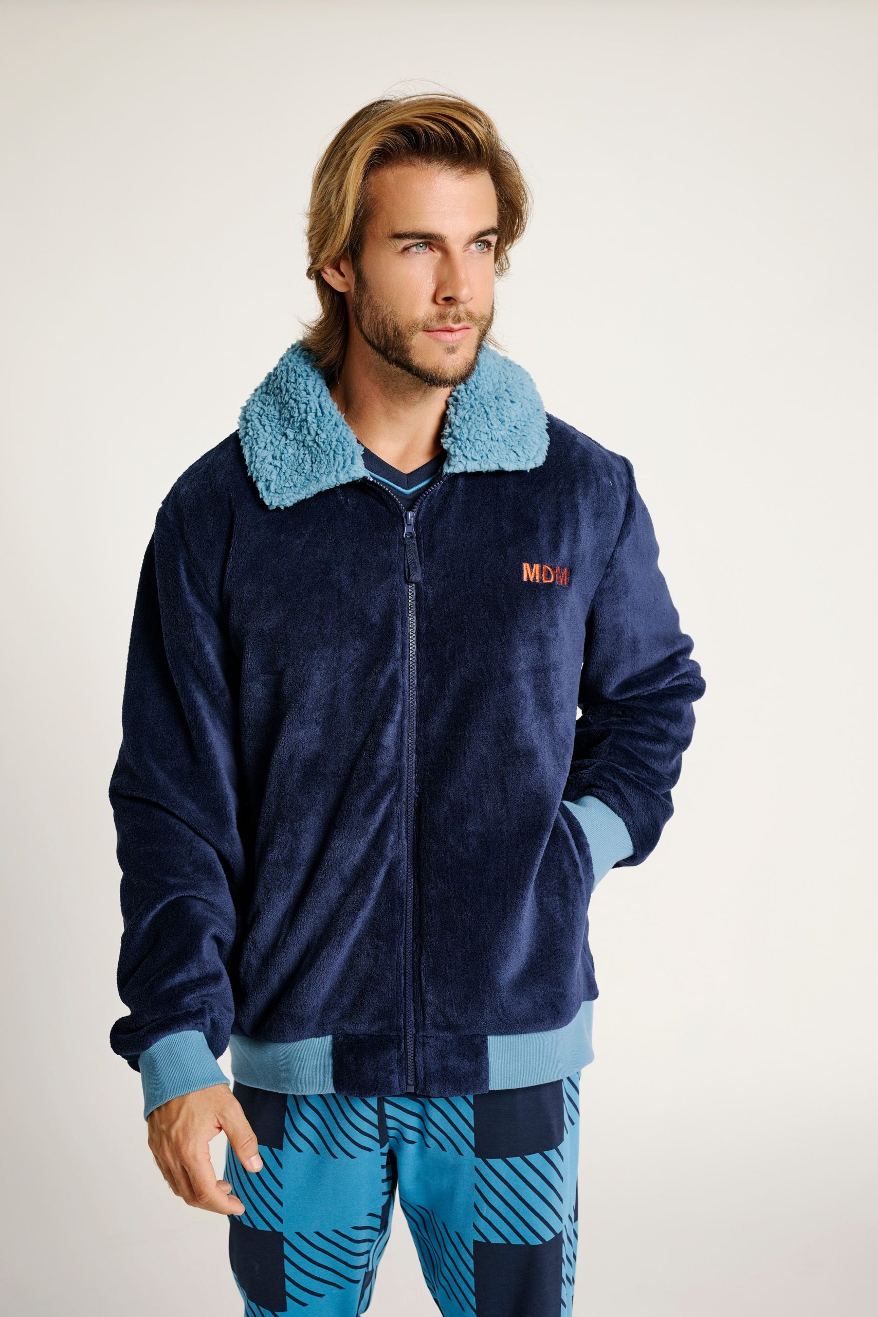 Questa vestaglia da uomo in pile unisce calore e design con un tocco distintivo: il colletto in shearling a contrasto. Il tessuto effetto pile è morbidissimo al tatto e offre un comfort totale. Il ricamo “MDM” sul petto e i polsini e l’orlo a coste ne rafforzano il look moderno, perfetto per rilassarsi a casa con personalità.