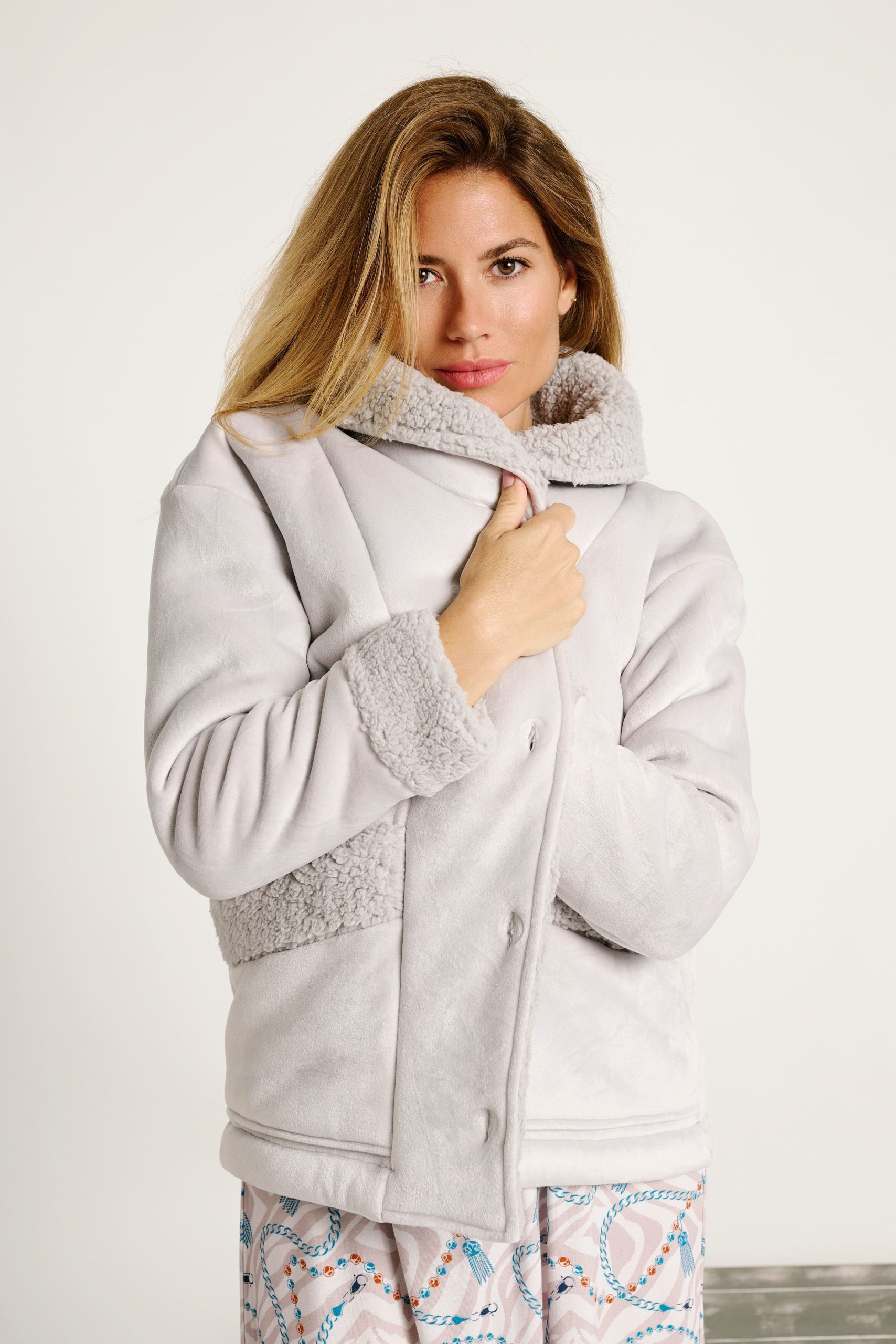 Accappatoio stile giacca in morbido pile grigio con interno e dettagli in shearling. Presenta una chiusura frontale con bottoni e un collo alto per maggiore calore. Progettato con polsini e fascia inferiore in shearling a contrasto, oltre a pratiche tasche laterali. Ideale per stare a casa con stile e comfort nelle giornate fredde.