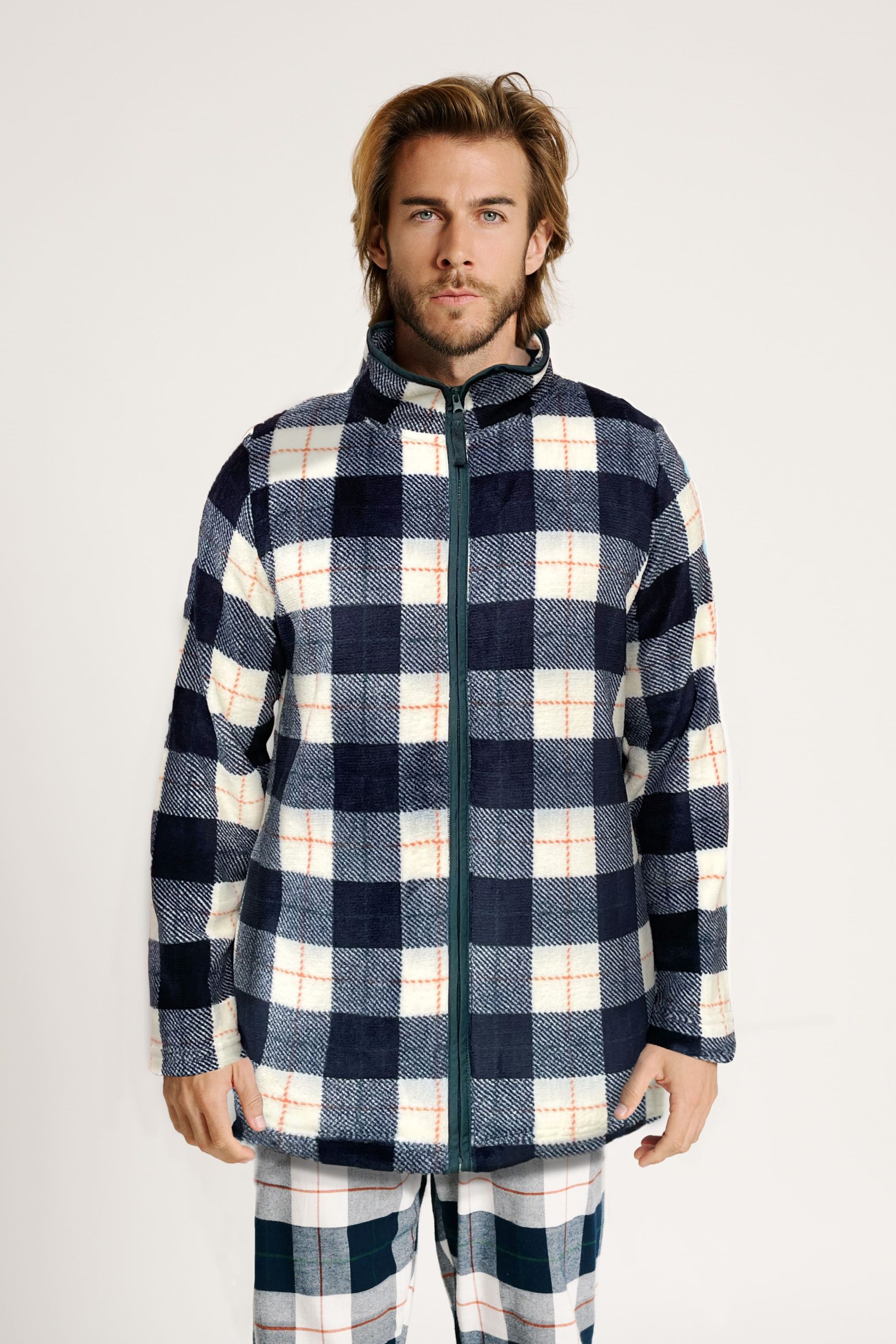 Questa vestaglia da uomo in pile è perfetta per chi apprezza la comodità senza rinunciare allo stile. Realizzata in morbido e caldo pile, la sua stampa scozzese blu navy ed écru aggiunge un tocco maschile senza tempo. La chiusura con zip e le tasche laterali lo rendono un capo pratico, pensato per l’uso quotidiano in casa.
