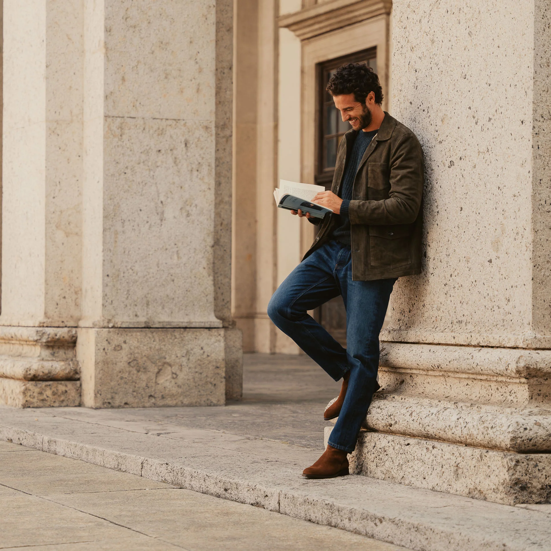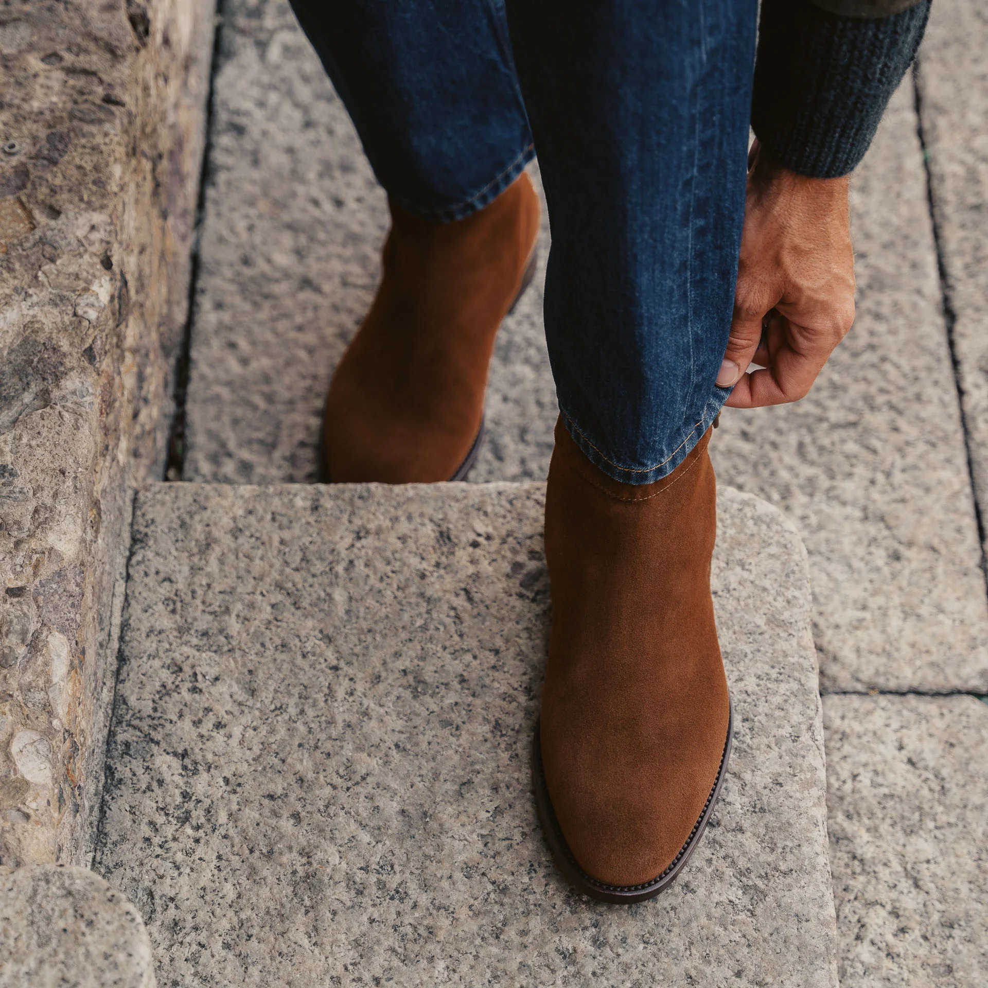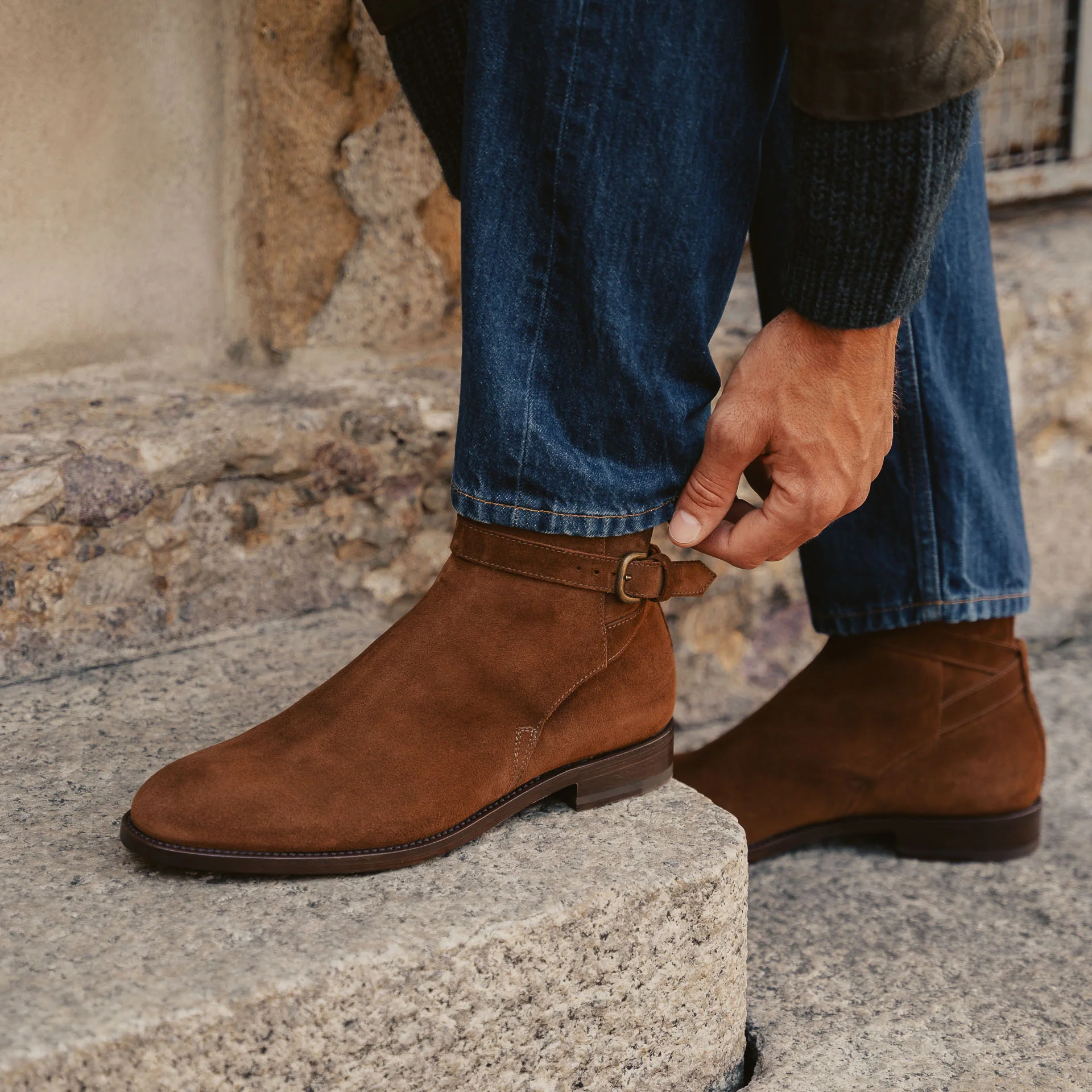 Sono gli stivaletti con fibbia dalle linee semplici ma eleganti, fatti a mano in Italia. La pelle di vitello scamosciata li rende ancora più flessibili, mentre l’accostamento tra gomma e cuoio nella suola garantisce maggior comfort a ogni passo. Noi li abbiamo abbinati a una giacca in camoscio, a una maglia a coste e un jeans.