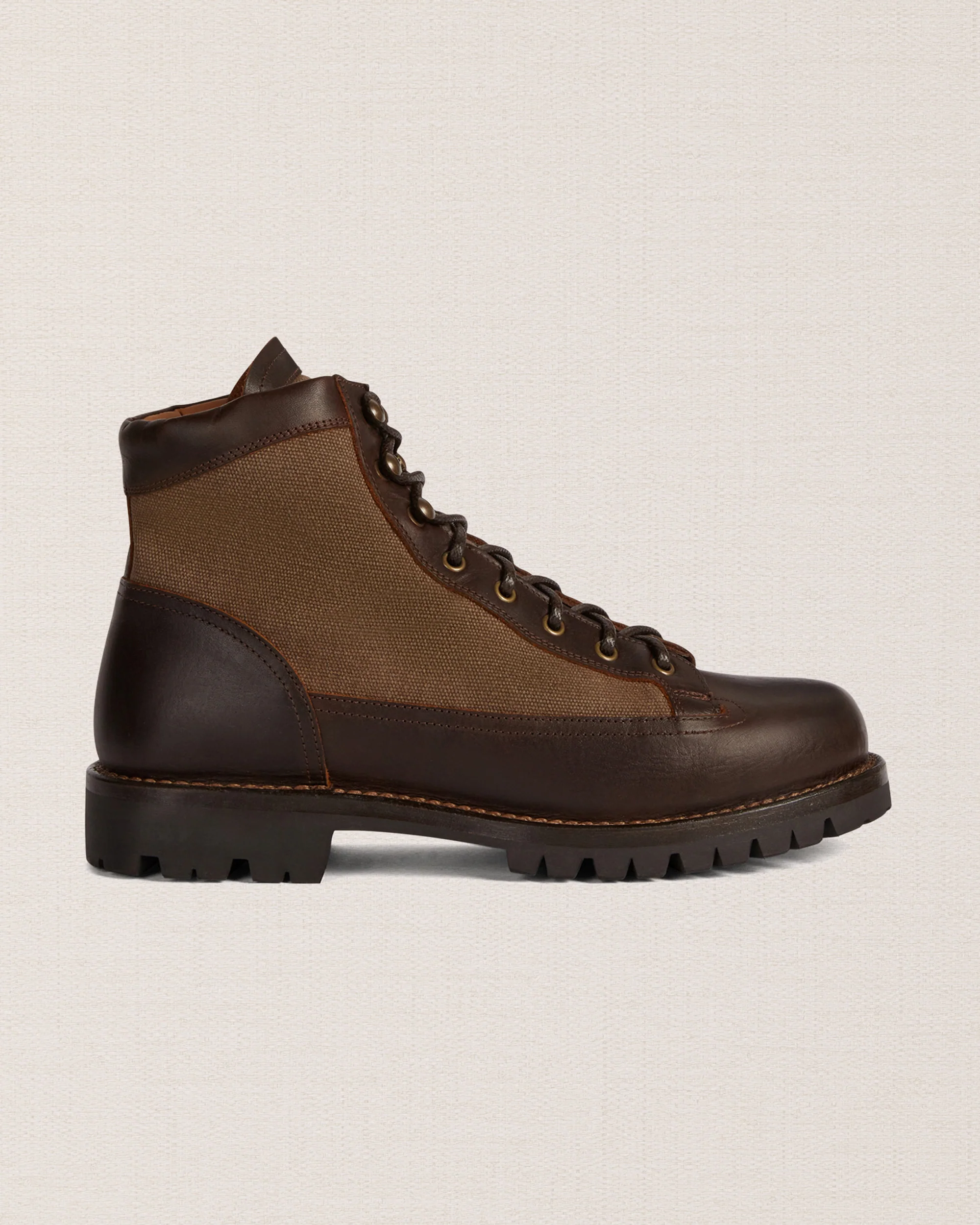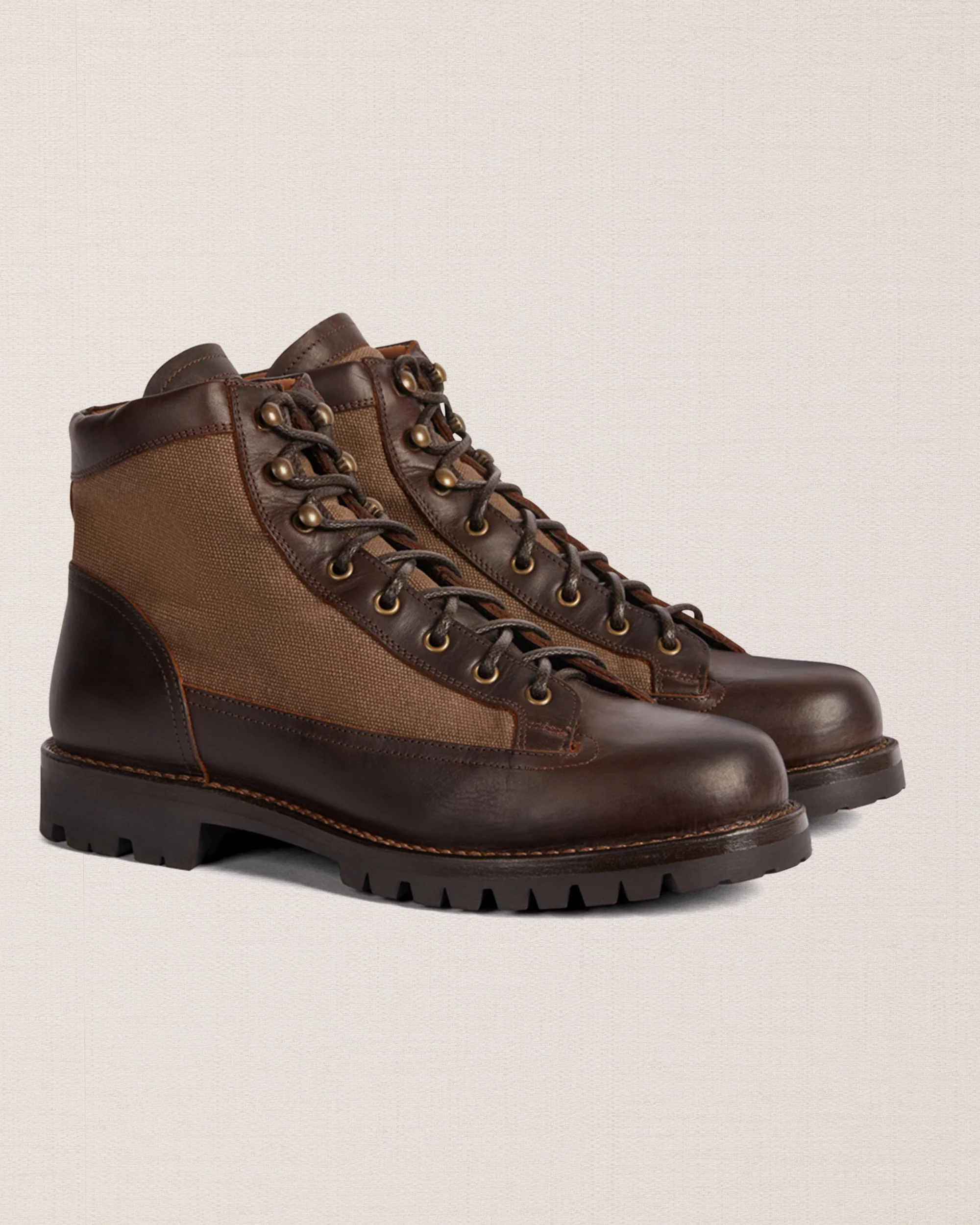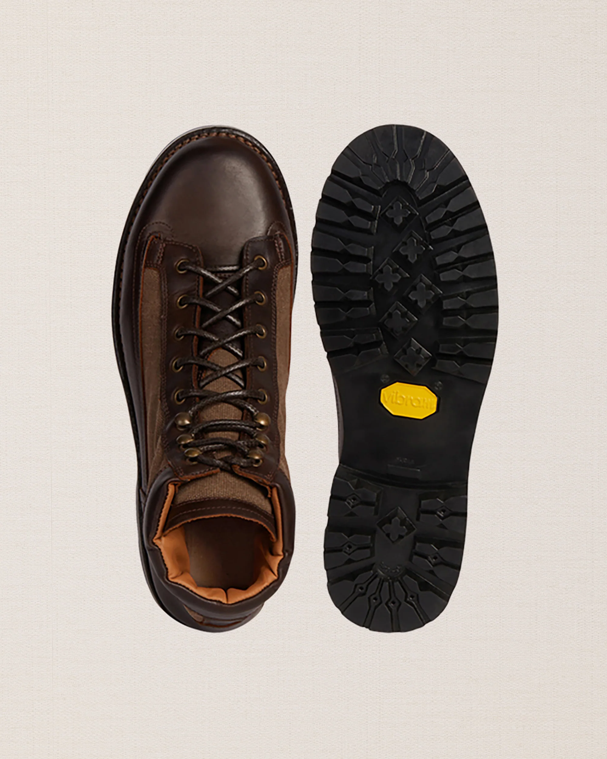 Le pedule dal tocco vintage in pelle liscia testa di moro e inserti in canvas marrone. Ispirate alle lunghe passeggiate tra i sentieri di montagna, hanno i lacci in corda e la suola in gomma carrarmato Vibram, che resiste all’usura e si adatta a tutti i terreni.