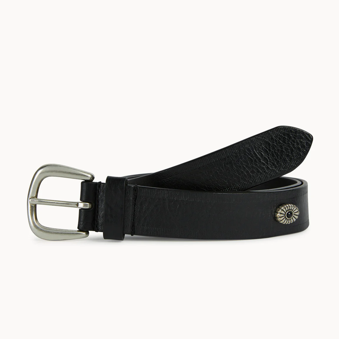 La classica cintura da jeans, di pelle liscia, con le borchiette a decoro e la fibbia semplice. La puoi indossare senza impegno, tutte le volte che vuoi. Fatta a Montegranaro (FM).