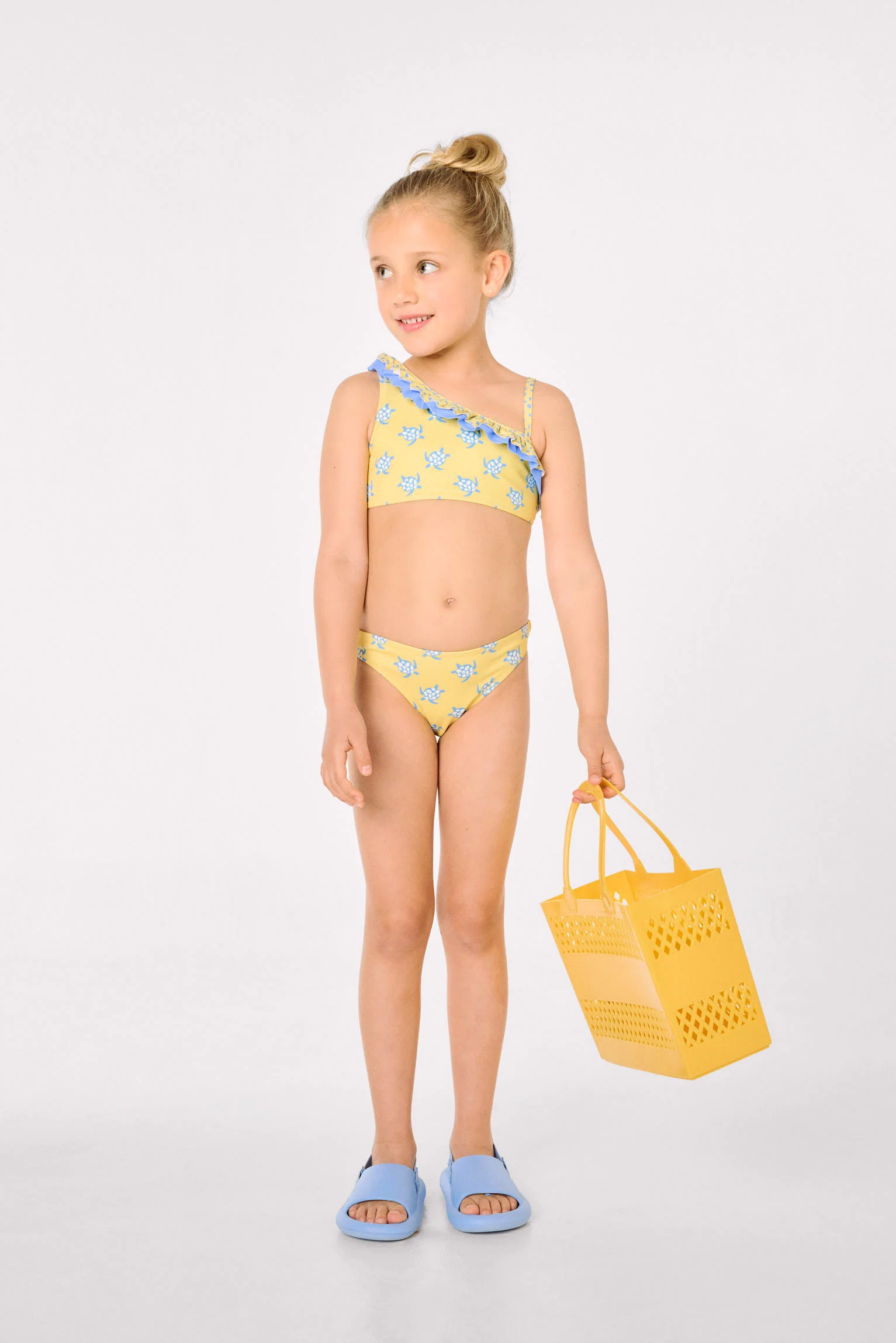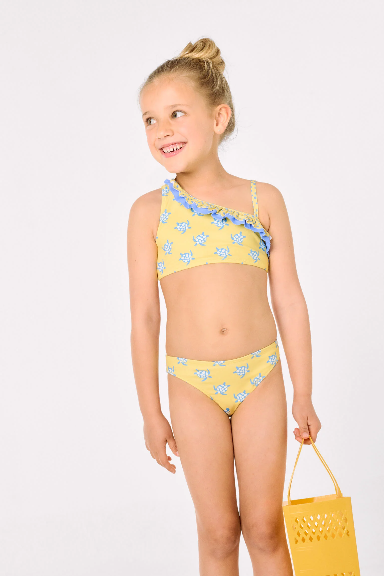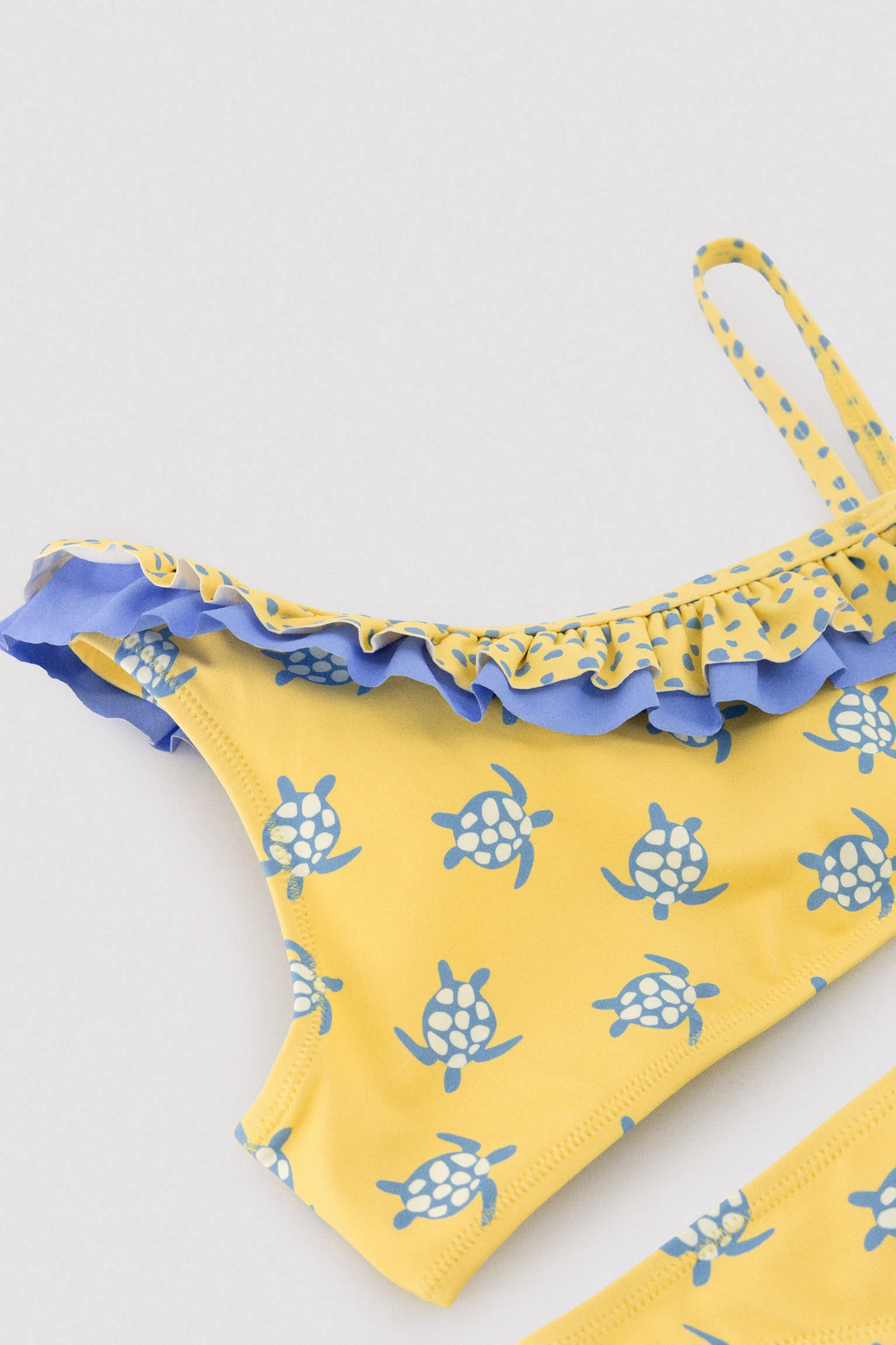 Bikini per bambina con stampa tartaruga e doppio volant sulla parte superiore. Un design asimmetrico con dettagli a contrasto nelle stampe tartaruga e pois.