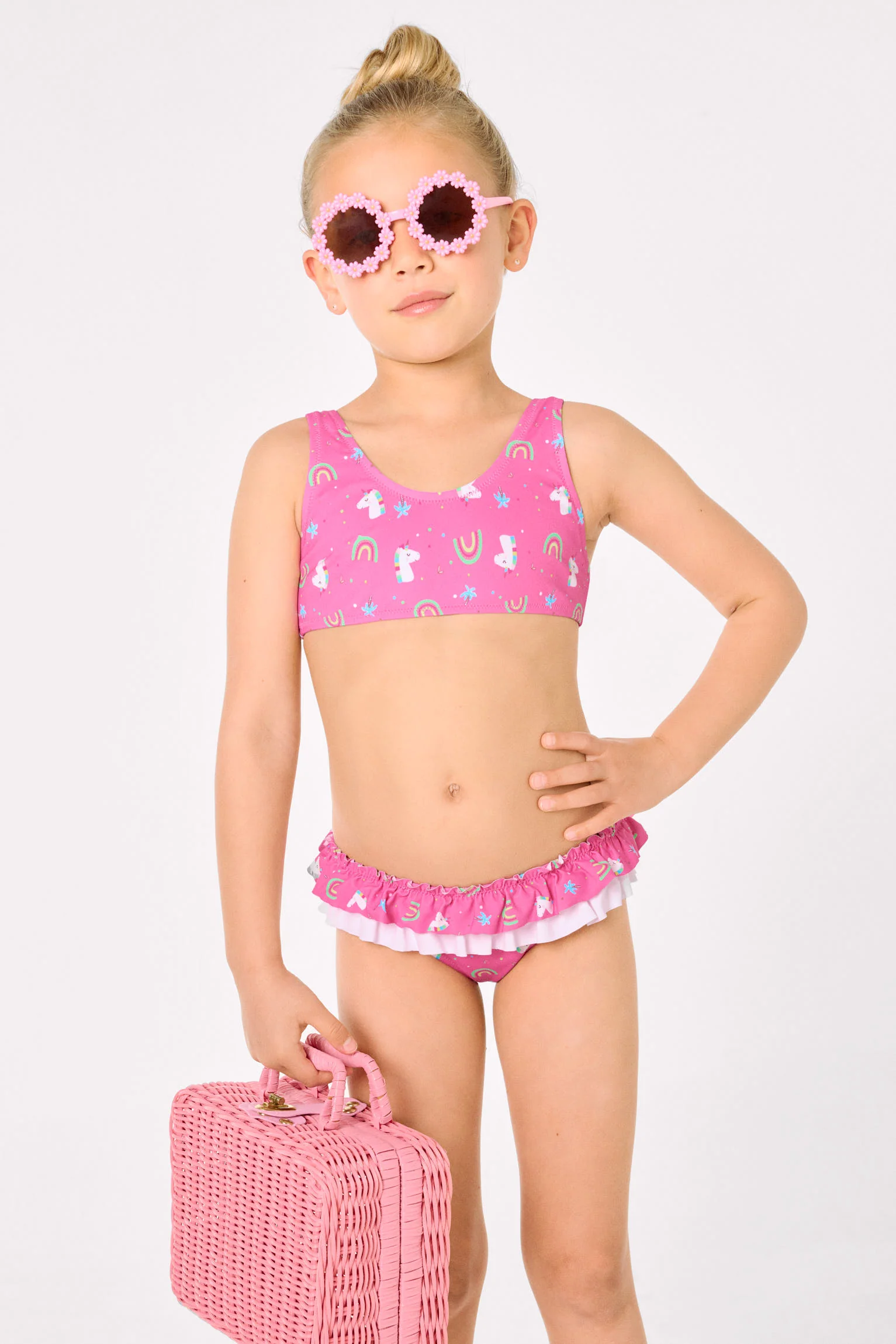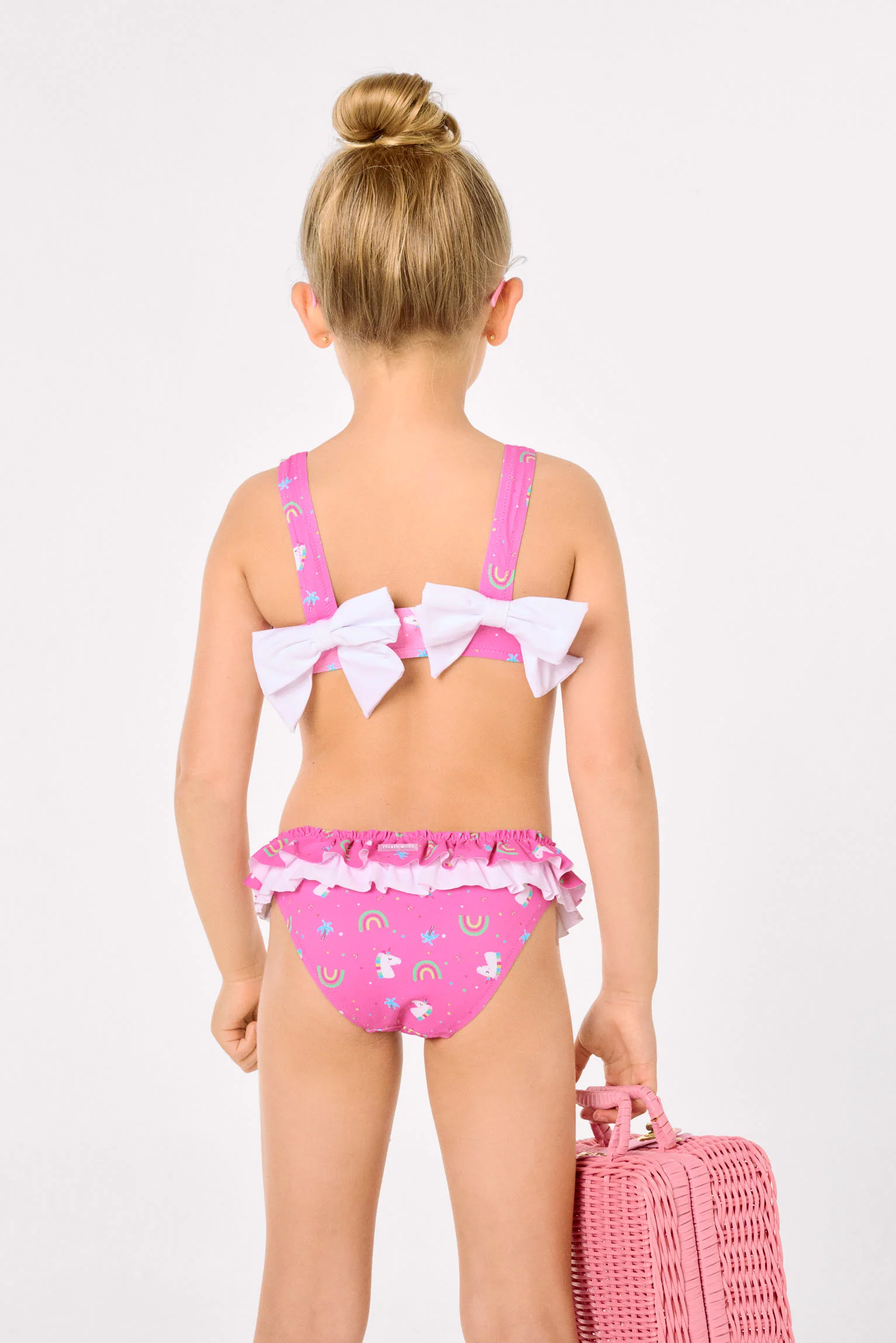 Bikini da bambina con volant e fiocco, stampa unicorno
