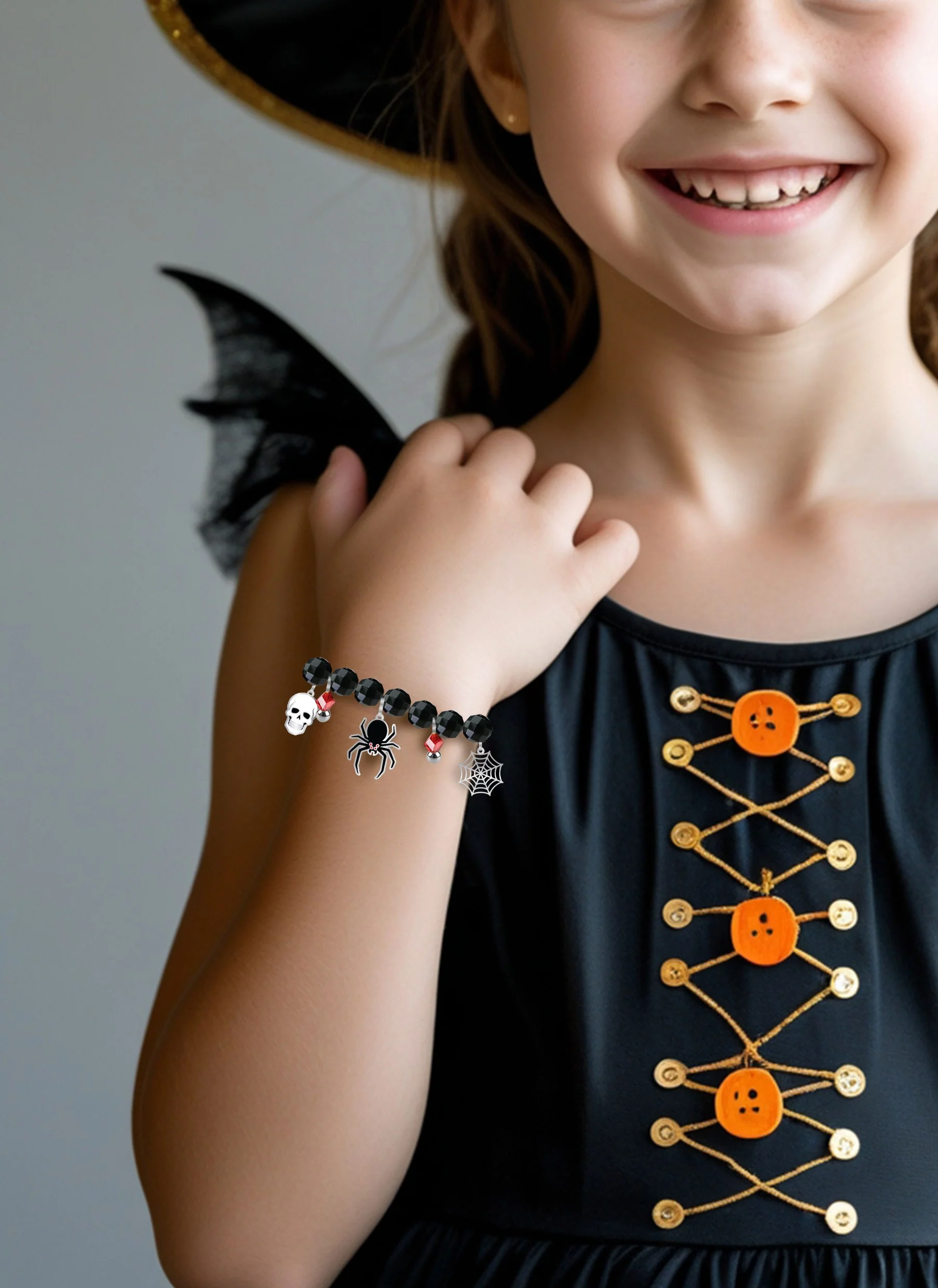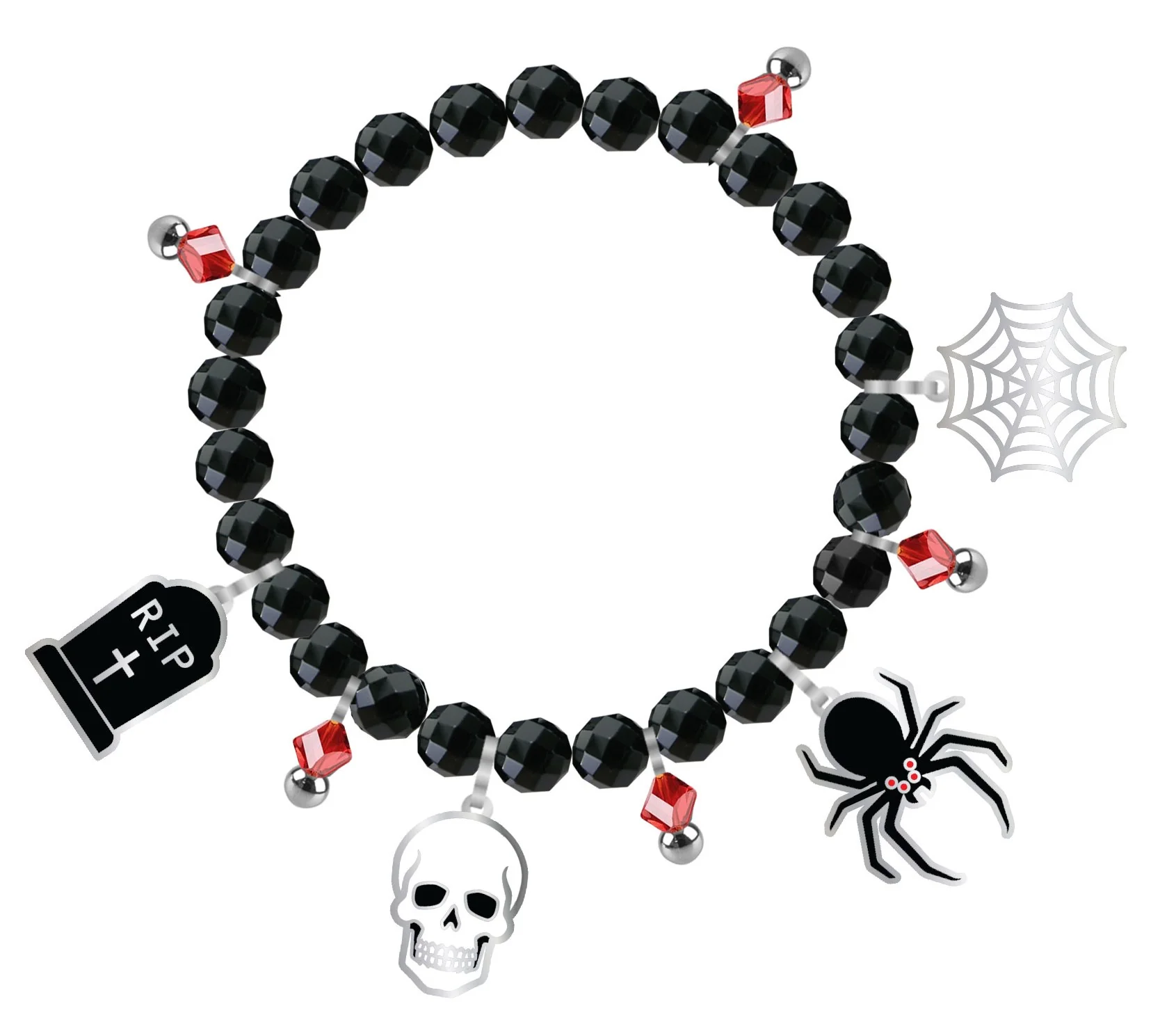 Stai cercando un braccialetto per la tua festa di Halloween? Con il braccialetto con palline nere e charm a forma di teschio, lapide, ragno e ragnatela avrai l’accessorio perfetto per il tuo costume di Halloween.