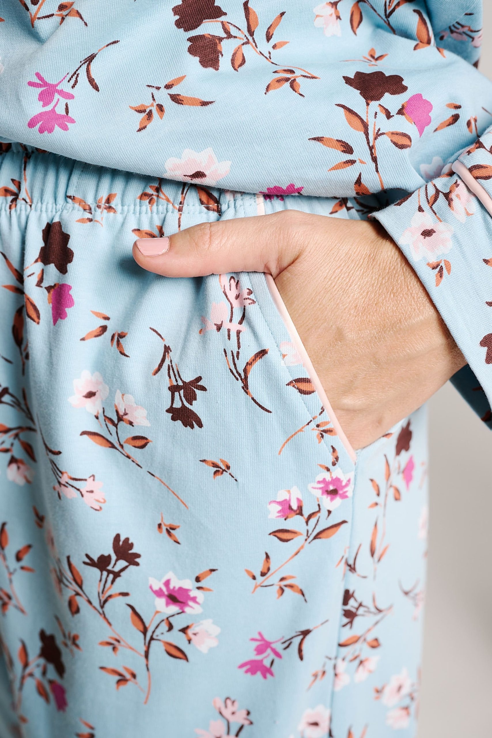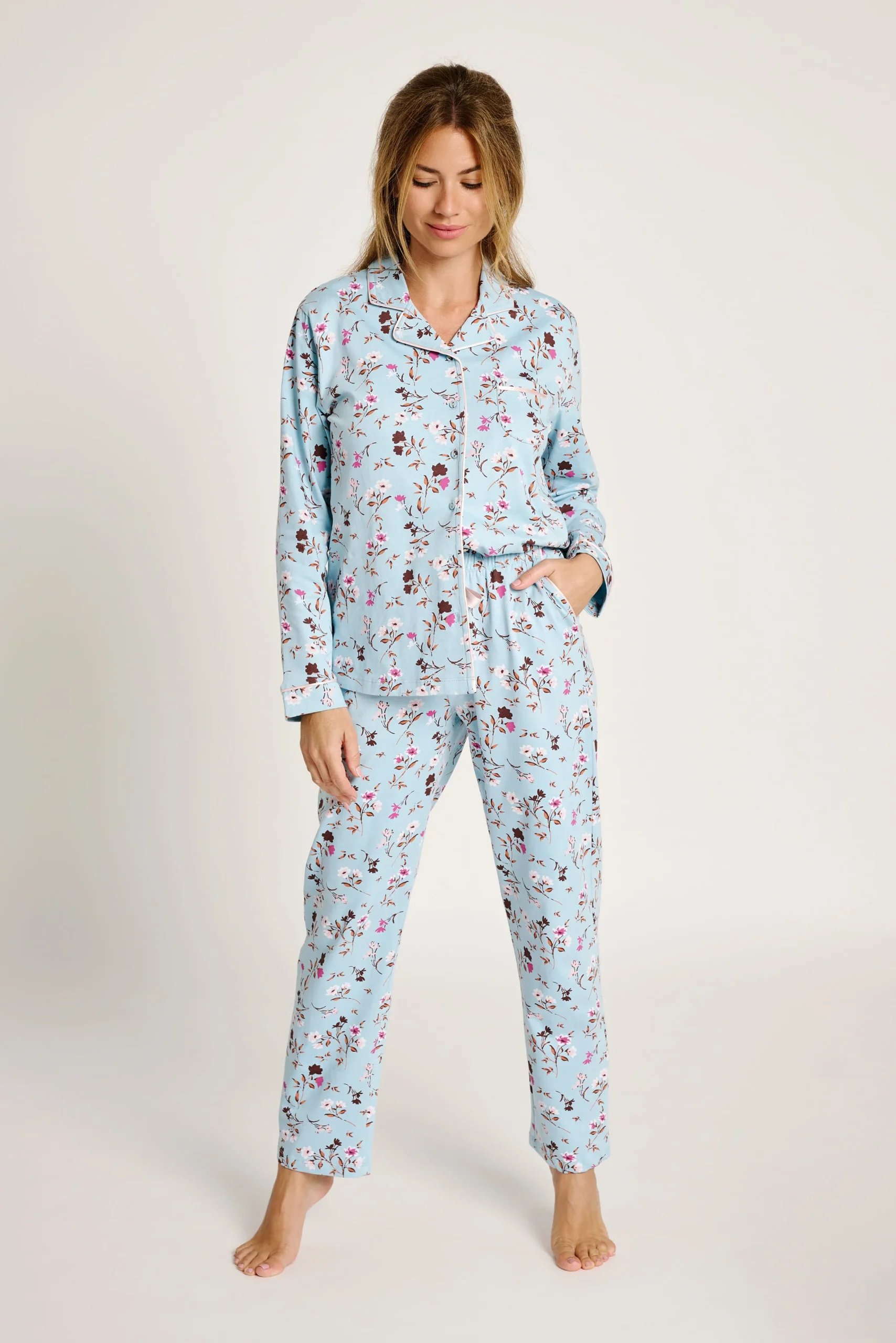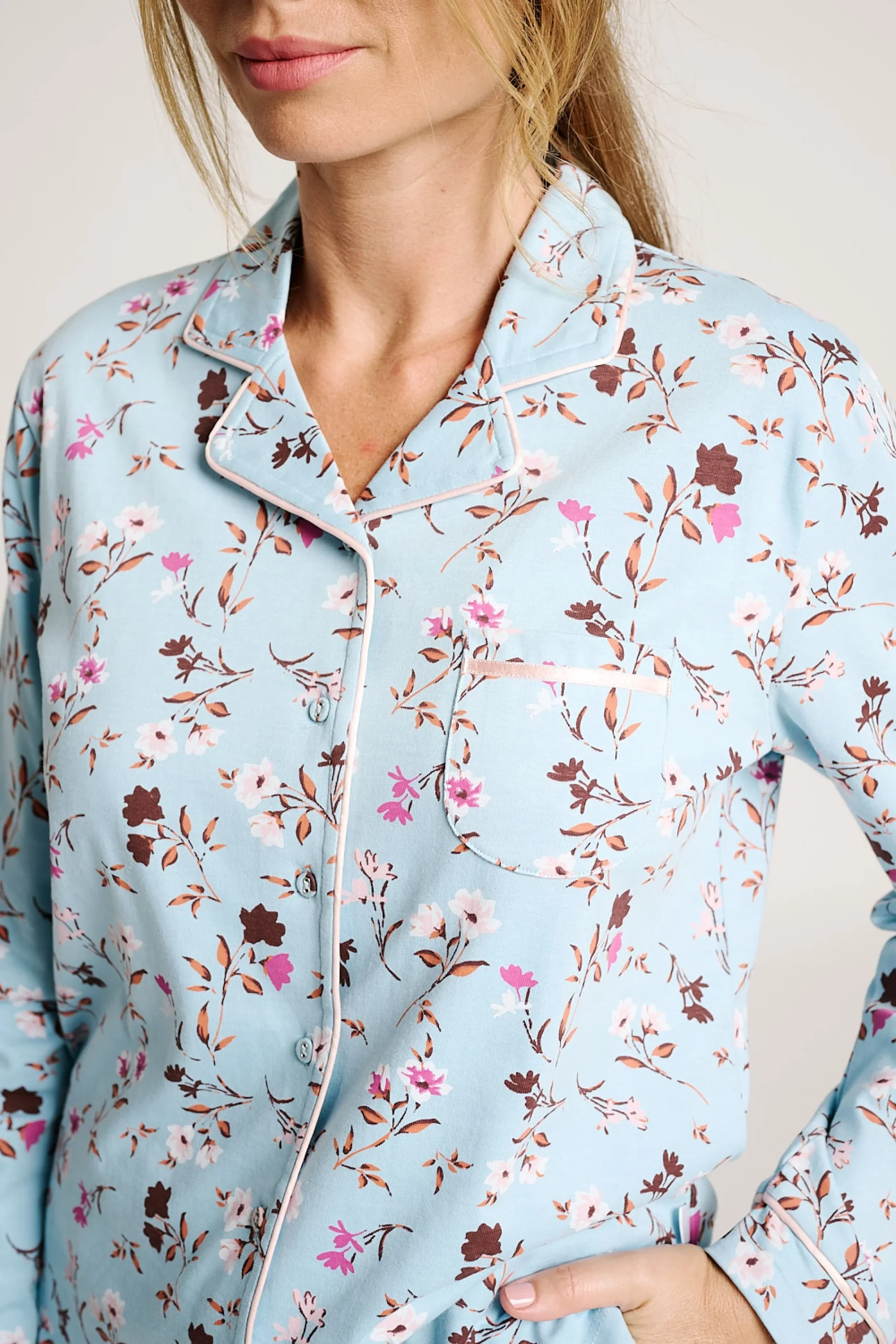 Pigiama lungo in morbido cotone con camicia abbottonata e pantaloni coordinati, entrambi con stampa floreale nei toni del rosa e del marrone su sfondo blu. Vestibilità comoda e leggera, ideale per dormire o rilassarsi a casa.