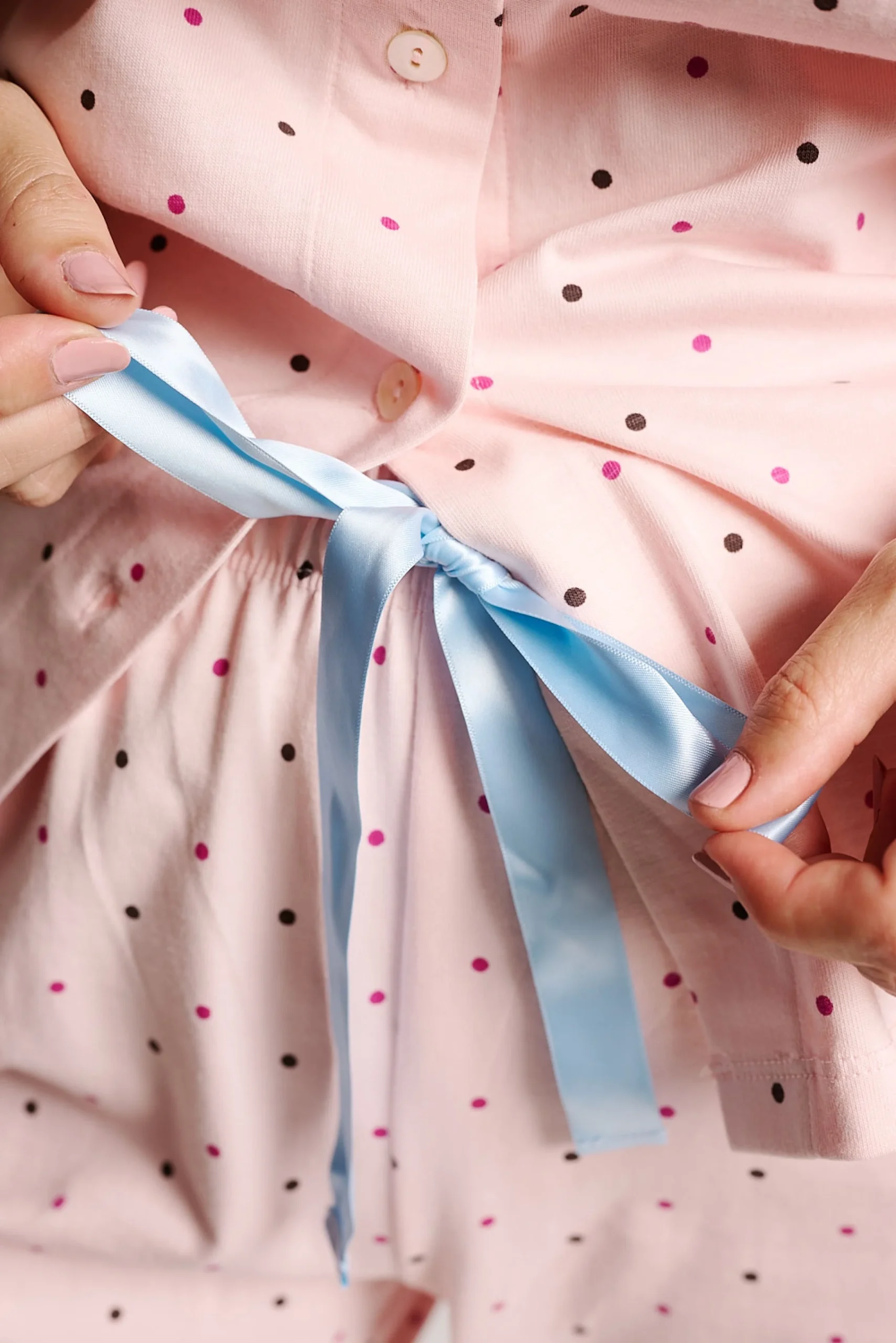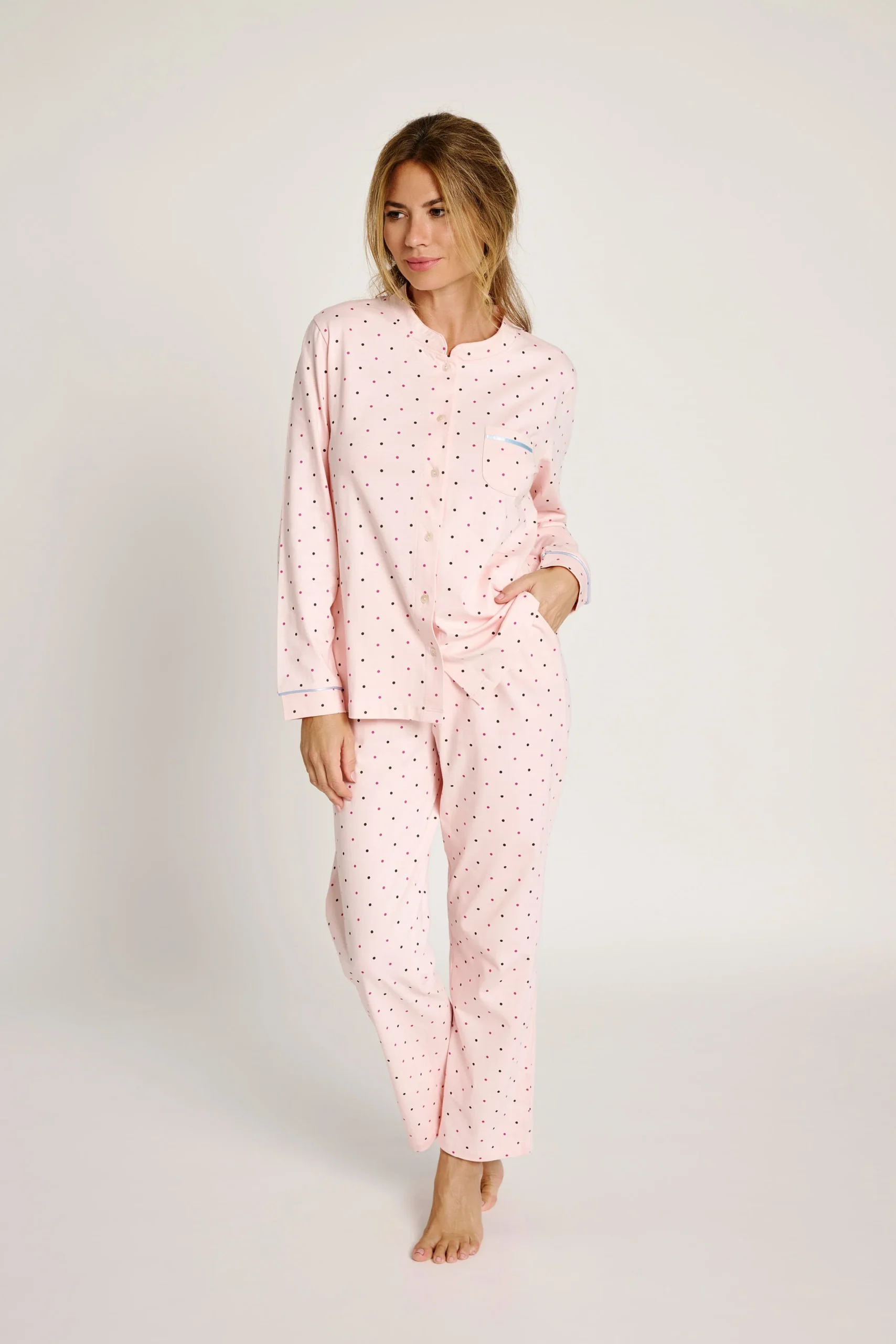Pigiama in morbido cotone rosa chiaro con stampa a pois in diversi colori. T-shirt a maniche lunghe con chiusura frontale a bottoni e taschino sul petto. Pantaloni lunghi abbinati, comodi e leggeri, ideali per dormire o rilassarsi in casa.