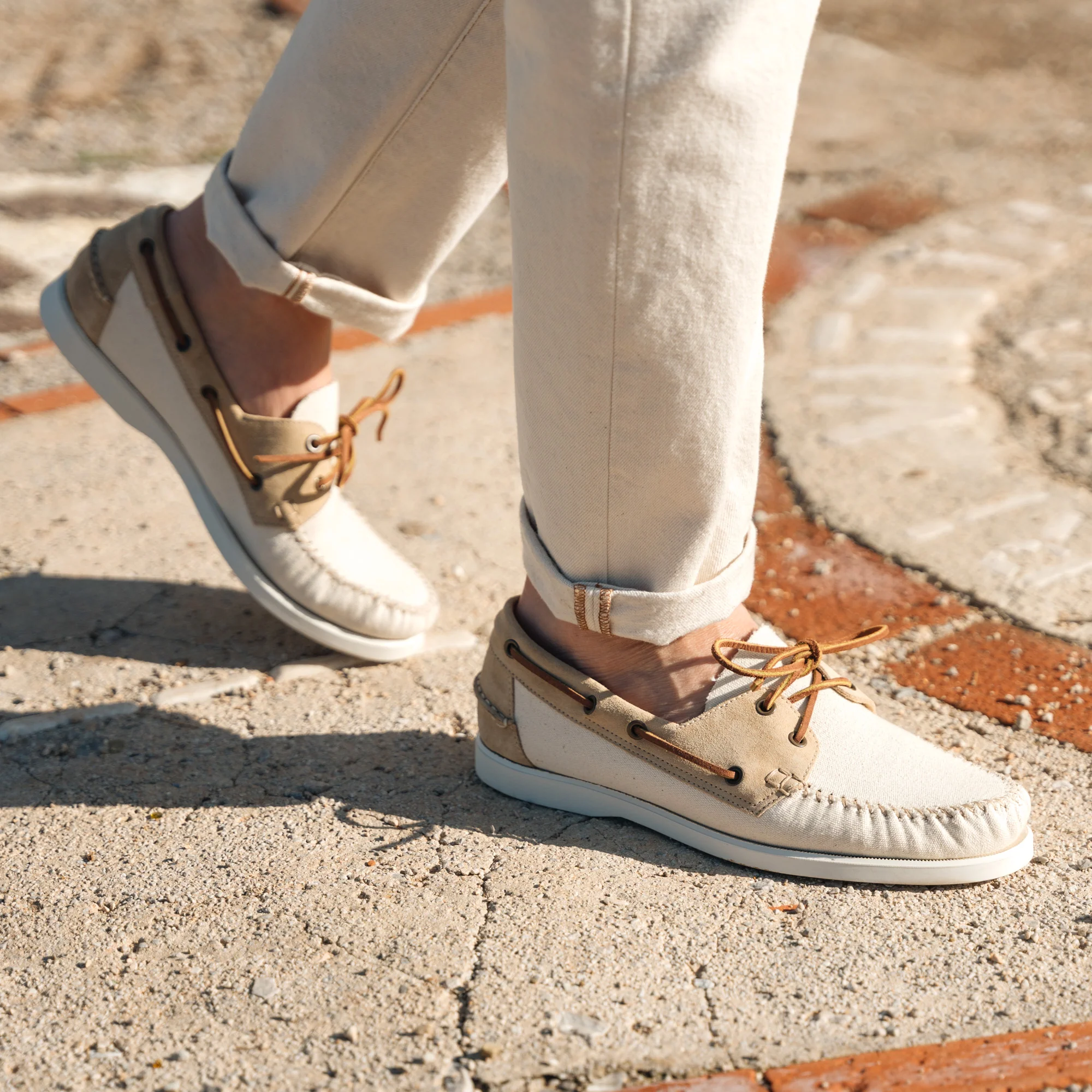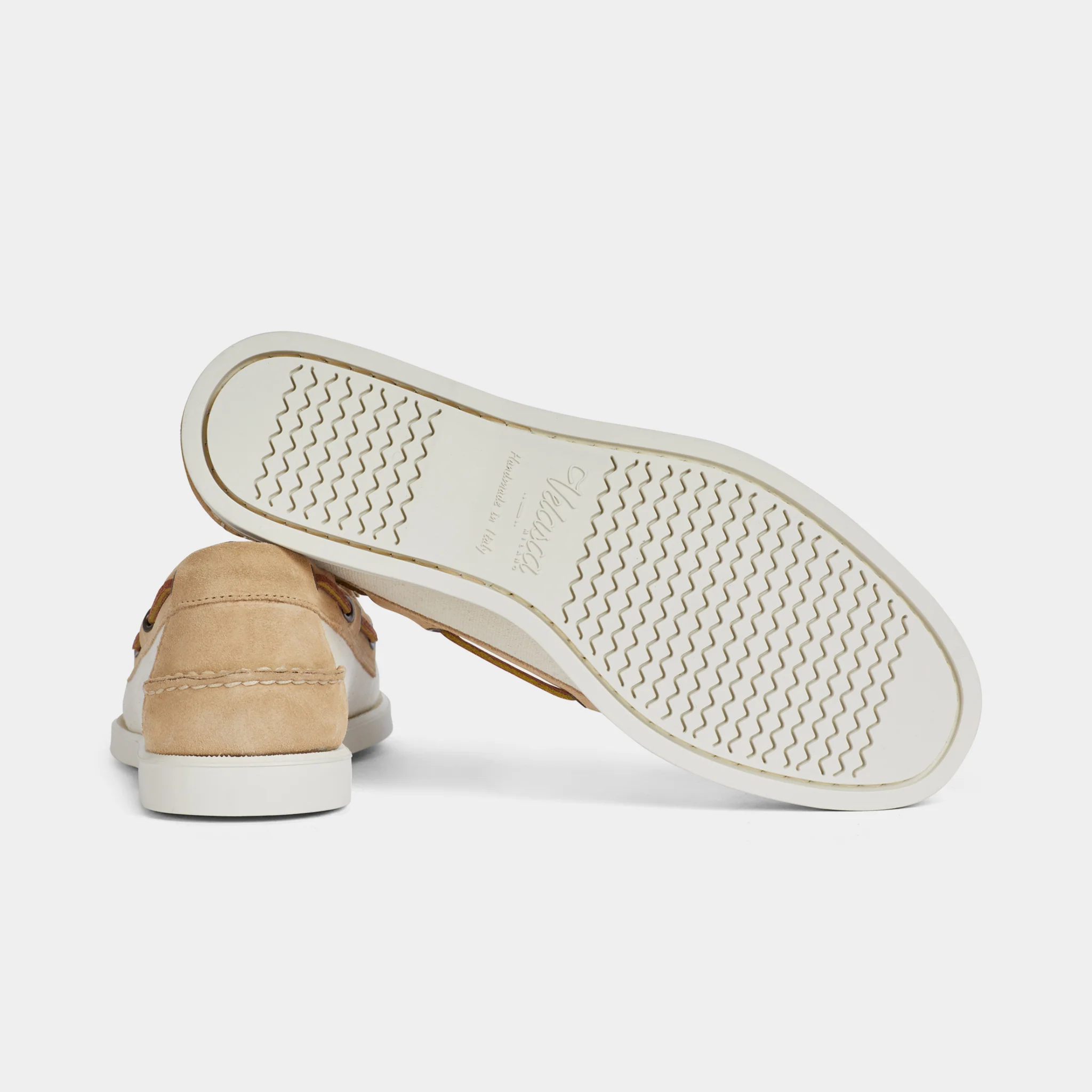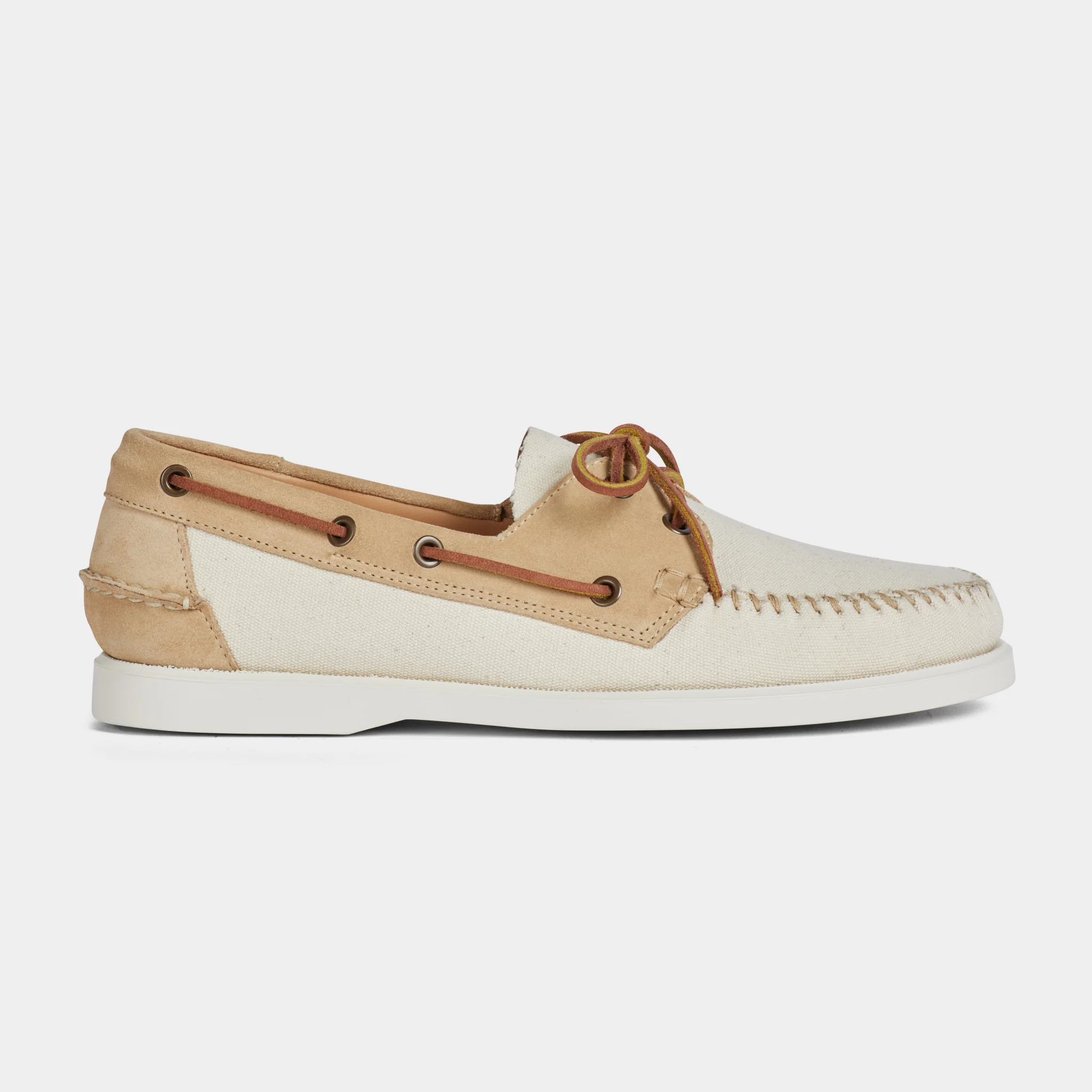 Le nostre scarpe da barca della tradizione velista, in pelle scamosciata con inserti in tessuto. Fatte a mano, la vaschetta viene cucita con ago e filo, come una volta. In panna e beige, i colori entrano in sintonia tra le sfumature, creando un effetto vissuto. La fodera interna in pelle liscia sostiene il tessuto, una tecnica artigianale che serve a mantenere la forma nel tempo.