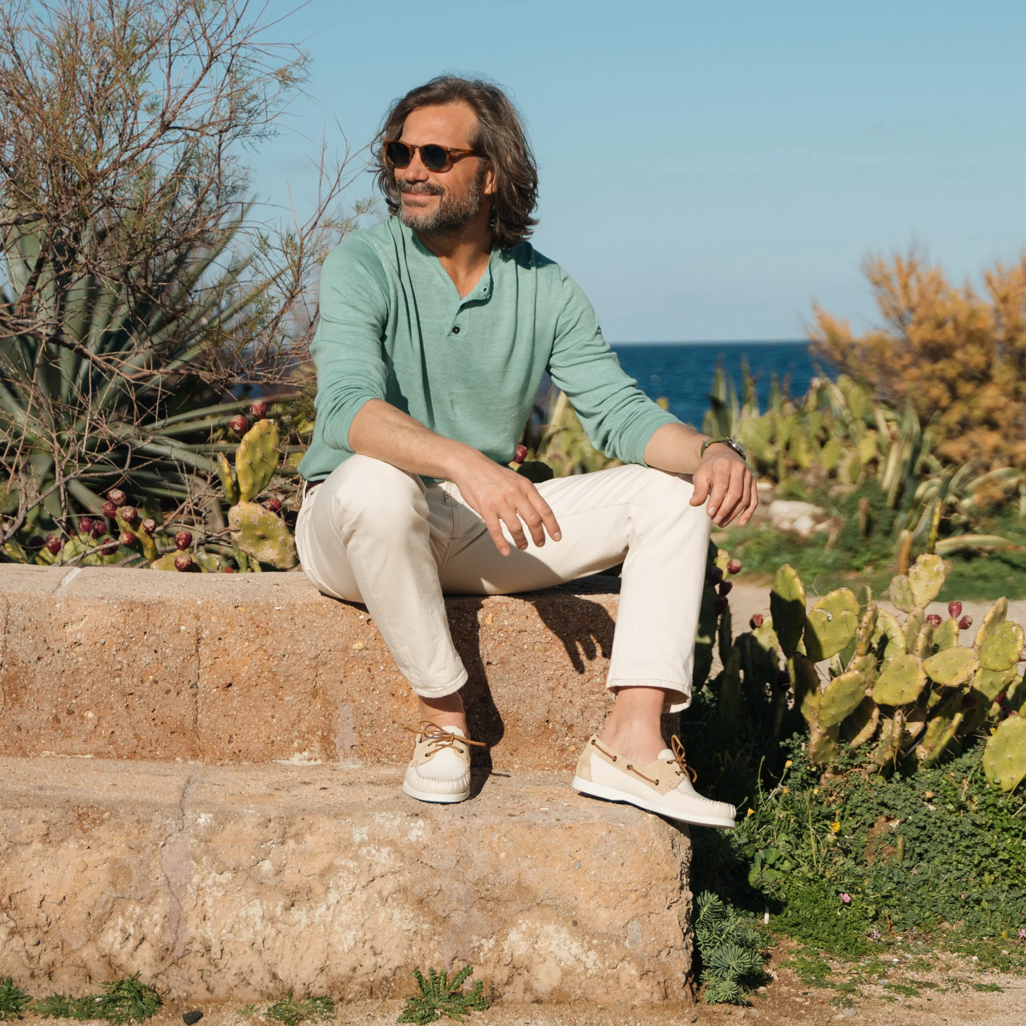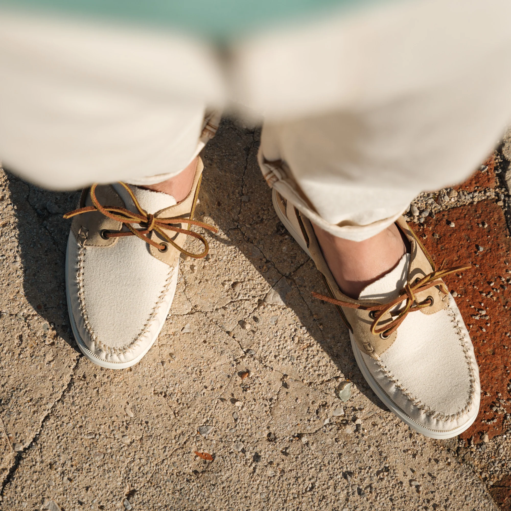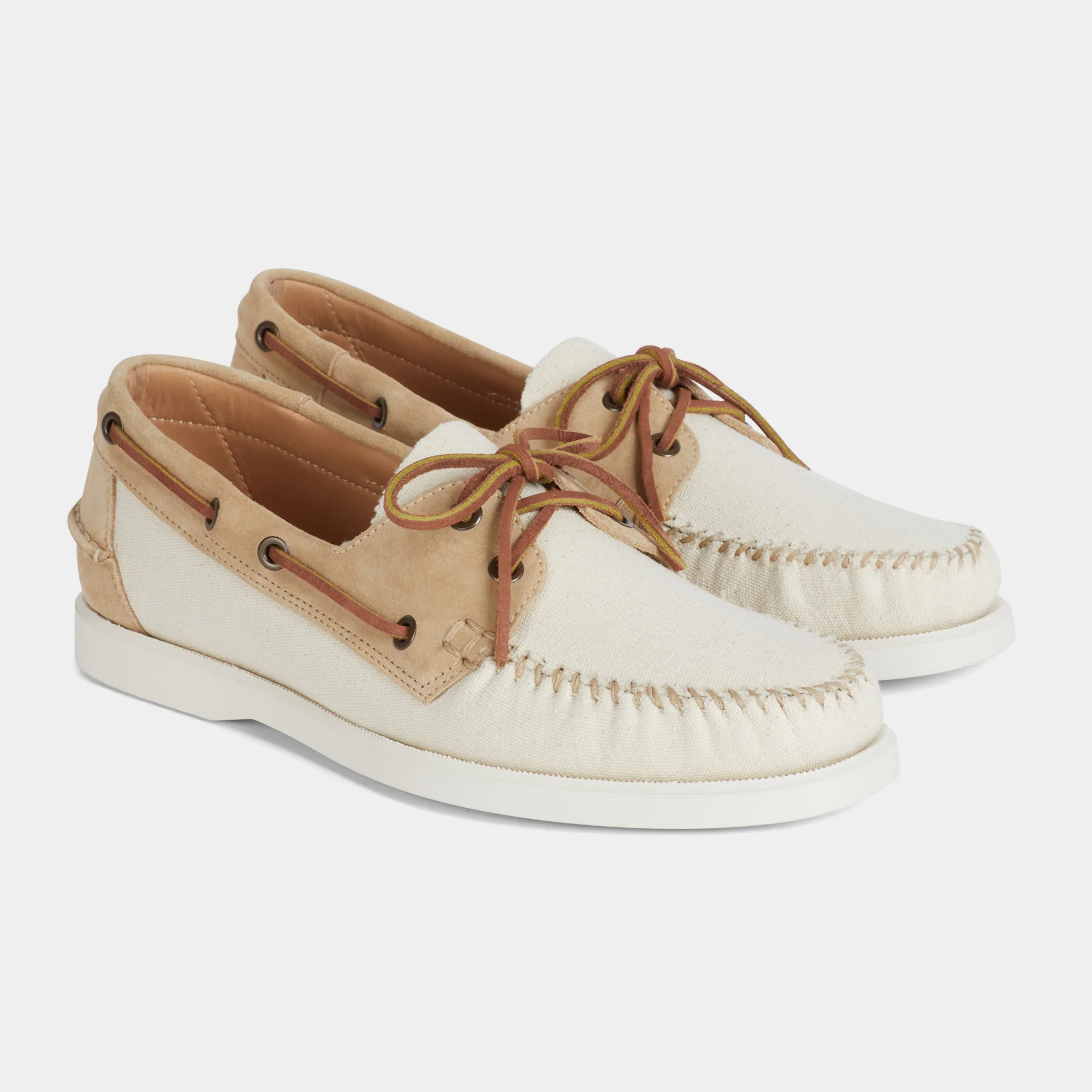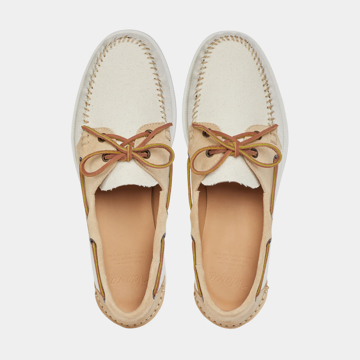 Le nostre scarpe da barca della tradizione velista, in pelle scamosciata con inserti in tessuto. Fatte a mano, la vaschetta viene cucita con ago e filo, come una volta. In panna e beige, i colori entrano in sintonia tra le sfumature, creando un effetto vissuto. La fodera interna in pelle liscia sostiene il tessuto, una tecnica artigianale che serve a mantenere la forma nel tempo.