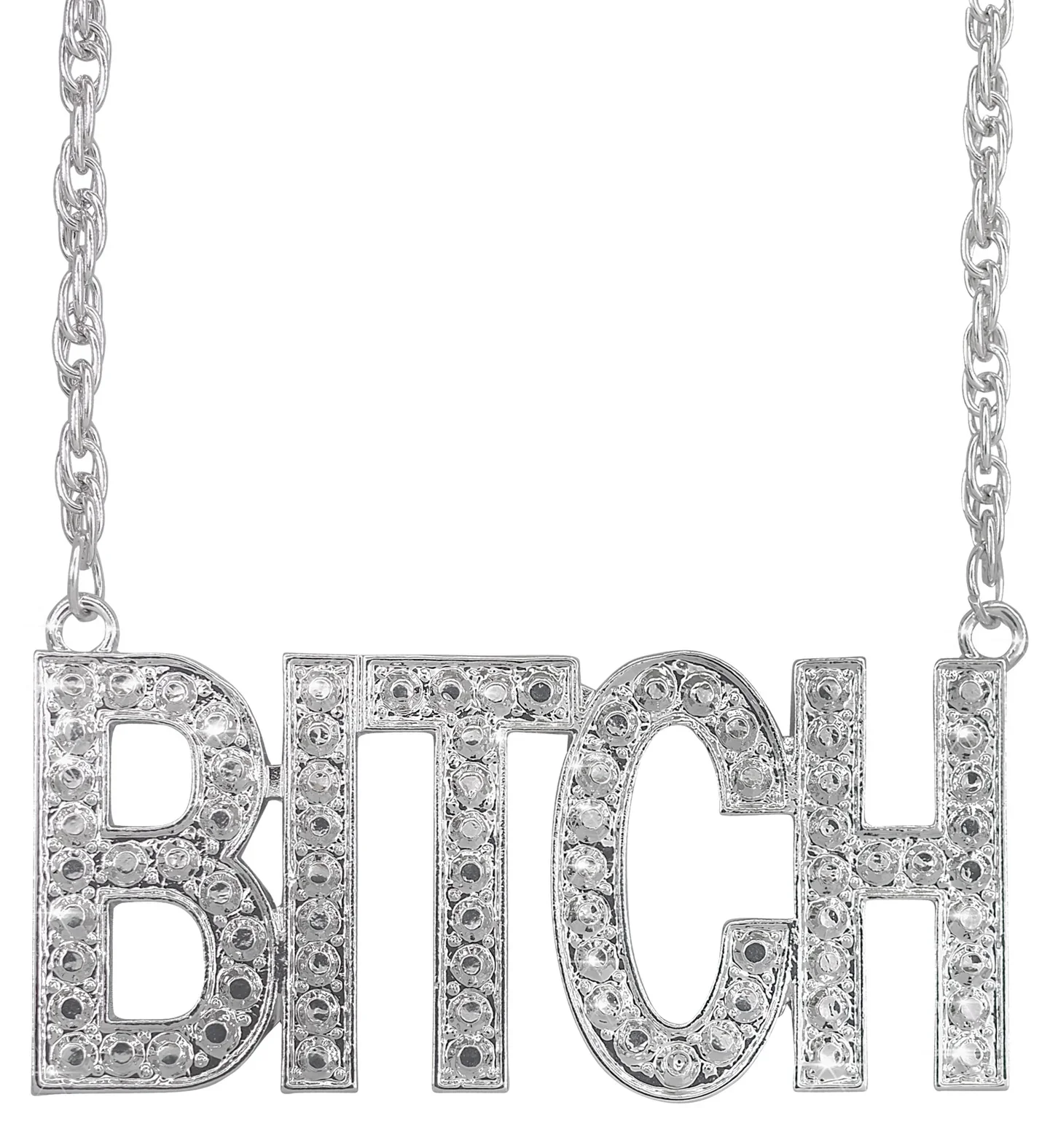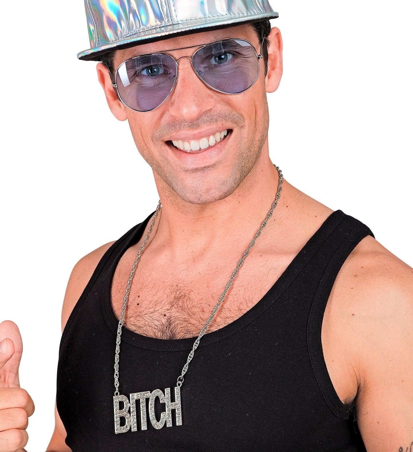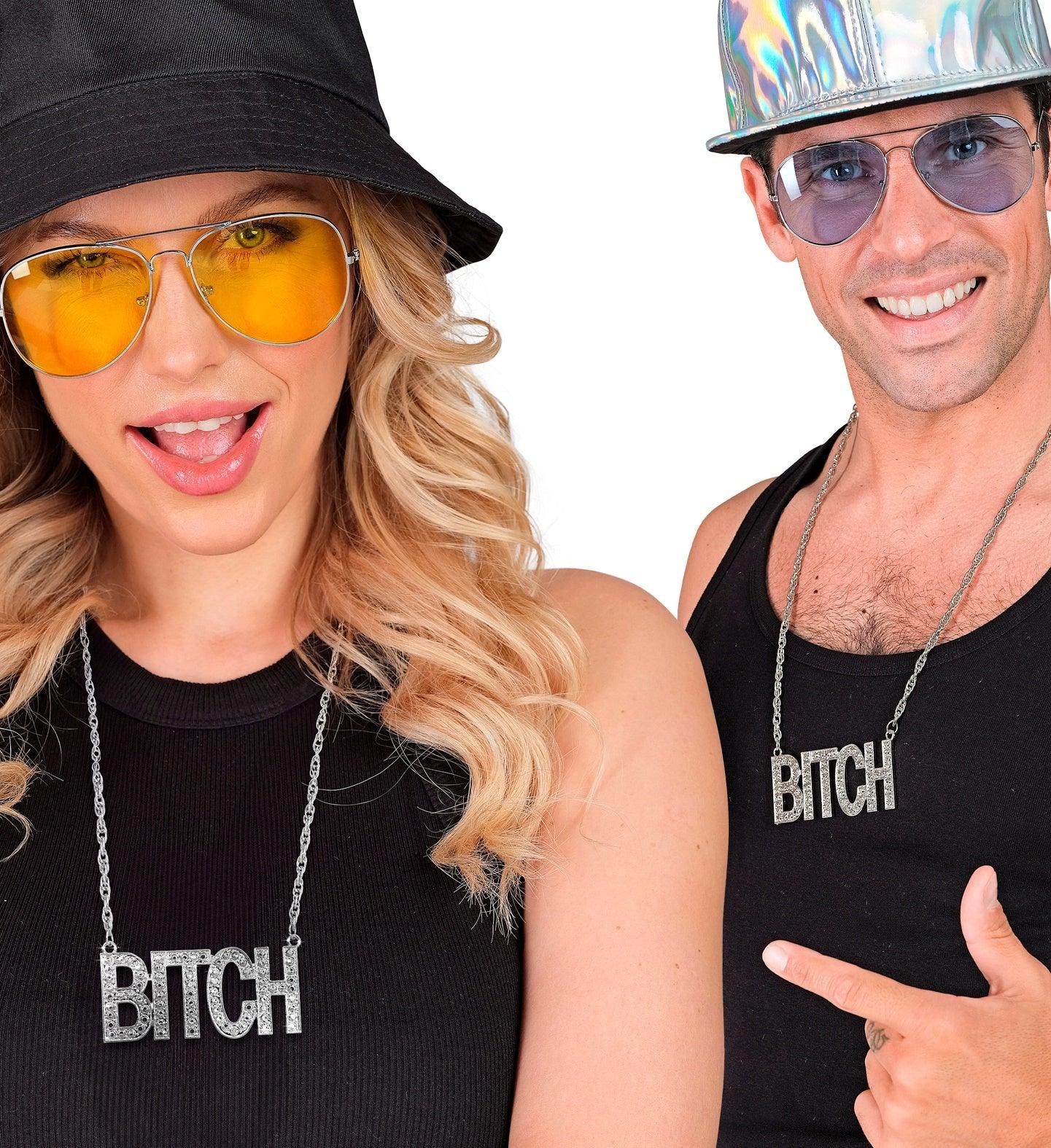 Stai cercando una collana originale per il tuo costume? Con la catena argentata con ciondolo con la parola BITCH decorata con pietre di strass avrai l’accessorio perfetto per travestirti come le famose stelle della musica e cantanti di rap, hip-hop e trap e trionferai alla tua festa in maschera.