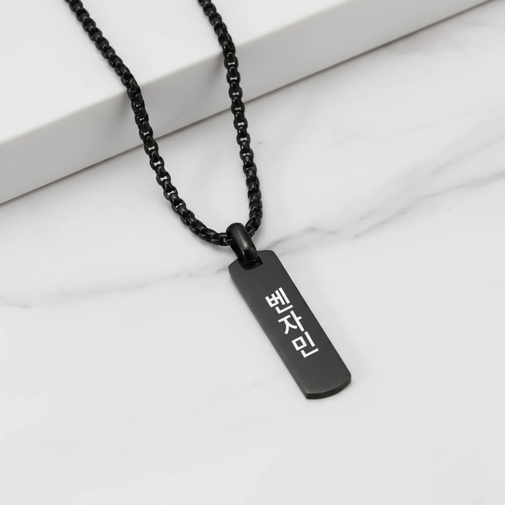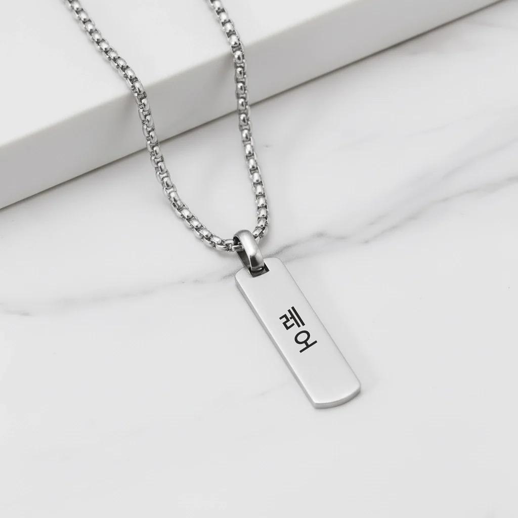 Collana personalizzata con incisione in alfabeto coreano (Hangul). Un gioiello maschile moderno, elegante e ricco di significato. Ideale come regalo originale per compleanni, Natale o occasioni speciali.
