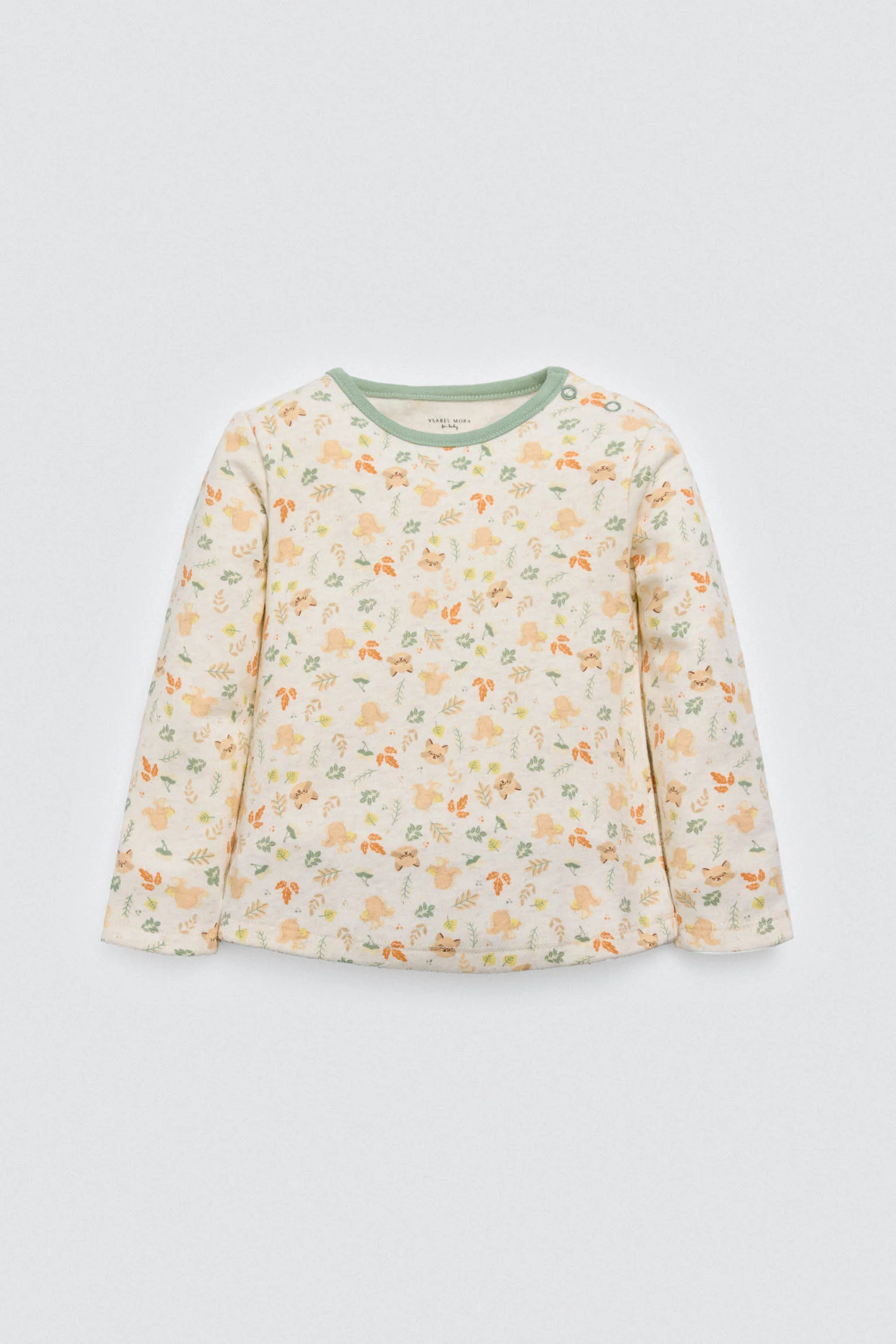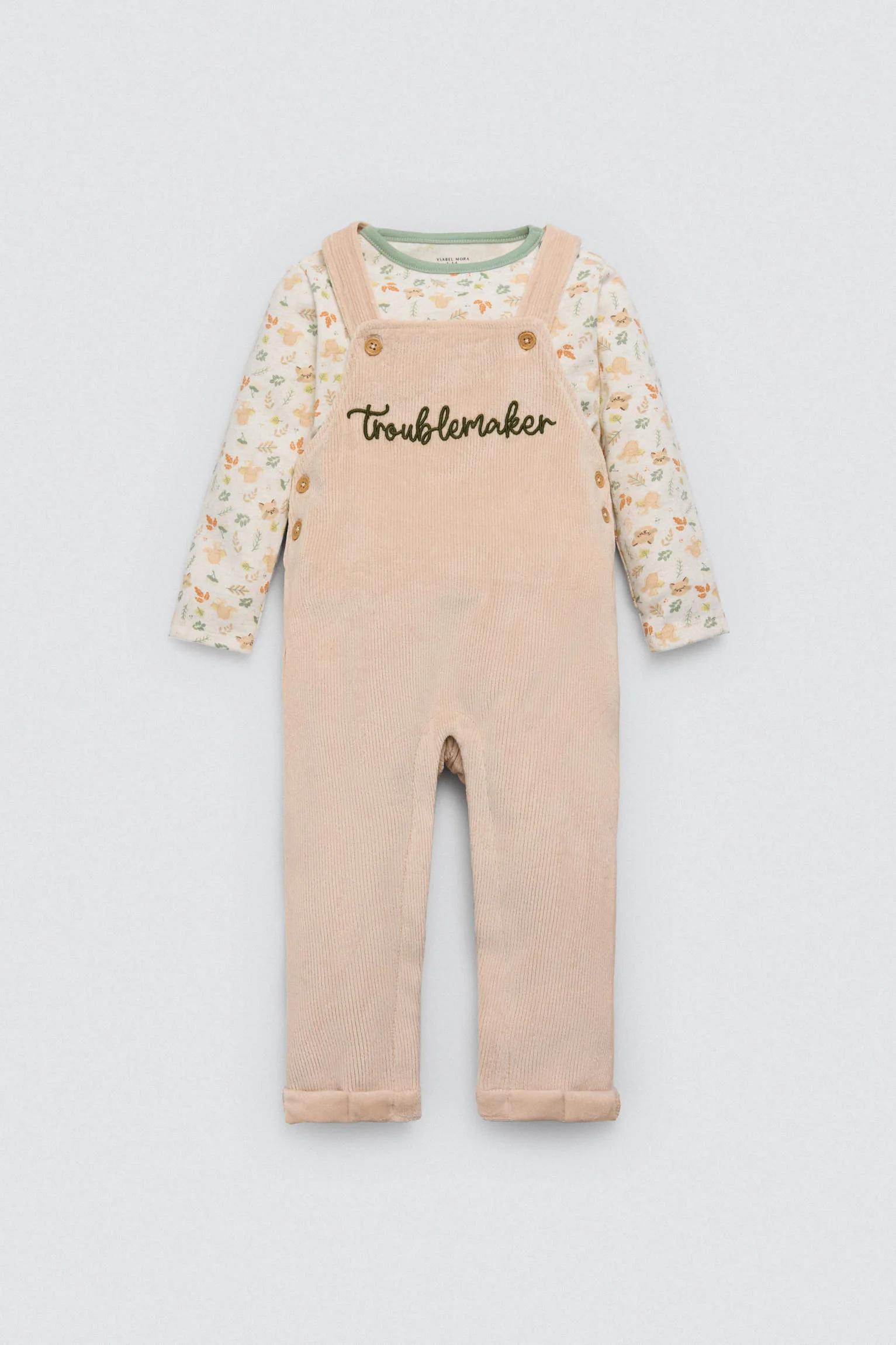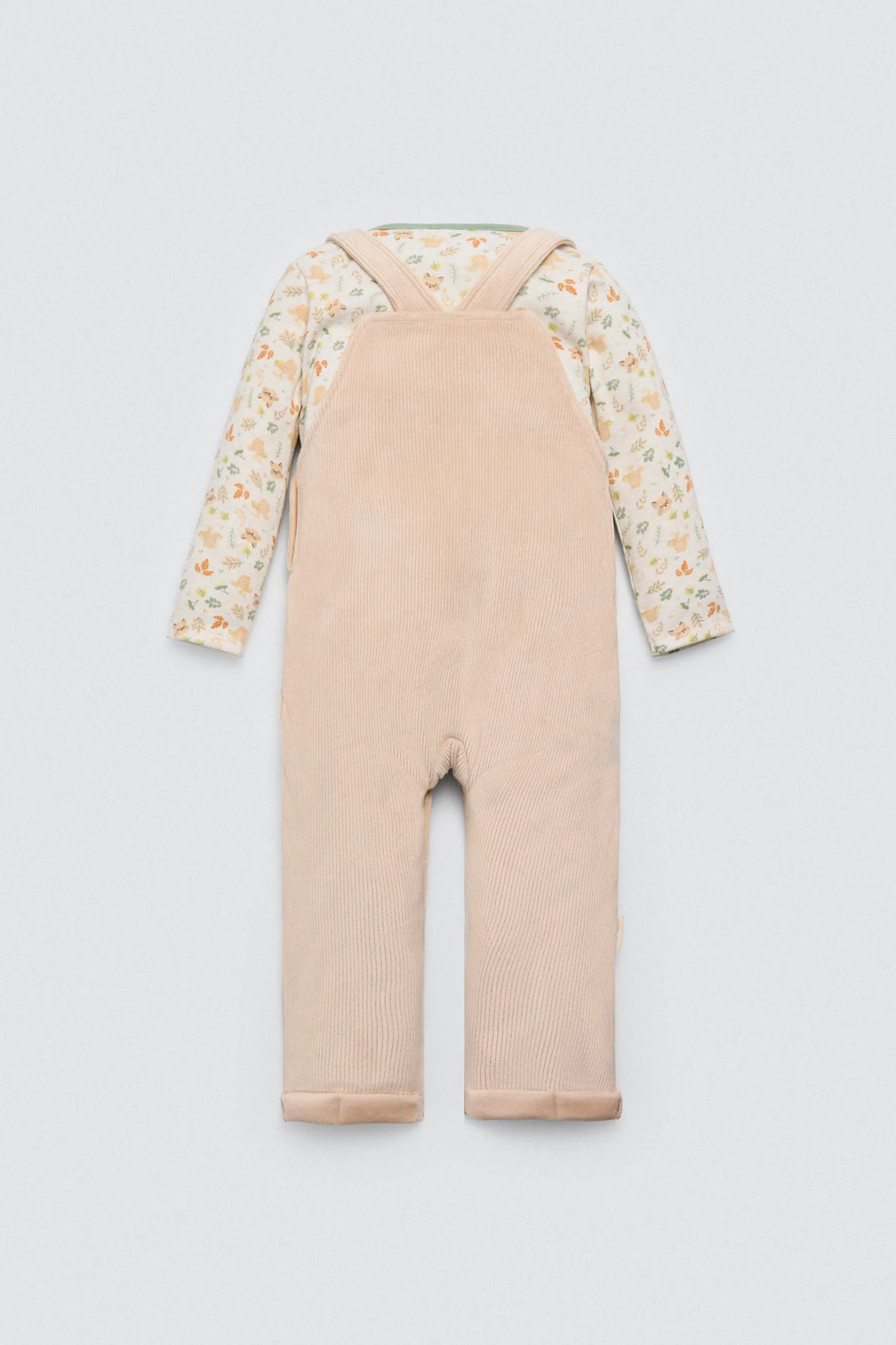 Set da 2 pezzi per neonato in cotone naturale. Include una maglietta a maniche lunghe con stampa autunnale e una salopette lunga con interno in pile. Un look caldo e dolce per le fresche giornate autunnali.