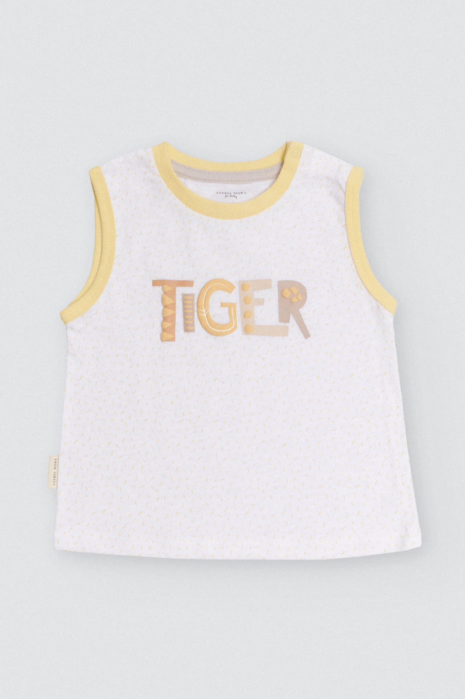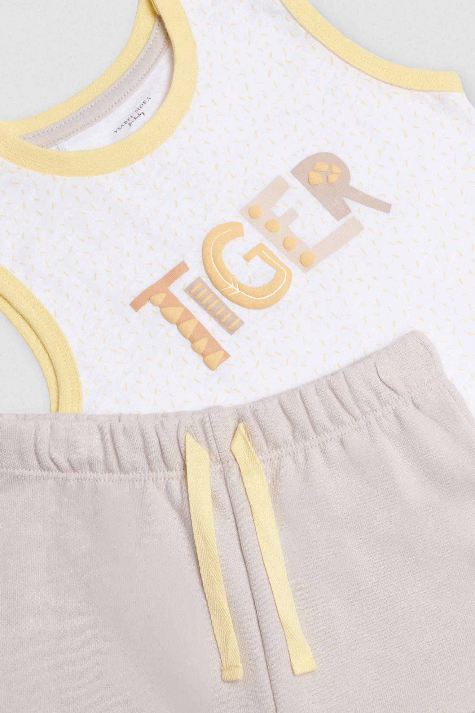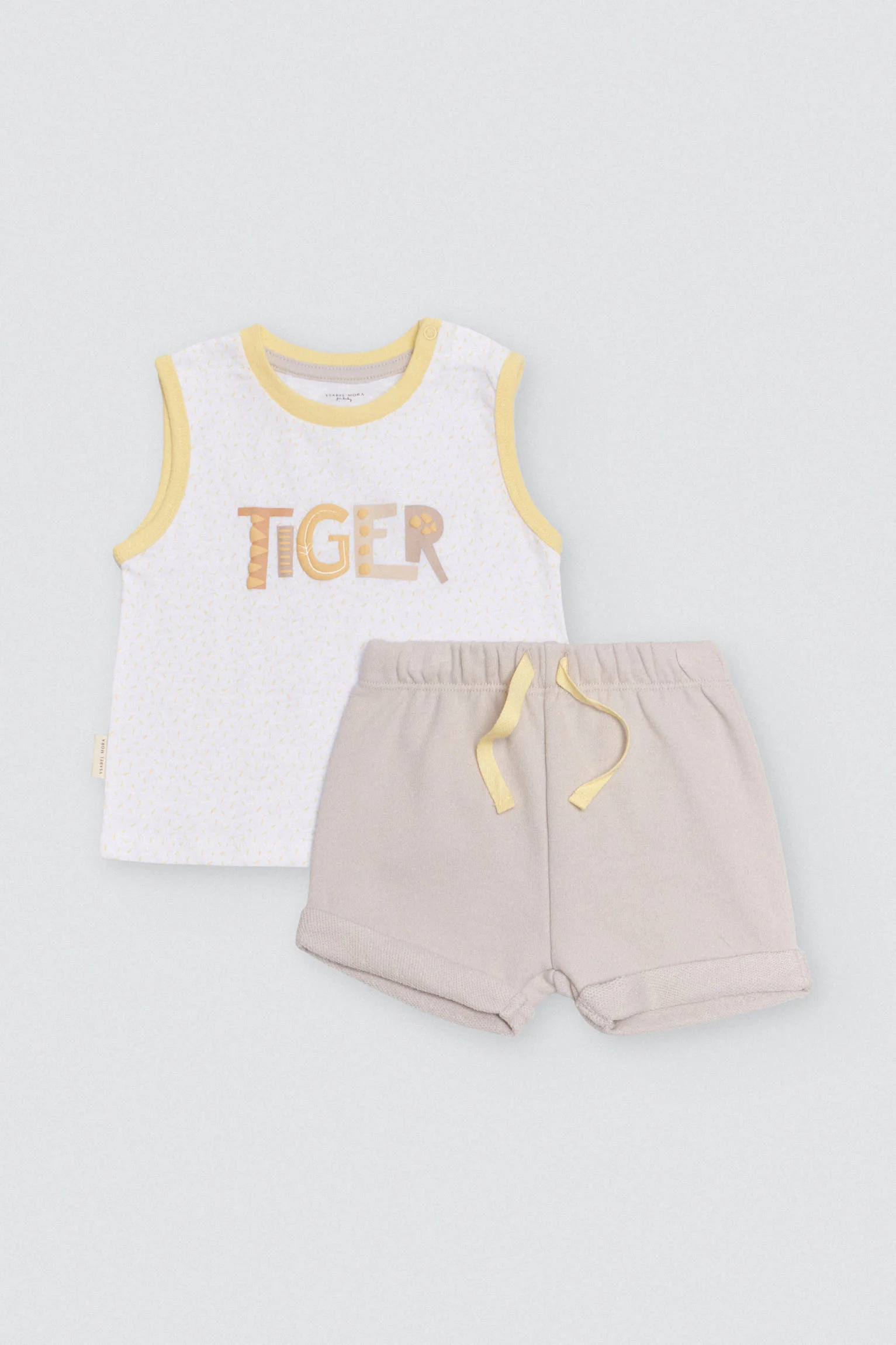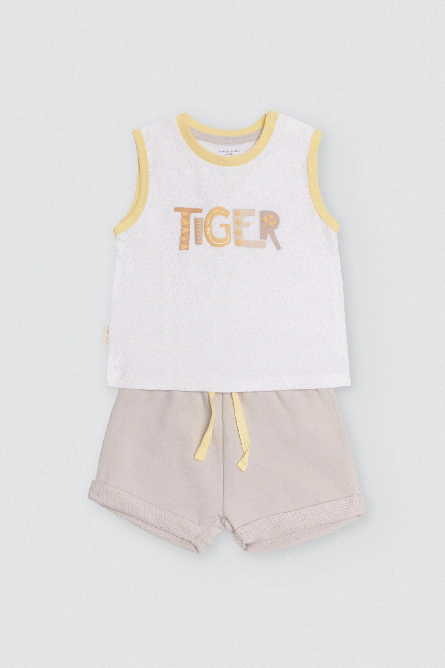 Completo da neonato senza maniche e pantaloncini in cotone naturale. Con questo set il tuo bambino avrà un aspetto perfetto e si sentirà a suo agio a giocare nei pomeriggi estivi. La t-shirt è bianca con stampa fantasia e presenta la scritta “TIGER” con texture al centro. I pantaloncini sono beige, con un fiocco giallo chiaro e si abbinano perfettamente alla t-shirt.
