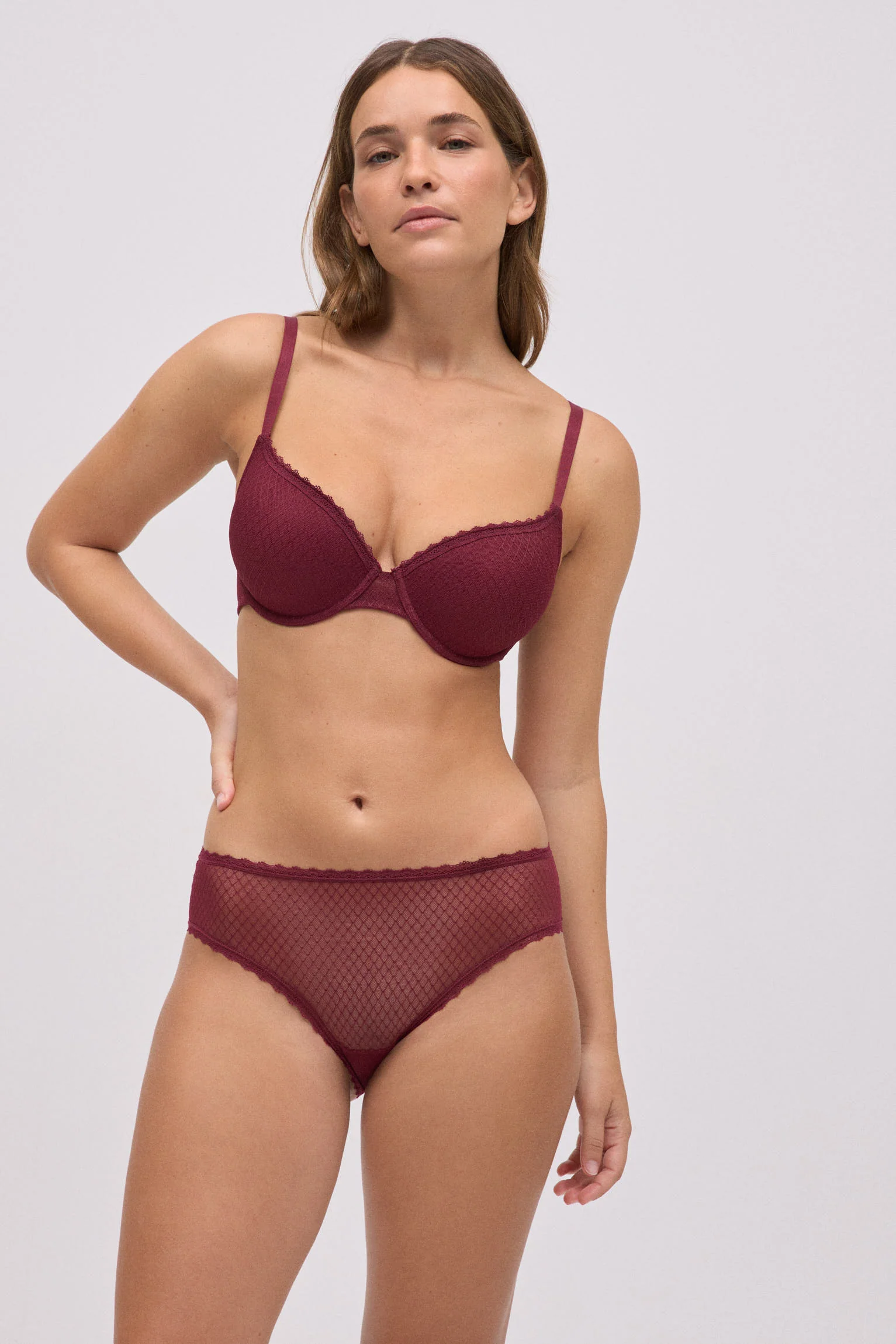 Completo reggiseno e slip midi trasparenti. Reggiseno con ferretto e imbottitura.
