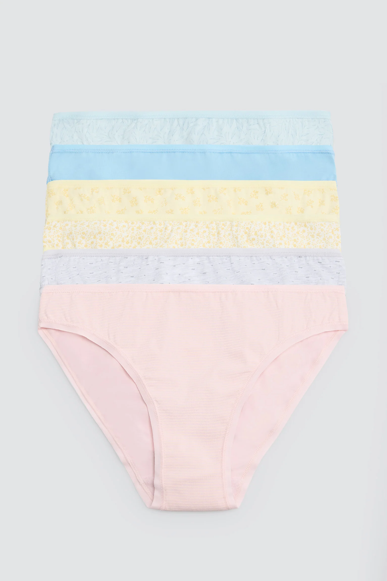 Confezione da 6 slip in cotone da donna con diverse stampe pastello. Con elastico in vita per una vestibilità comoda. Include un paio di ogni stampa.