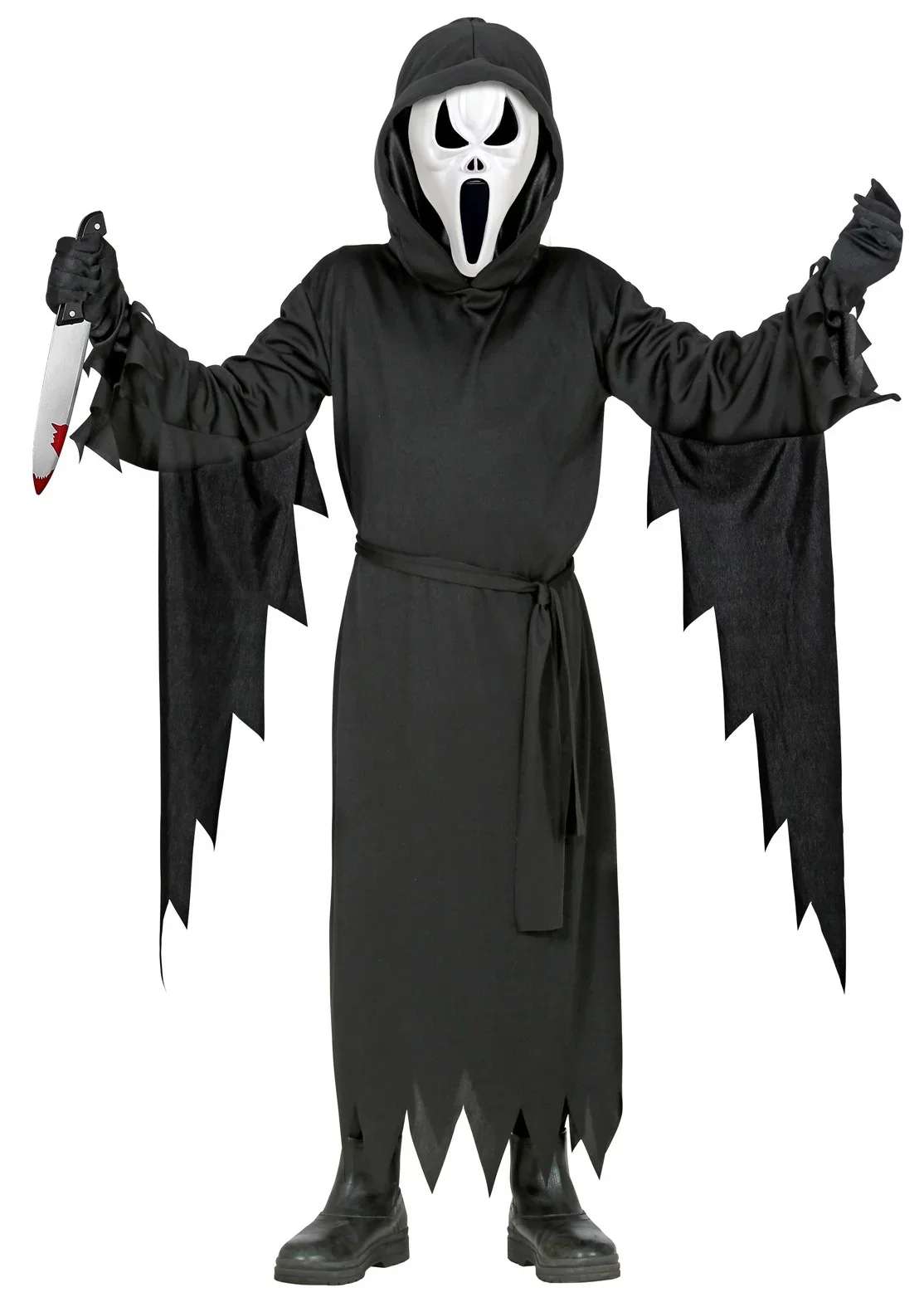 Stai cercando un costume da assassino psicopatico per tuo figlio? Con il costume da assassino di Scream per bambini avrai il vestito perfetto per travestire tuo figlio come l’assassino Ghostface della famosa saga di film horror di “Scream” e sarà il bambino più terrificante della festa di Halloween.