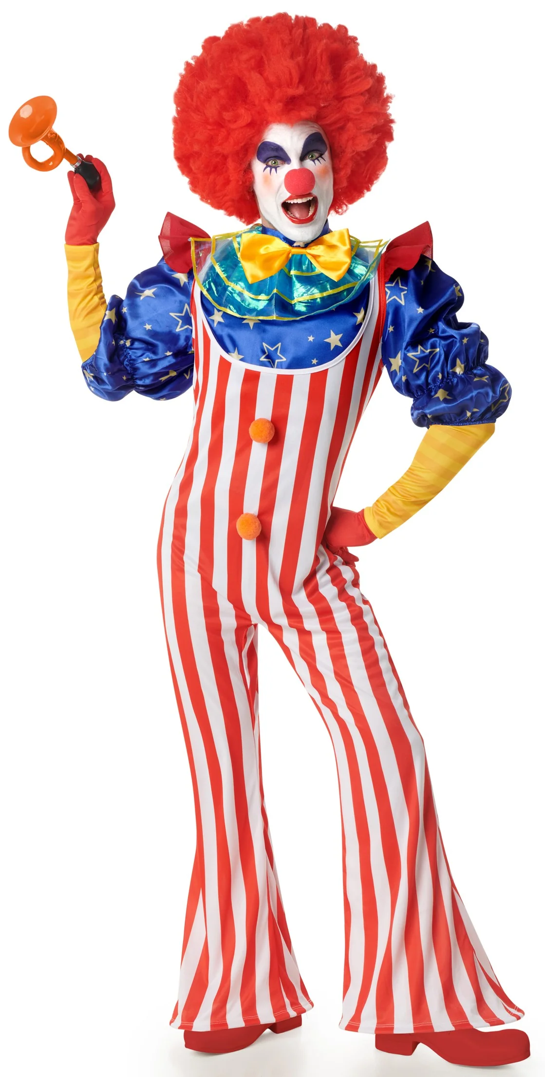 Stai cercando un costume da pagliaccio per la tua festa? Con il costume da pagliaccio americano per adulto avrai il vestito perfetto per travestirti da simpatico pagliaccetto con le barre e le stelle della bandiera degli Stati Uniti e trionferai alla tua festa in maschera.