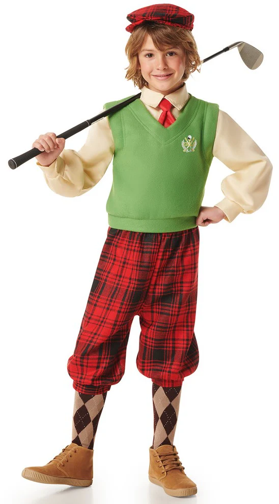 Stai cercando un costume da giocatore di golf per tuo figlio? Con il costume da giocatore di golf per bambino avrai il completo perfetto per travestire tuo figlio come questi sportivi con il loro classico abbigliamento a quadri rossi di tartan scozzese e sarà il bambino più bello della festa in maschera.