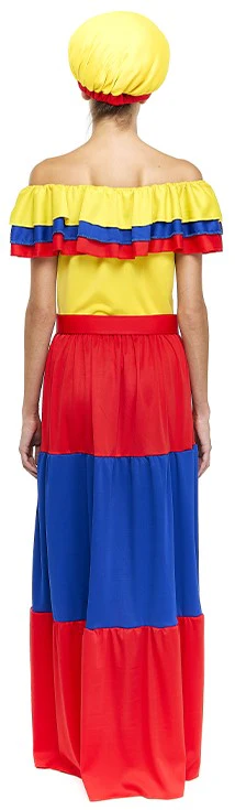 Stai cercando un costume da colombiana per la tua festa? Con il costume da palenquera colombiana per donna nei colori giallo, rosso e blu avrai il vestito perfetto per travestirti con il costume tipico tradizionale di questo paese sudamericano e trionferai alla tua festa in maschera.