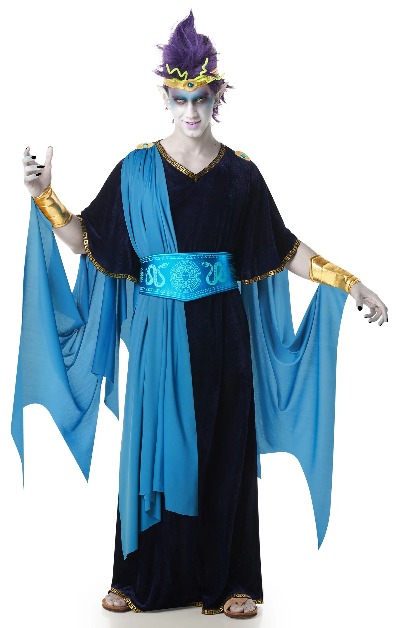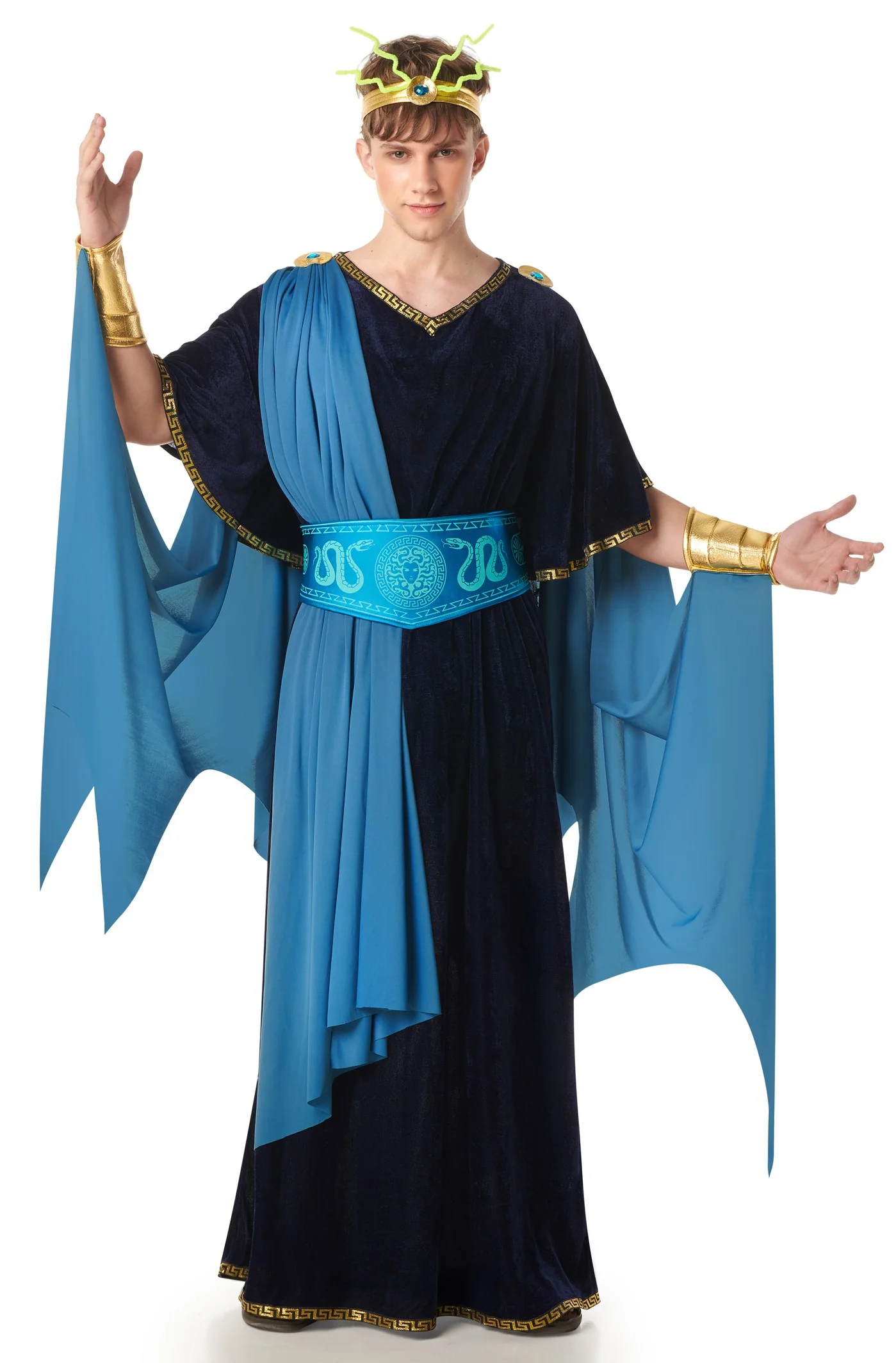 Stai cercando un costume da principe greco per la tua festa? Con il costume da principe greco Medusa per uomo avrai l’abito perfetto per travestirti da elegante principe dell’Antica Grecia con tunica nera e toga blu e ti distinguerai alla festa in maschera.