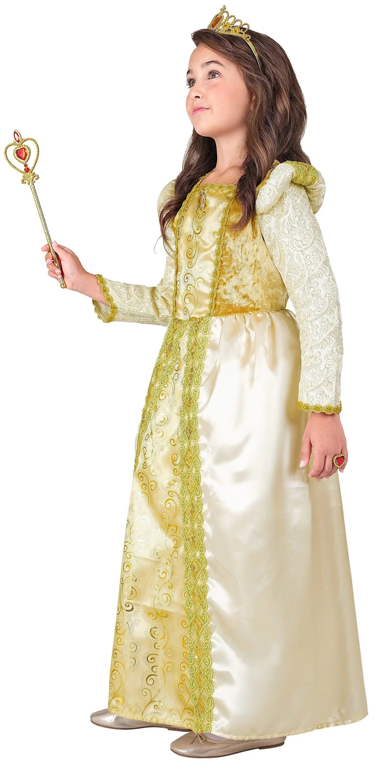 Stai cercando un costume da regina medievale per tua figlia? Con il costume da principessa medievale per bambini in colore dorato avrai un vestito elegante e stiloso con paillettes e ricami per travestire tua figlia come l’erede di un potente regno del Medioevo e sarà la bambina più bella della festa in maschera.