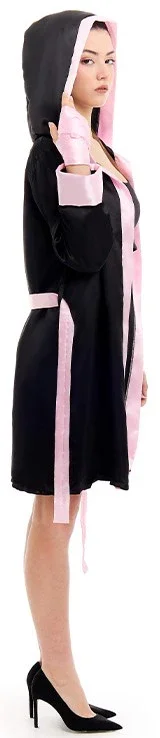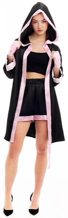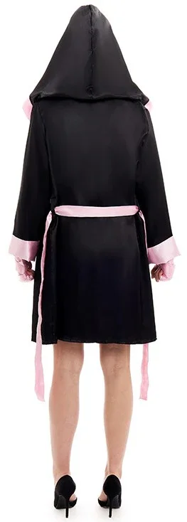 Stai cercando un costume da pugile per la tua festa? Con il costume da pugile con accappatoio per donna in colore nero e rosa avrai il vestito perfetto per travestirti da autentica campionessa del mondo di pugilato e trionferai alla tua festa in maschera.