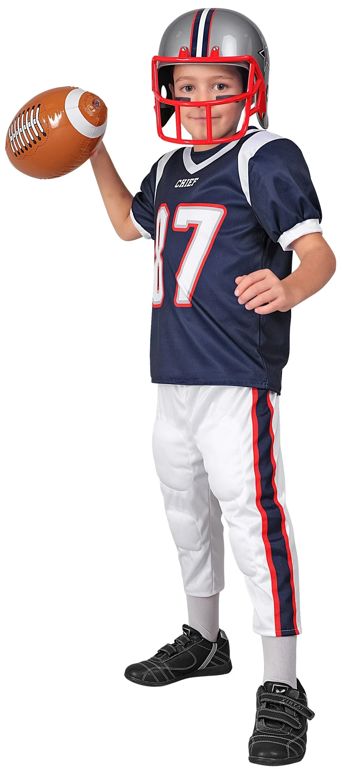 Stai cercando un costume da giocatore di football americano per tuo figlio? Con il costume da giocatore di football americano per bambini in blu navy e bianco avrai il completo perfetto per travestire tuo figlio come i giocatori della squadra dei New England Patriots o dei Dallas Cowboys della NFL e sarà il bambino più bello della festa.
