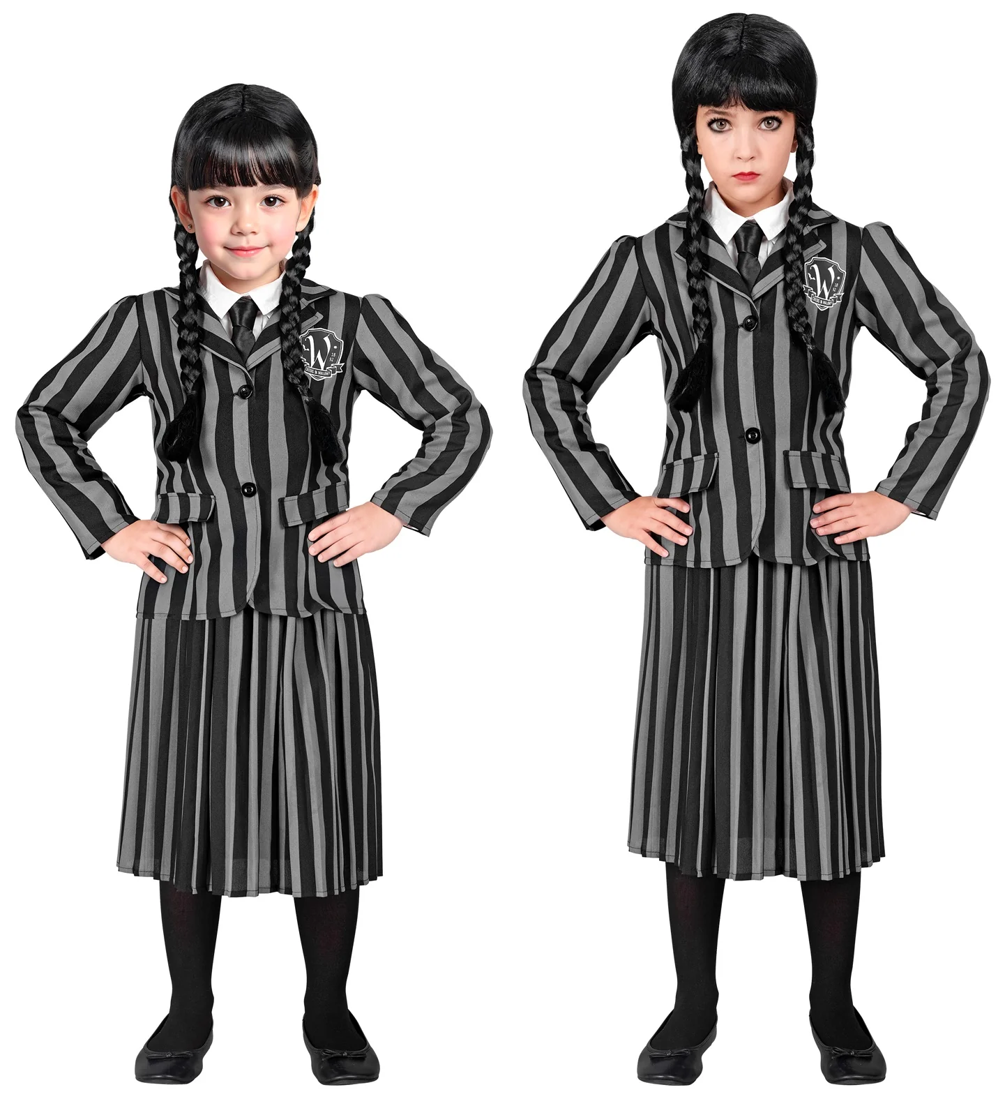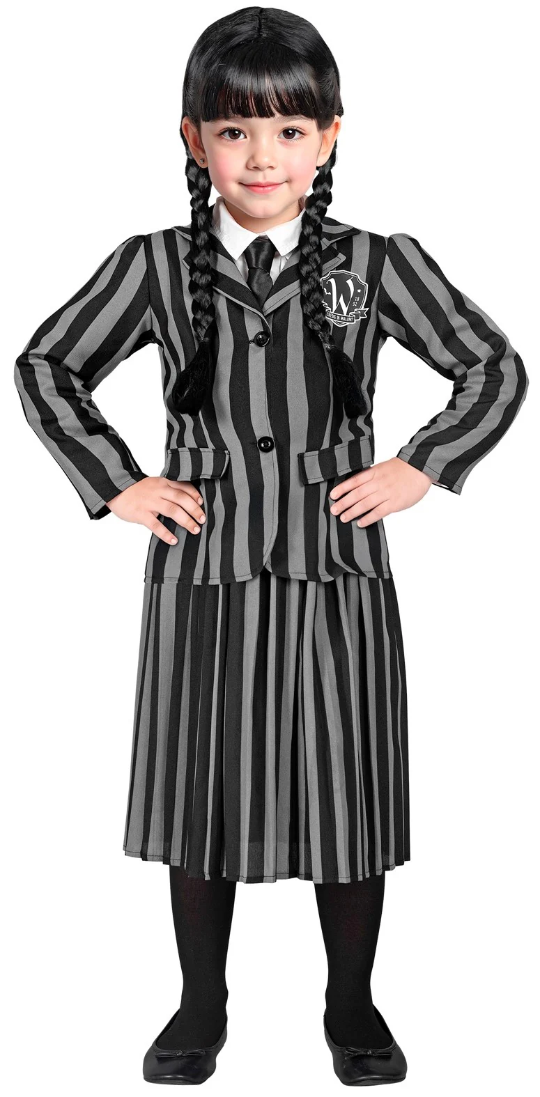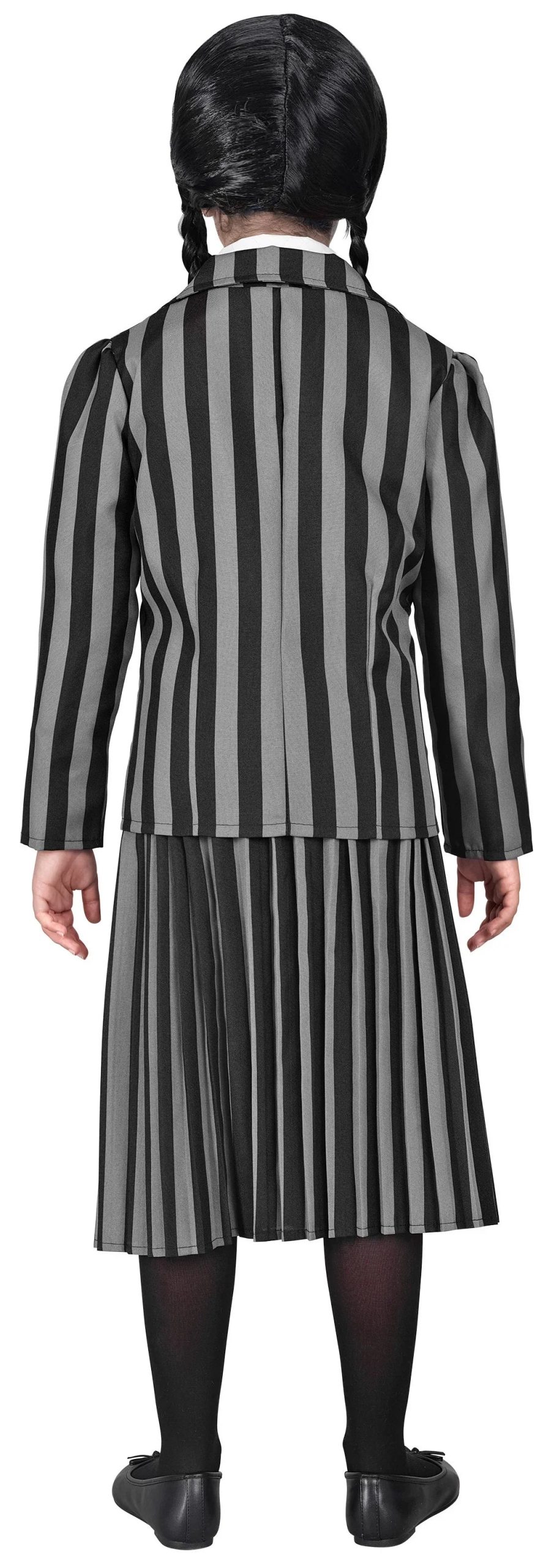 Stai cercando un costume da bambina gotica per tua figlia? Con il costume da bambina gotica con uniforme a righe nere e grigie avrai il vestito perfetto per travestire tua figlia come la protagonista della serie televisiva con il suo abito della scuola degli emarginati a cui i suoi genitori decidono di mandarla.