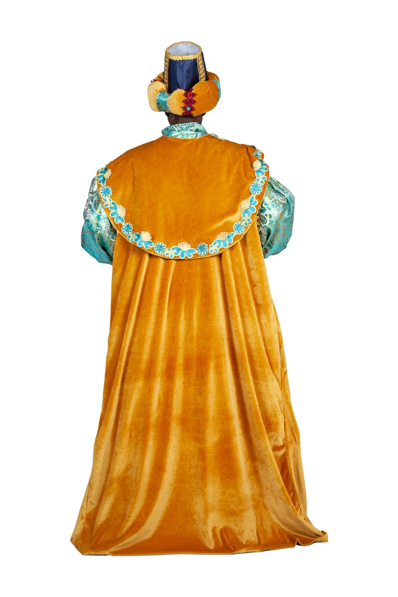 Questo spettacolare costume da re magio è composto da una spettacolare giacca dorata con dettagli turchesi, una tunica turchese, pantaloni blu scuro, fascia granata e turbante abbinato.