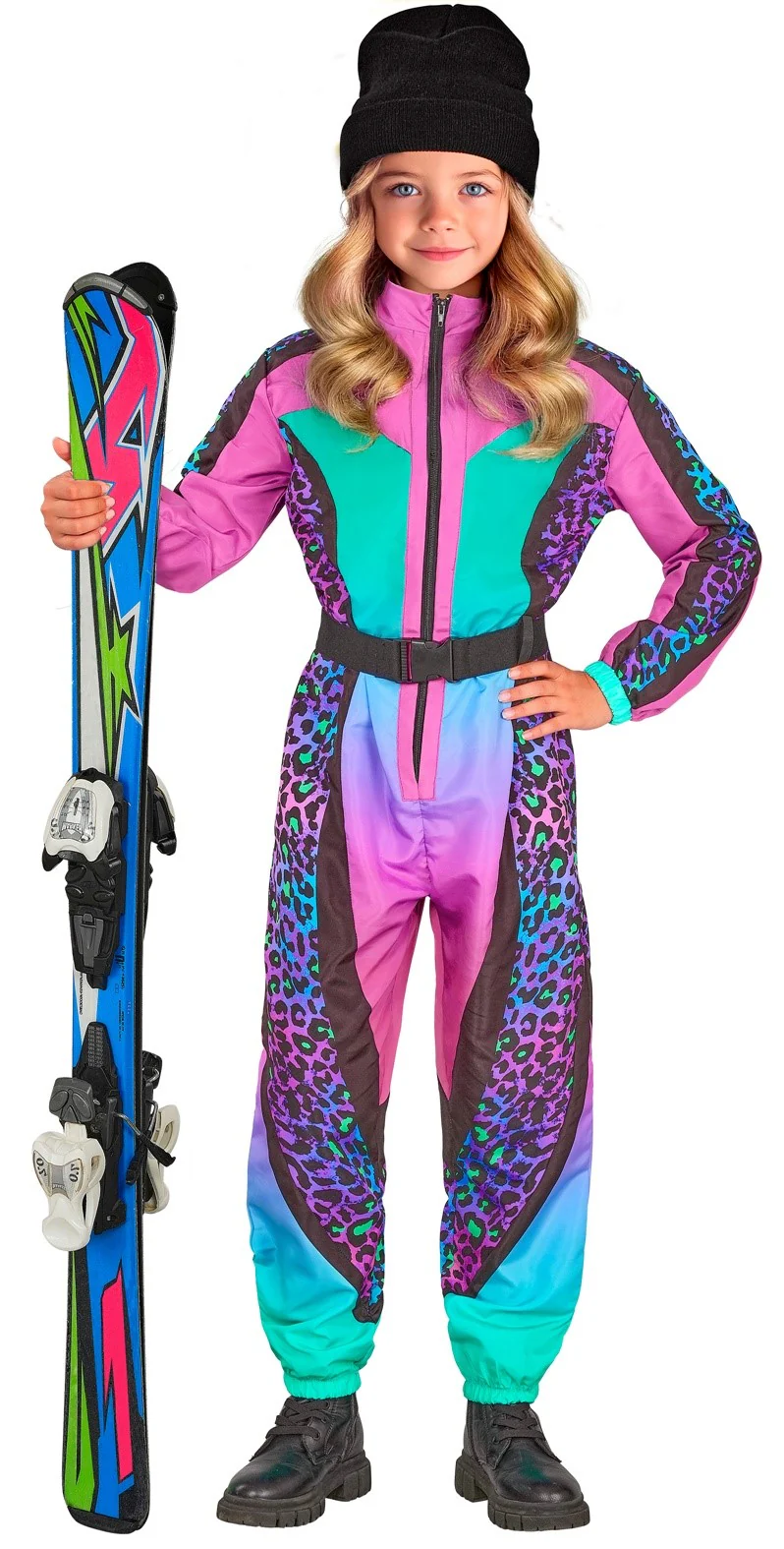 Stai cercando un costume da sciatrice anni ’80 per tua figlia? Con il costume da sciatrice o snowboarder per bambini con stampa animalier leopardata multicolore avrai il completo da sci più alla moda per travestire la tua bambina come una vera appassionata di questi sport sulla neve.
