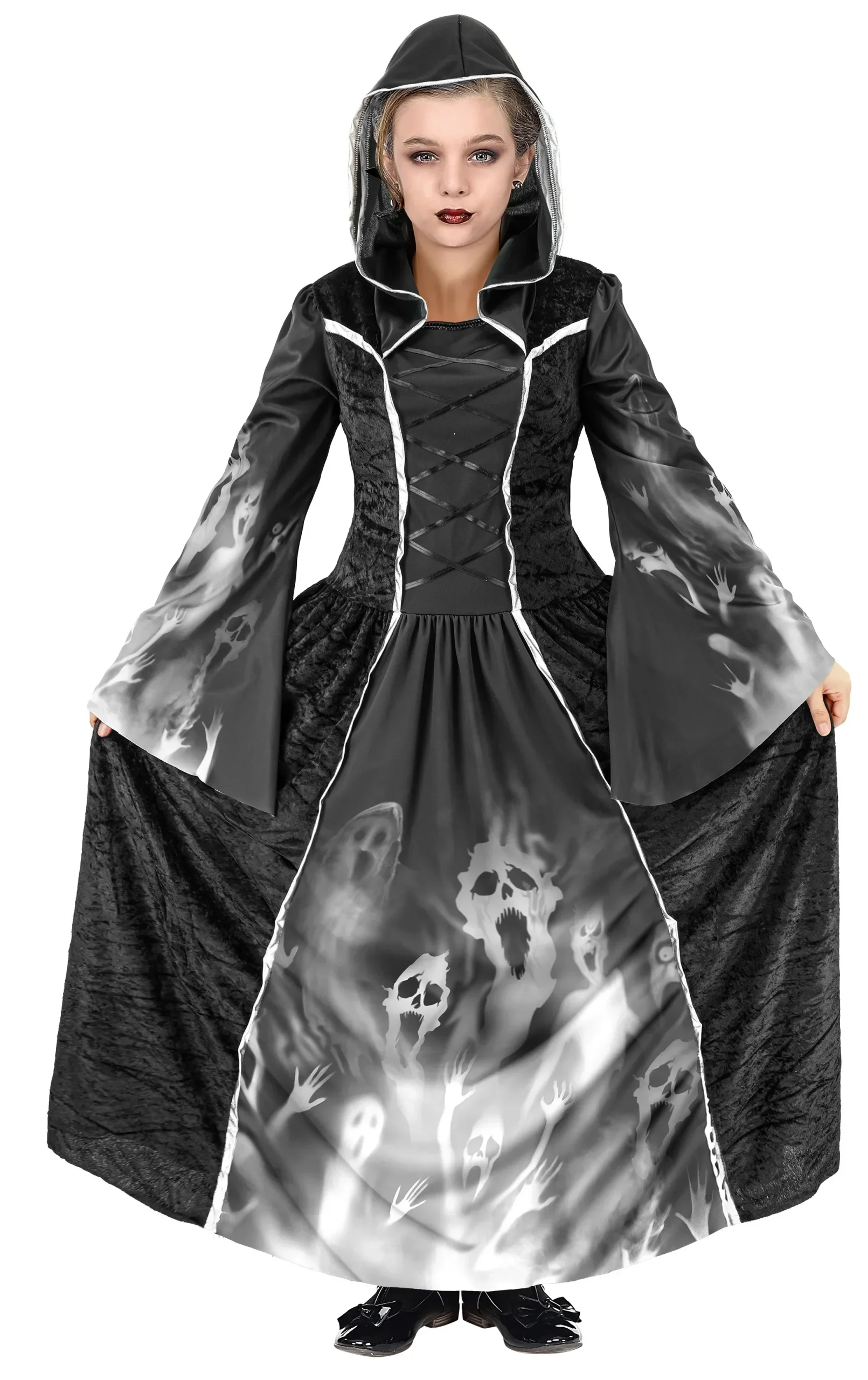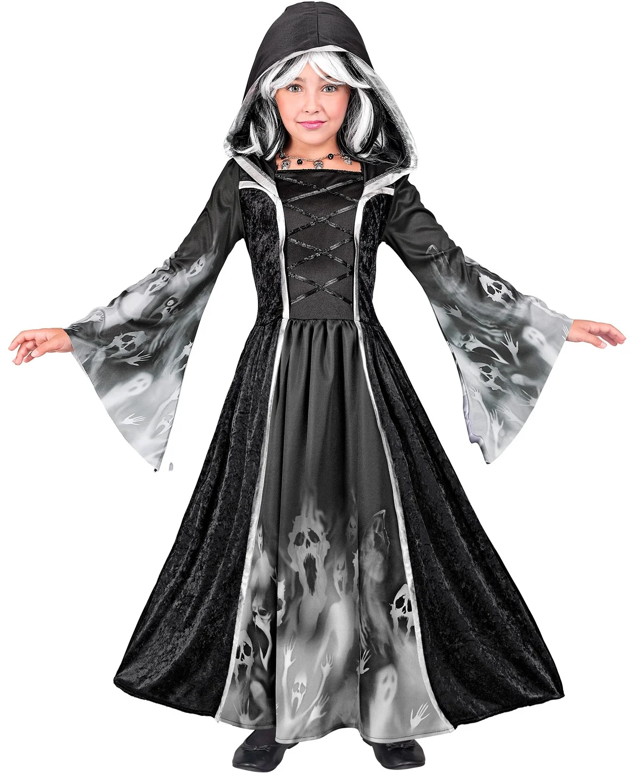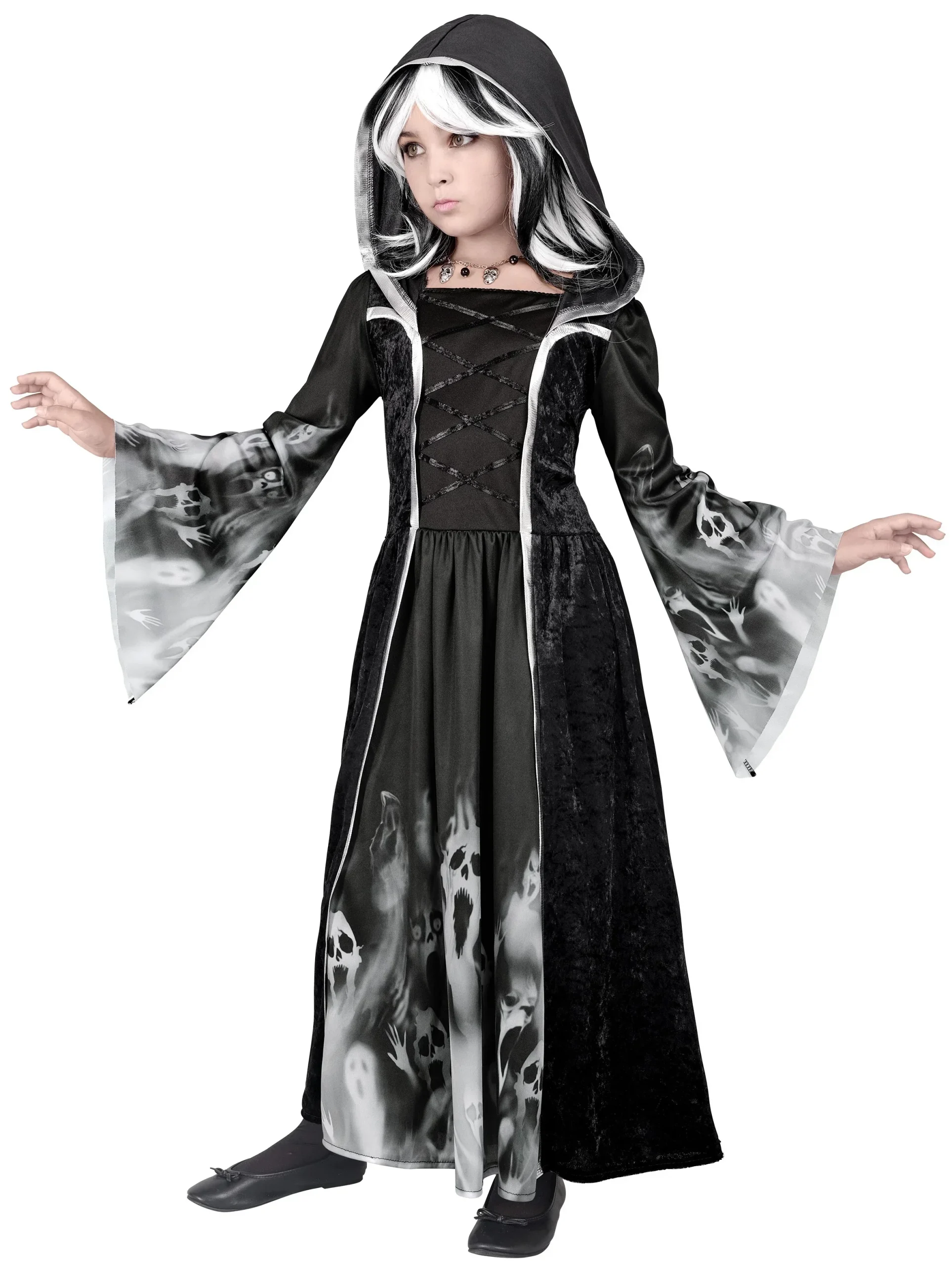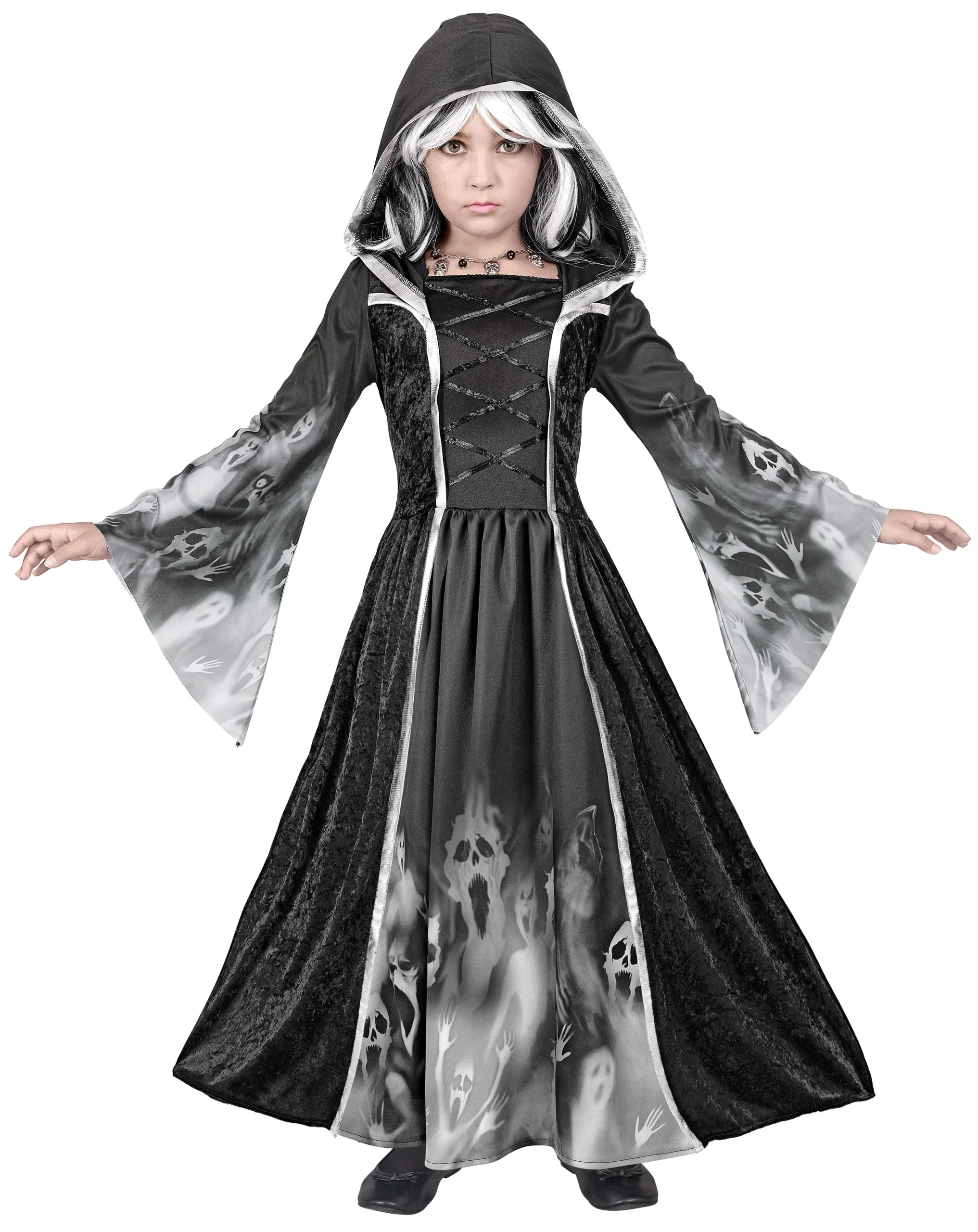 Stai cercando un costume da strega per la festa di Halloween di tua figlia? Con il costume da strega negromante per bambini avrai il vestito perfetto per travestire tua figlia come una malvagia strega medievale che pratica la magia nera e sarà la bambina più terrificante della festa di Halloween.