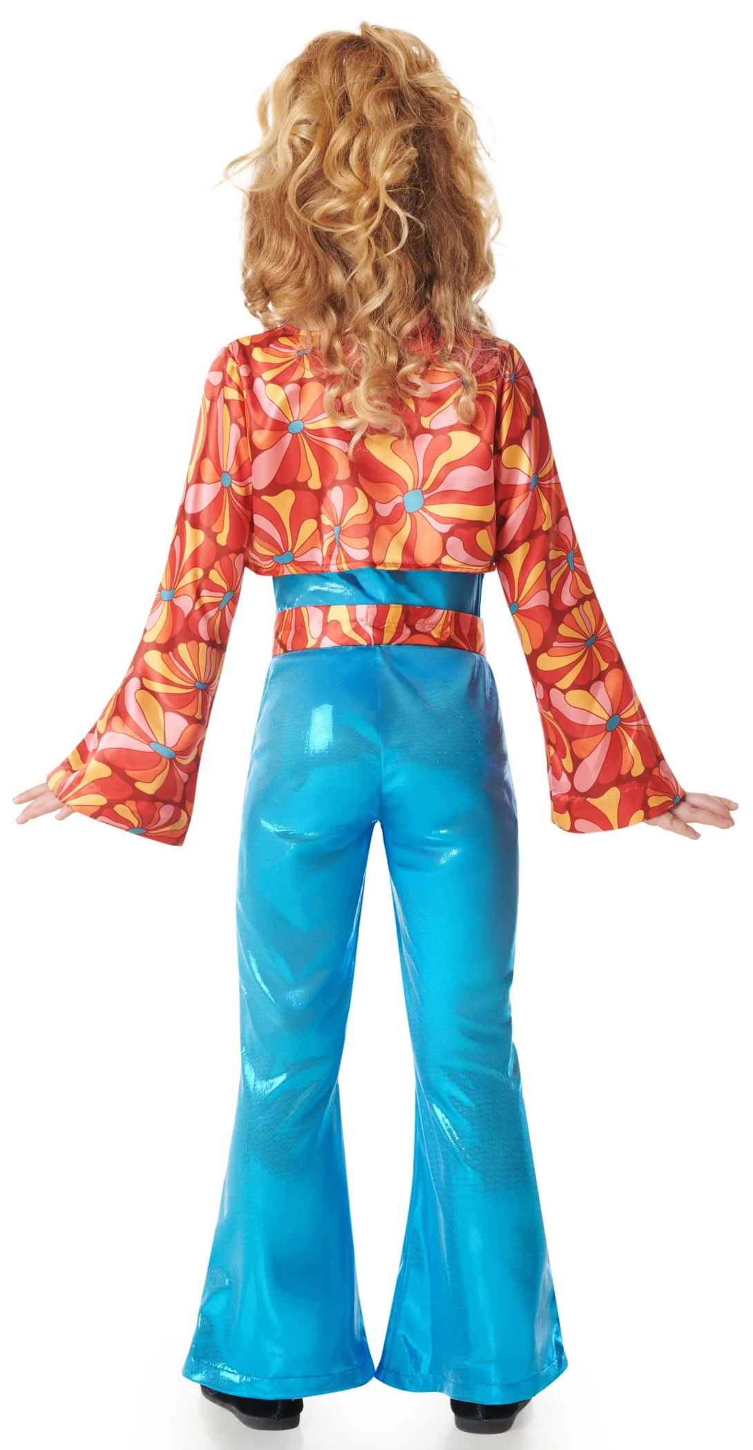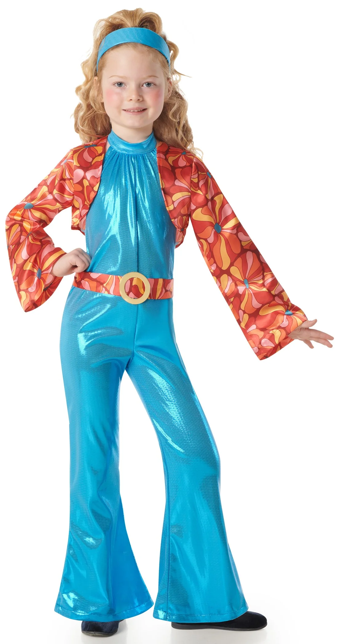 Stai cercando un costume disco per tua figlia? Con il costume da ragazza disco anni ’70 per bambini in colore blu e giacca stampata in arancione, rosso, giallo e rosa avrai il vestito perfetto per travestire tua figlia nello stile disco anni settanta e sarà la bambina più bella della festa in maschera.