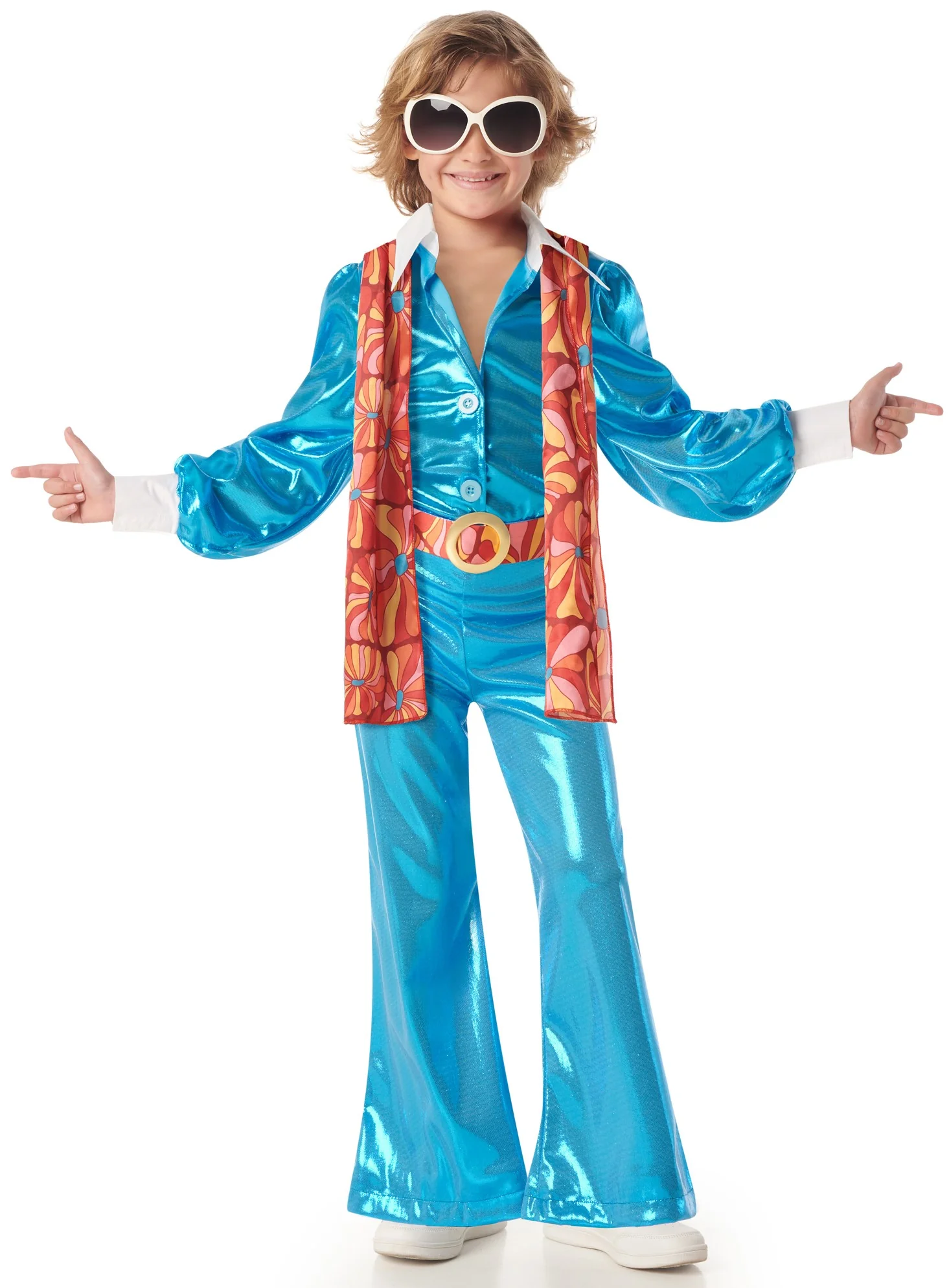 Stai cercando un costume disco per tuo figlio? Con il costume da ragazzo disco anni ’70 per bambini in colore blu e fazzoletto stampato in arancione, rosso, giallo e rosa avrai il vestito perfetto per travestire tuo figlio nello stile disco anni settanta e sarà il bambino più bello della festa in maschera.