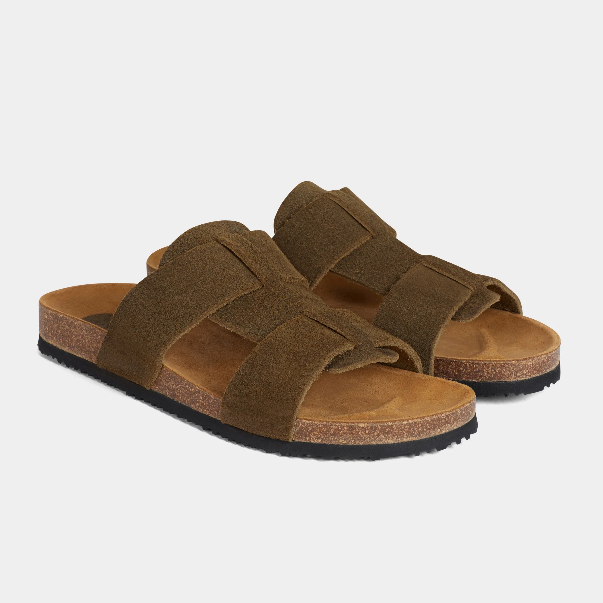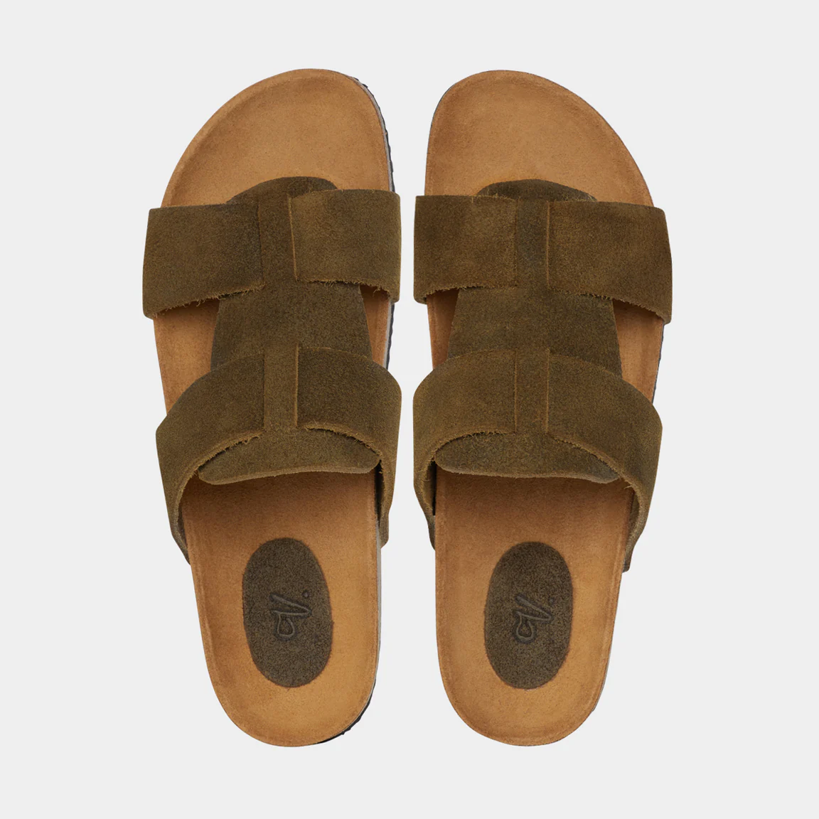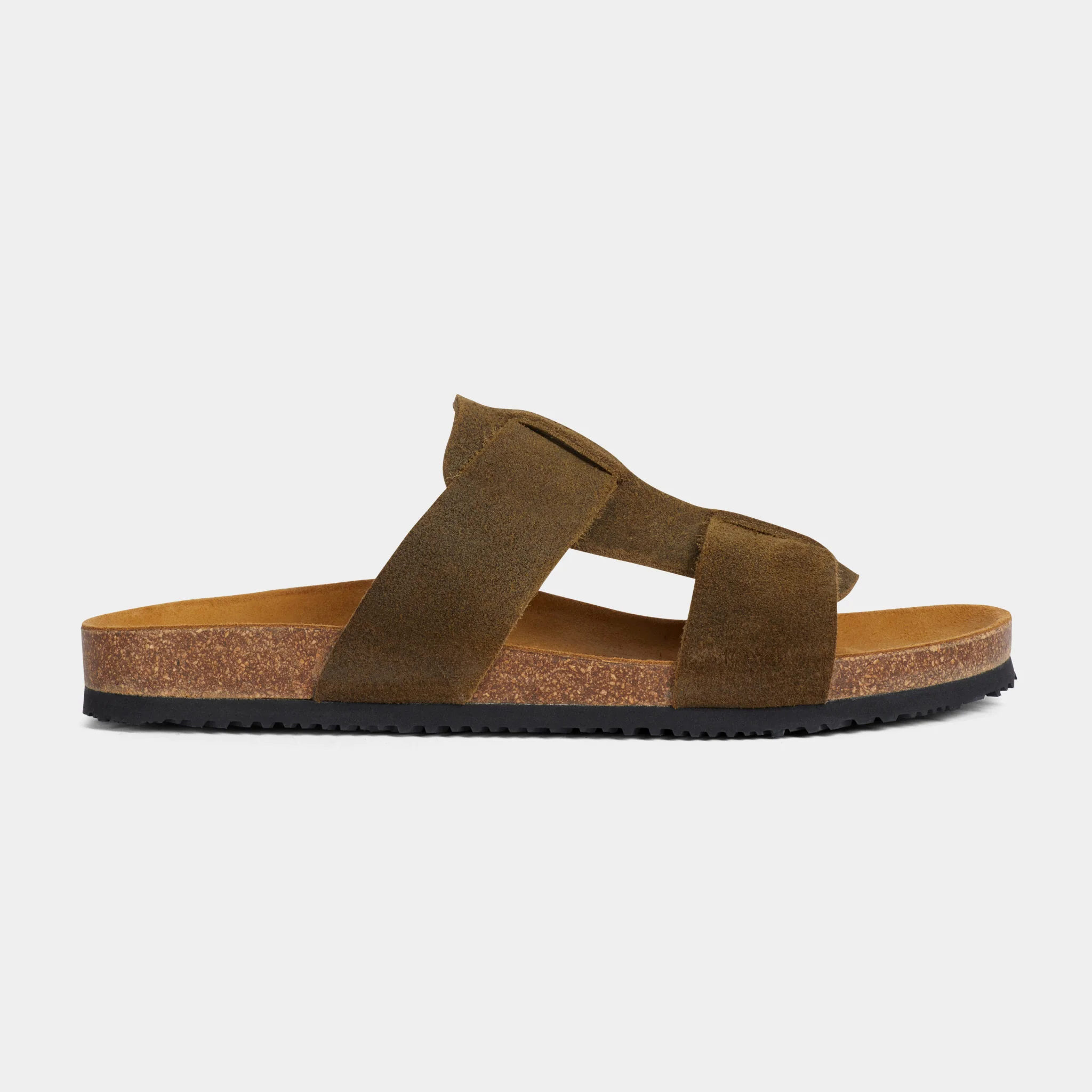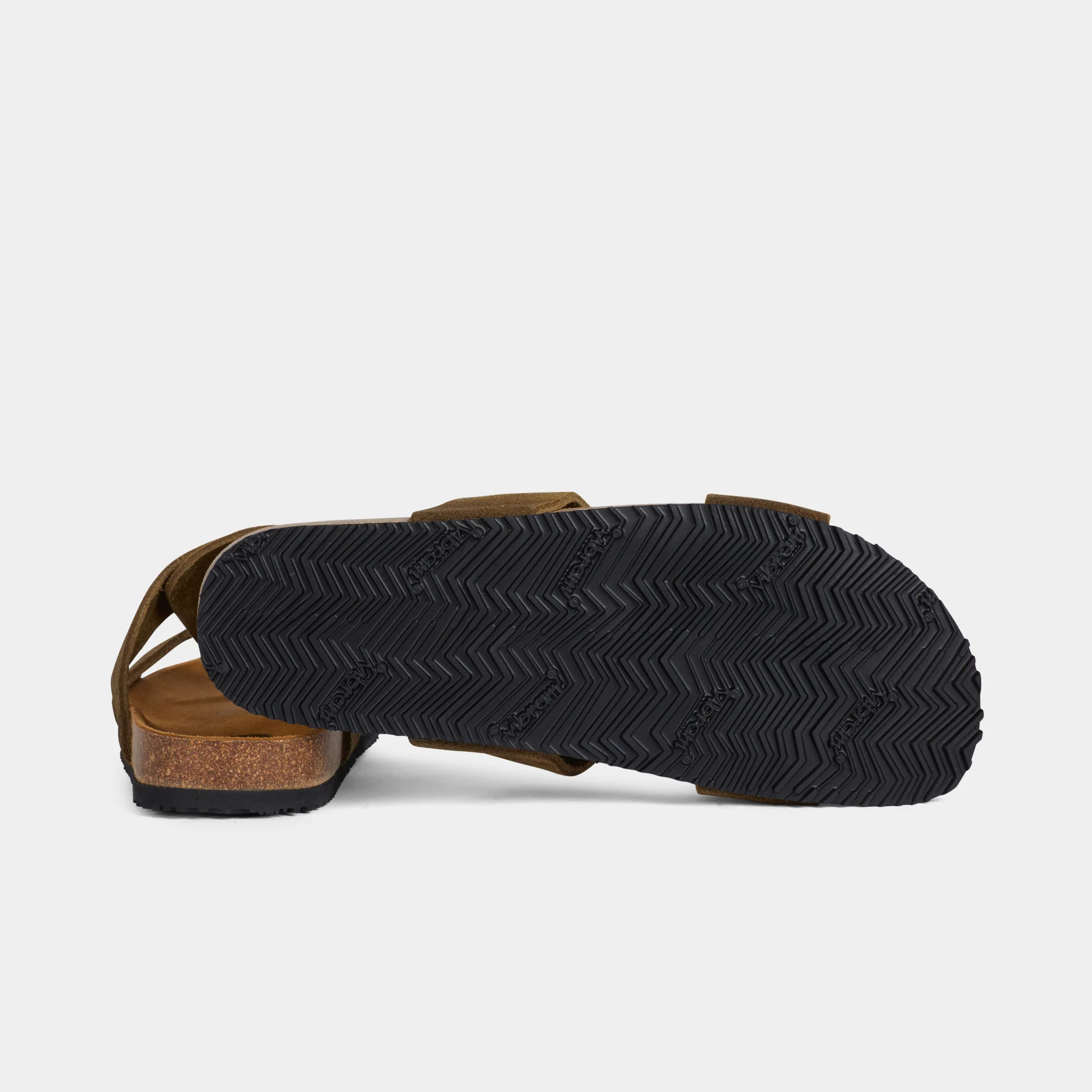Un design d’ispirazione etnica che richiama i toni e le sfumature della terra. La pelle scamosciata verde oliva è lavorata a taglio vivo: una tecnica che dona alla pelle un senso di naturalezza e comfort a chi indossa questo sandalo. Il sottopiede anatomico e la suola Vibram sono studiati per accompagnarti con praticità e stile.
