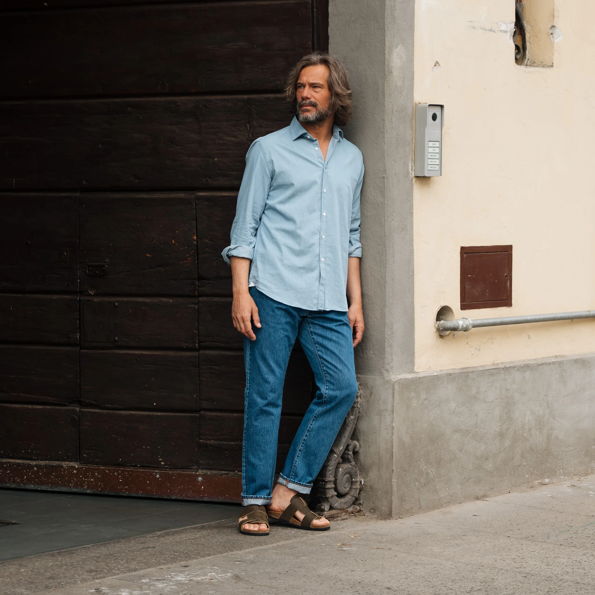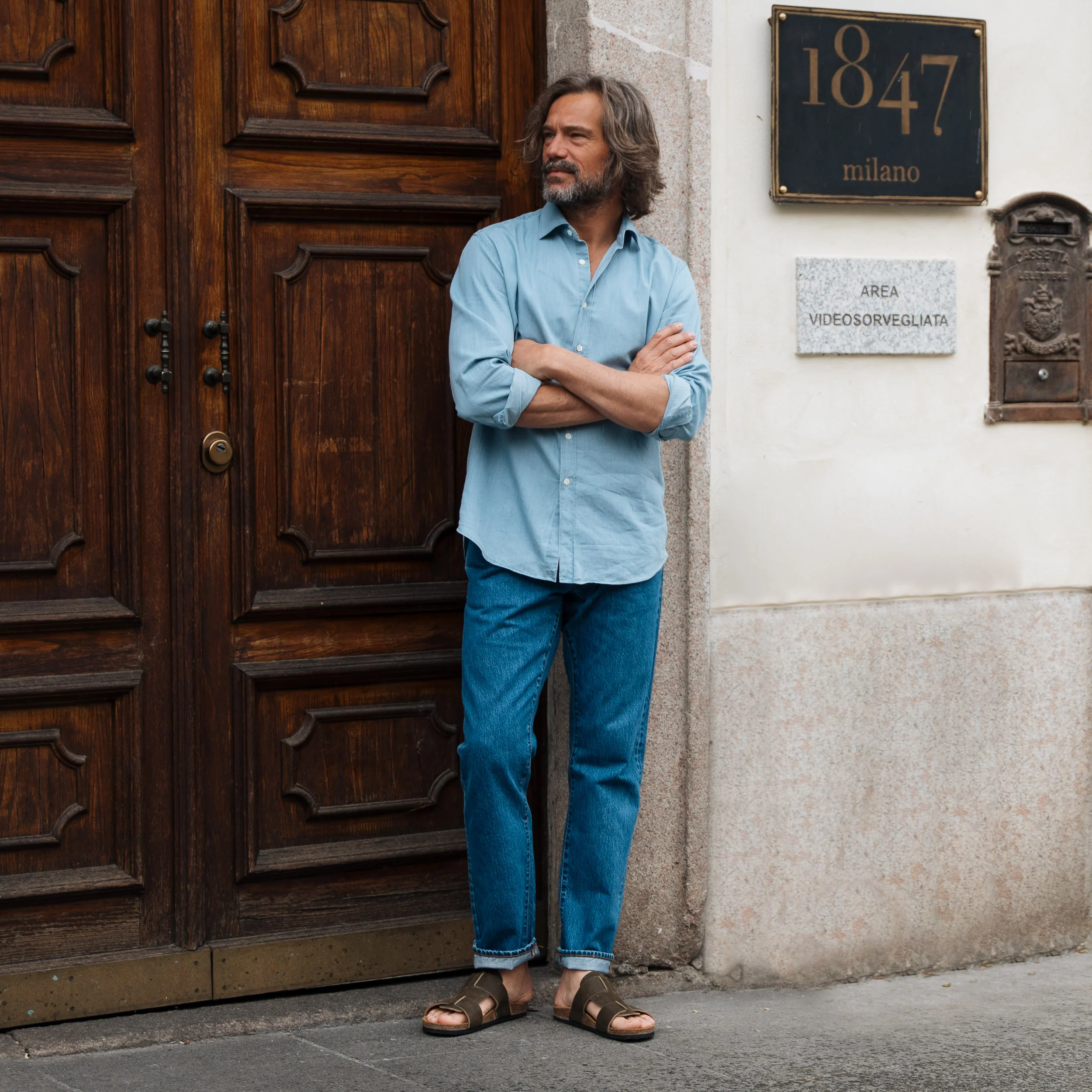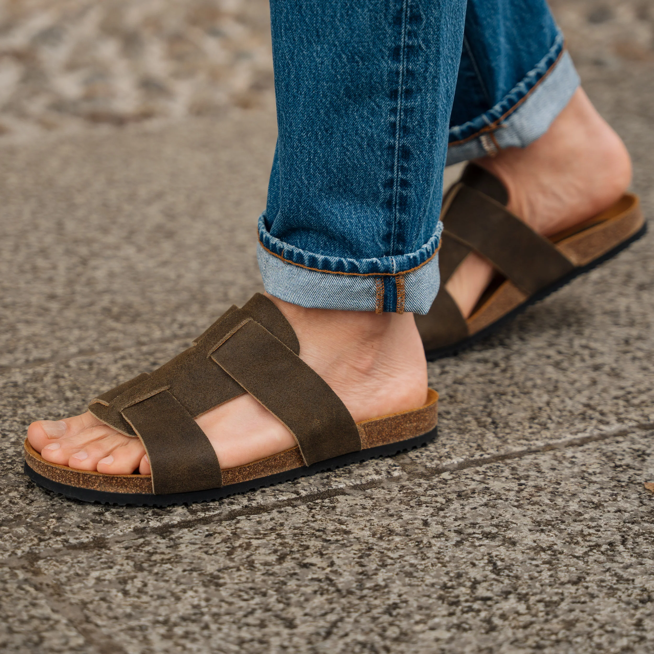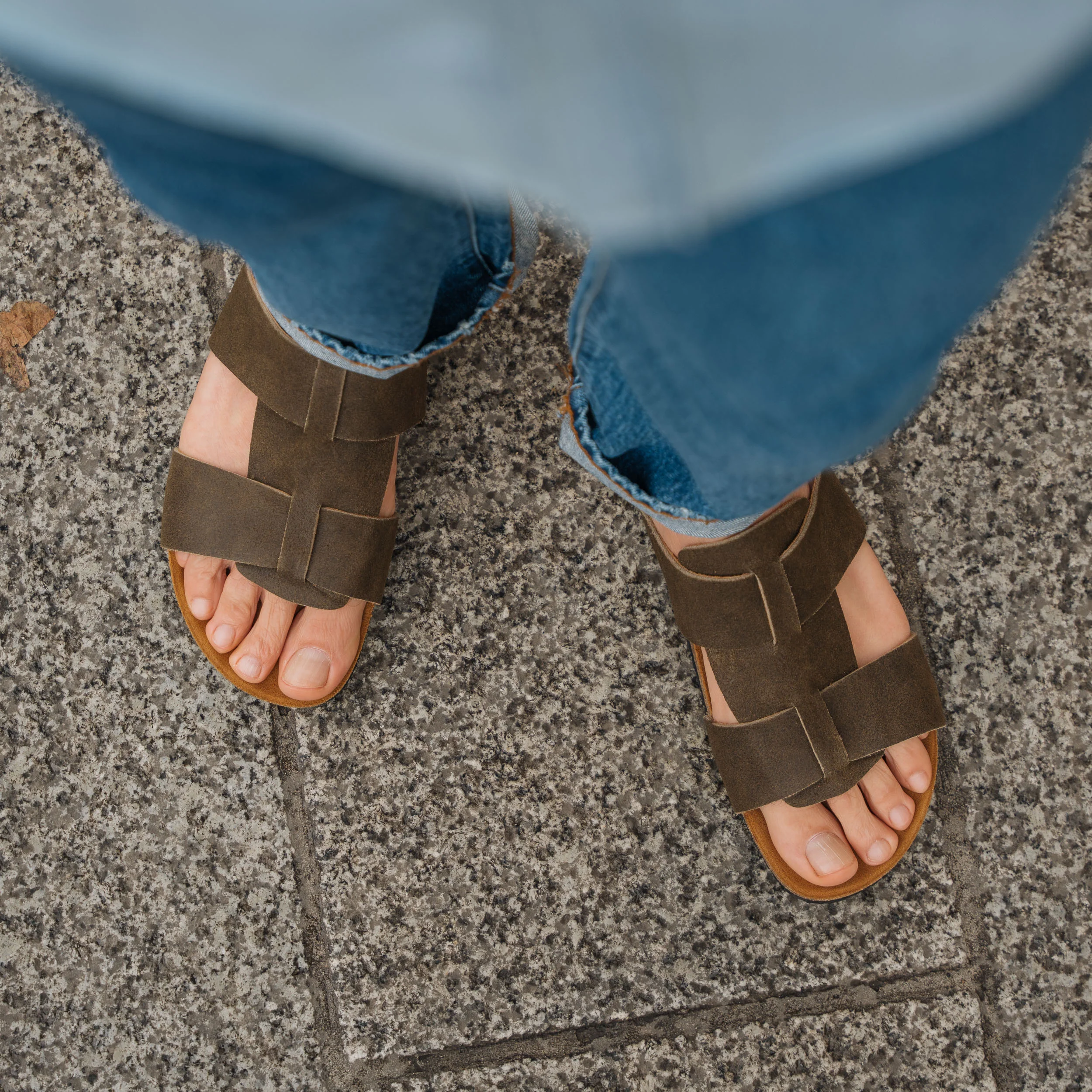 Un design d’ispirazione etnica che richiama i toni e le sfumature della terra. La pelle scamosciata verde oliva è lavorata a taglio vivo: una tecnica che dona alla pelle un senso di naturalezza e comfort a chi indossa questo sandalo. Il sottopiede anatomico e la suola Vibram sono studiati per accompagnarti con praticità e stile.
