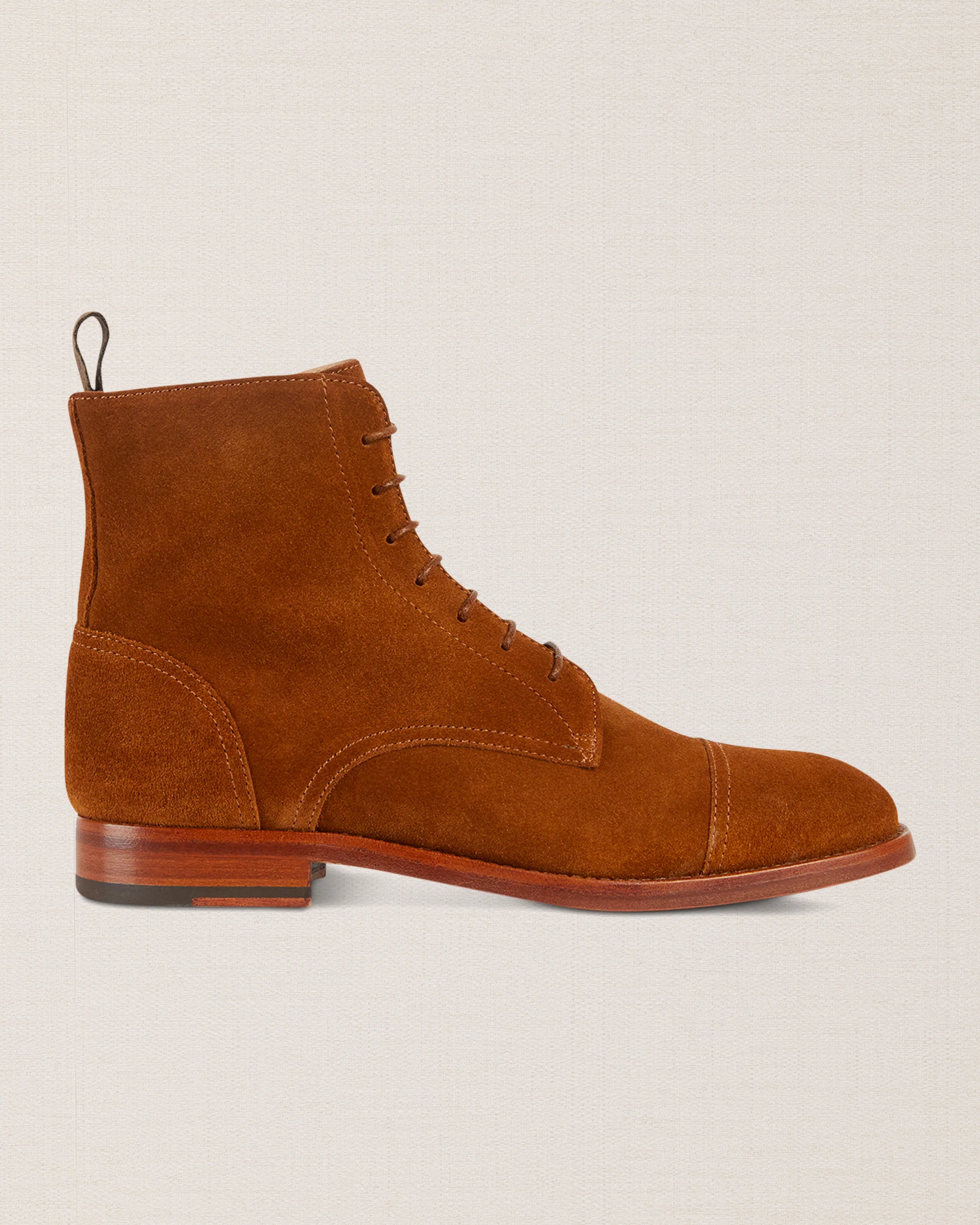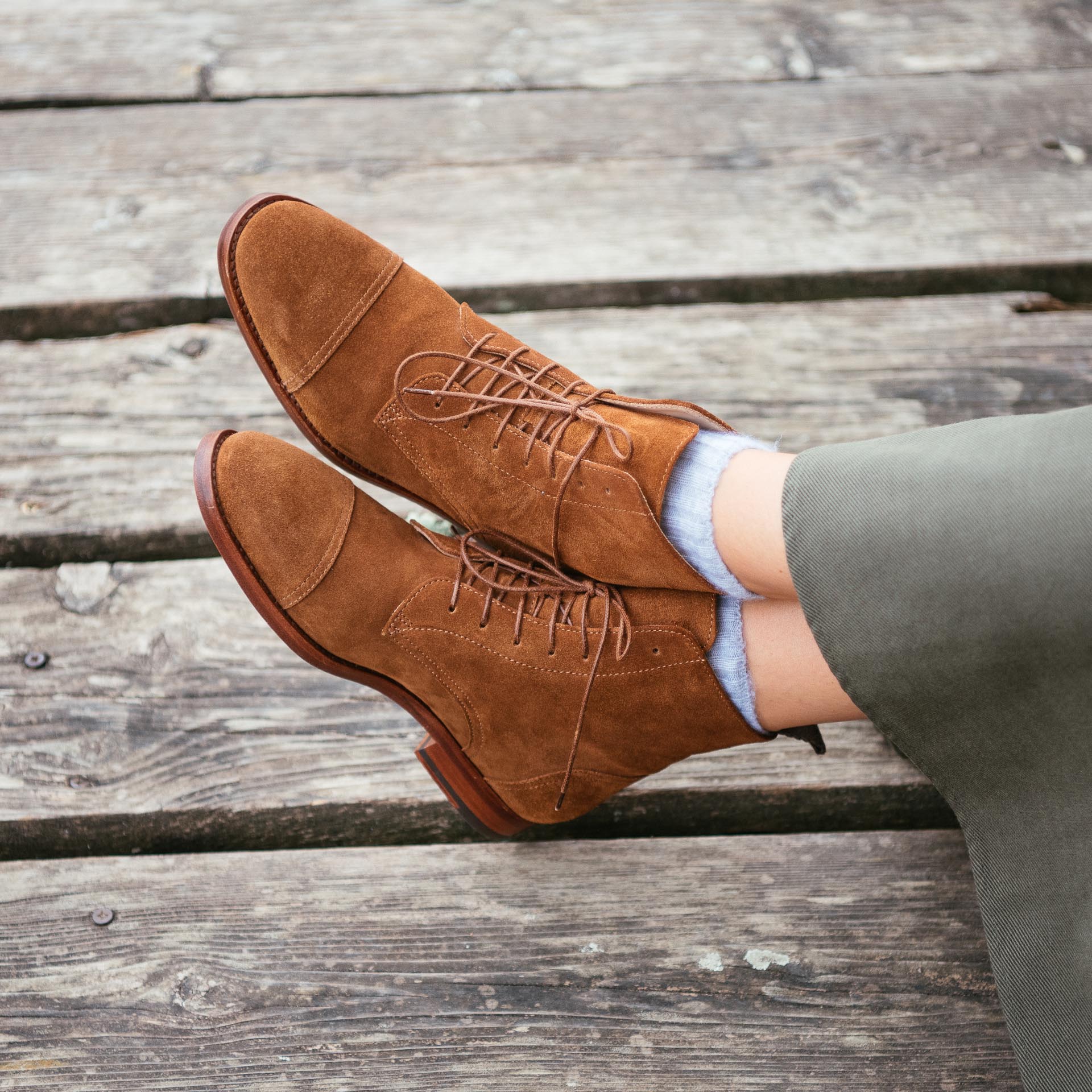 Lo stivaletto allacciato, semplice e pulito, dal richiamo vintage e la suola sottile in cuoio. Scamosciato per camminare in campagna, a pelle liscia per andare in ufficio. Fatto a Montegranaro (FM).