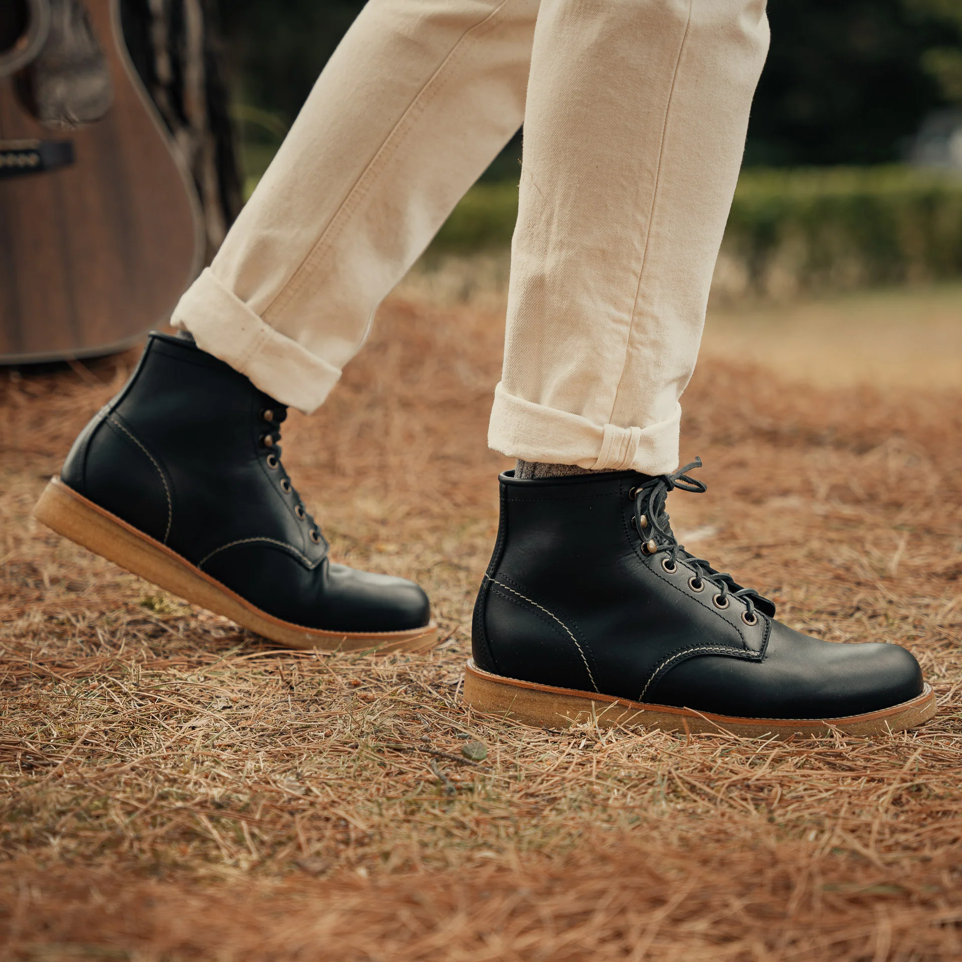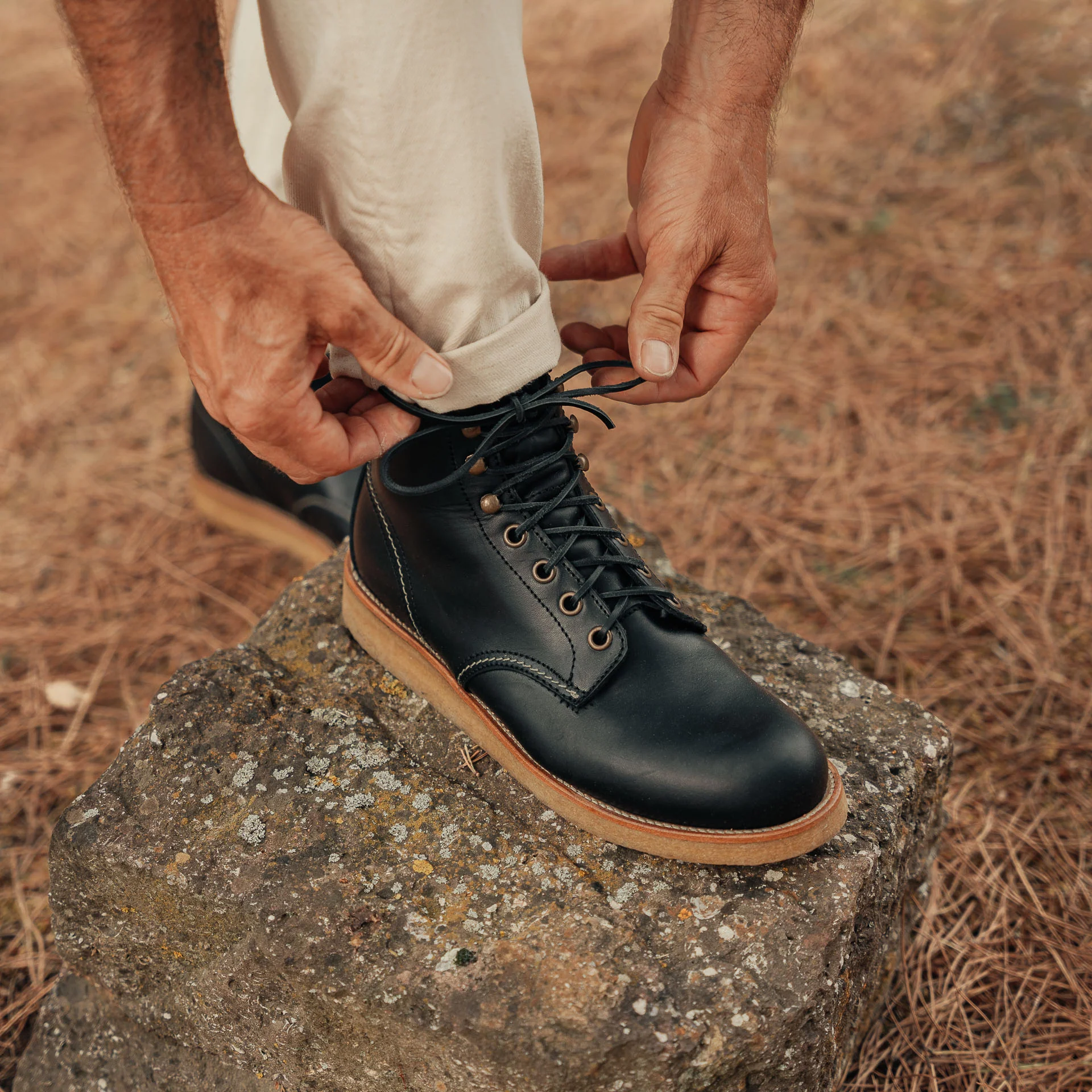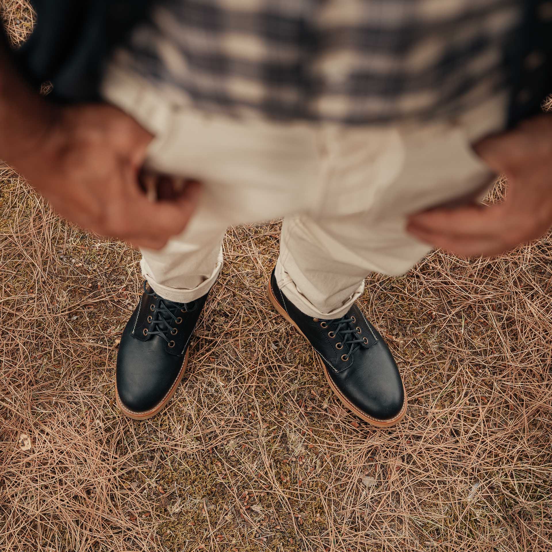 Gli stivaletti allacciati per vivere l’aria aperta, dal design liscio e avvolgente. In pelle di vitello liscia e la suola in gomma para. Per la nostra avventura in campagna lo abbiamo indossato con un denim ecrù, una serafina, una camicia check in lana e cashmere, una overshirt in denim crudo.