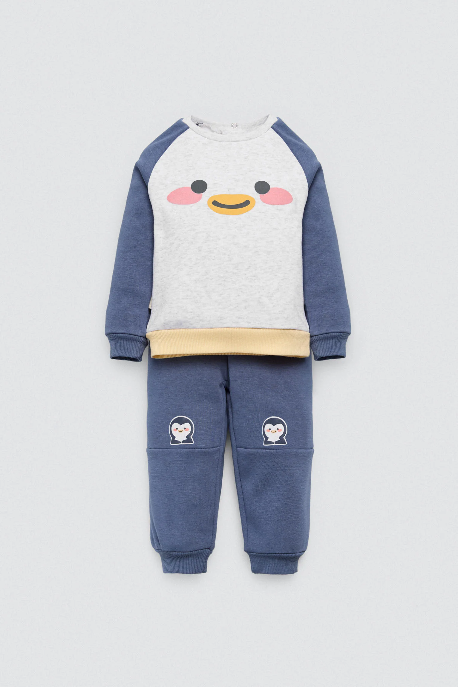 Set per neonato composto da felpa e pantaloni con ginocchiere decorative a forma di pinguino. Interno in pile morbido e confortevole. Perfetto per giocare o passeggiare con stile in inverno.