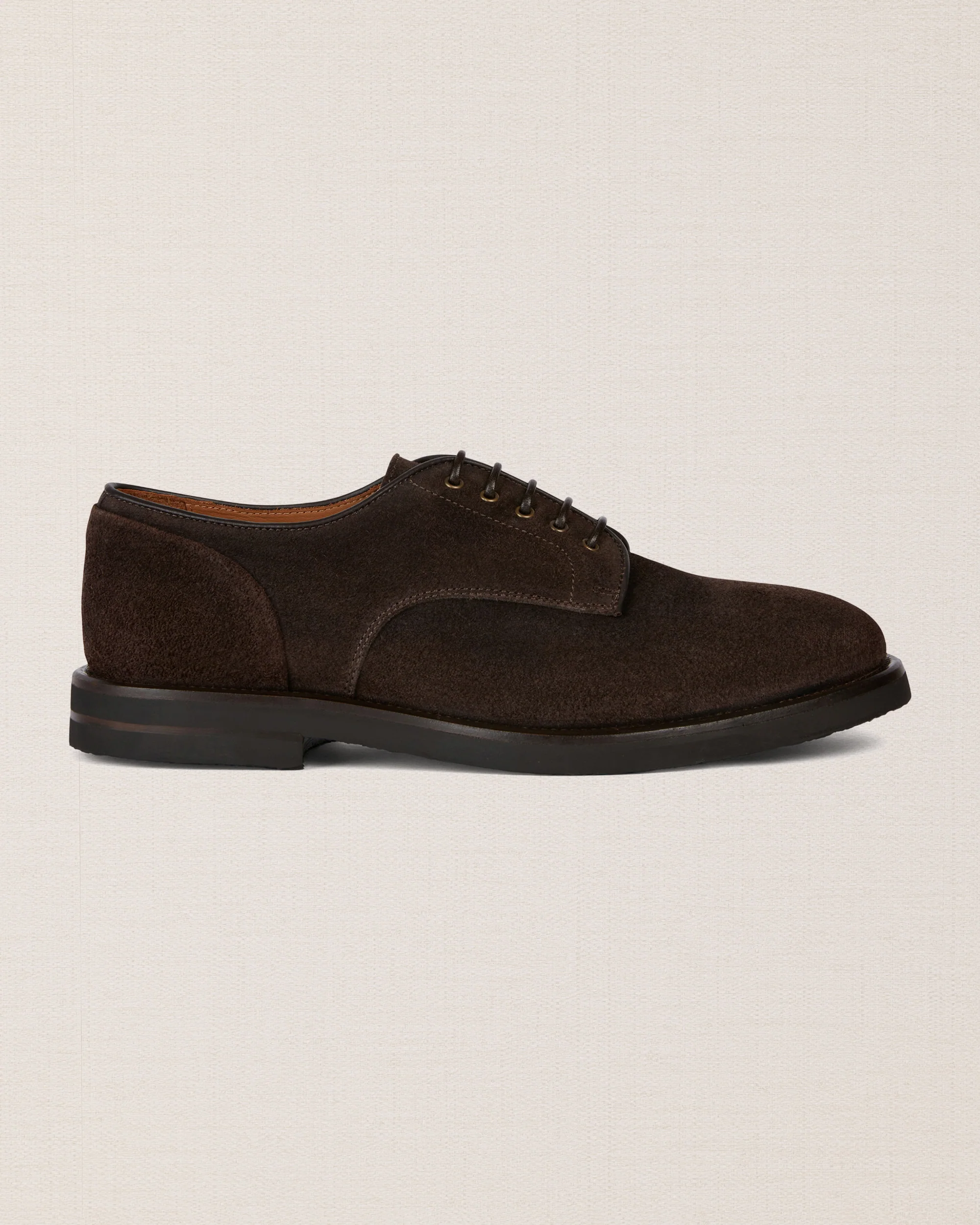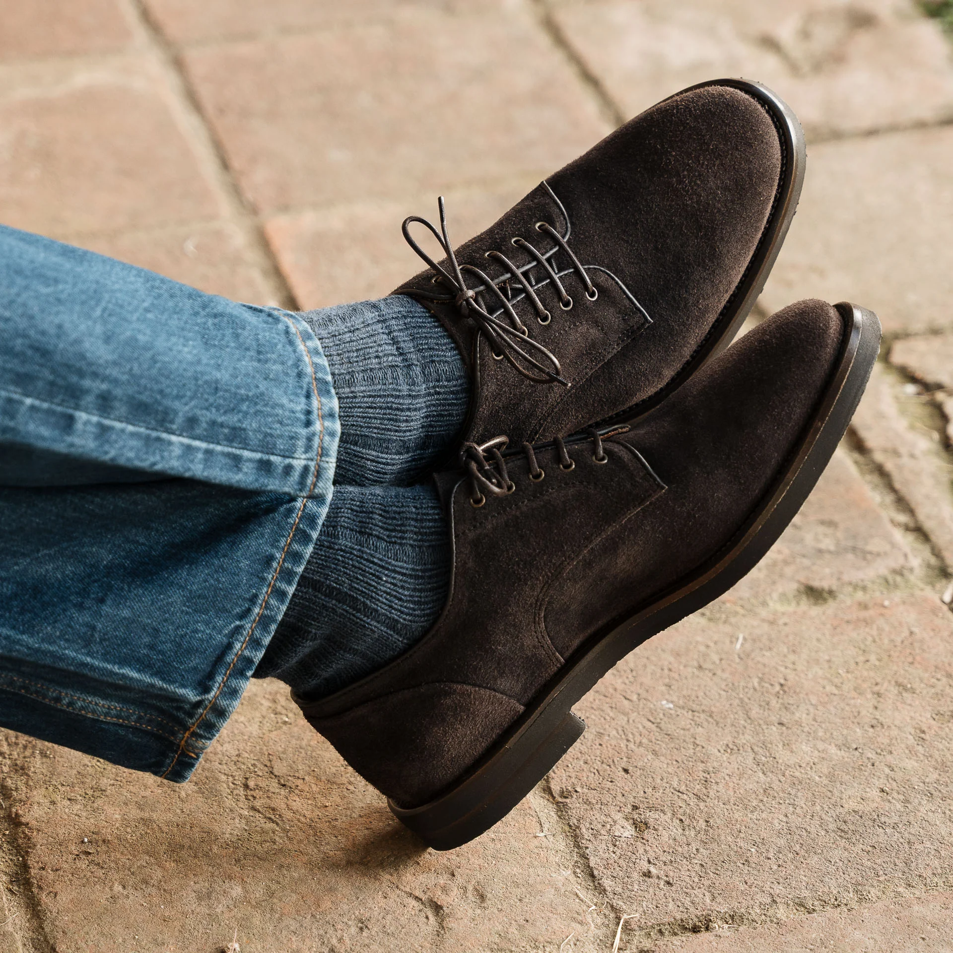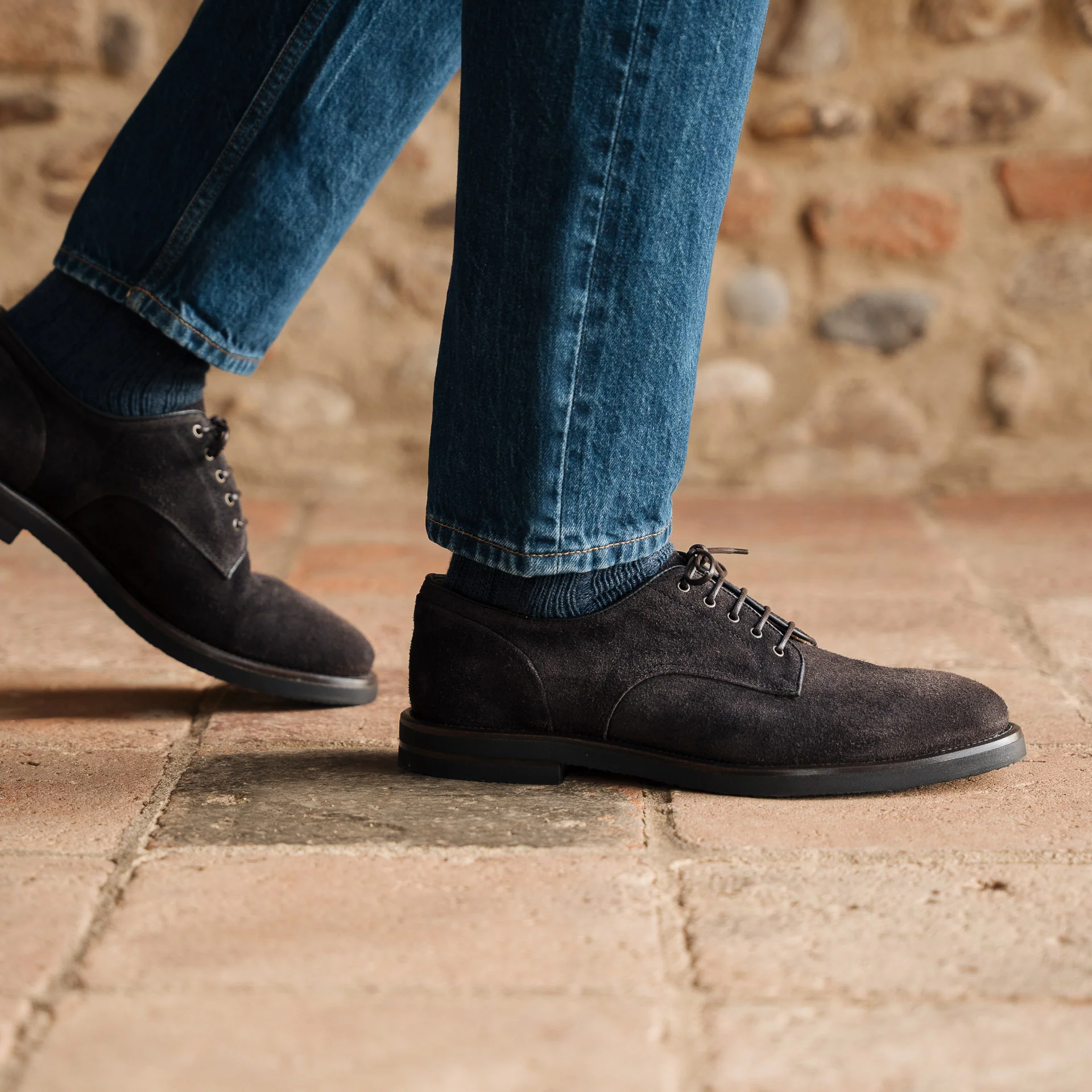 Iconiche ma rivisitate in chiave più informale, sono le derbies scamosciate ingrassate color testa di moro. Sanno esprimere perfettamente anche le anime più rock. E con la suola in gomma caucciù è un piacere passeggiare.