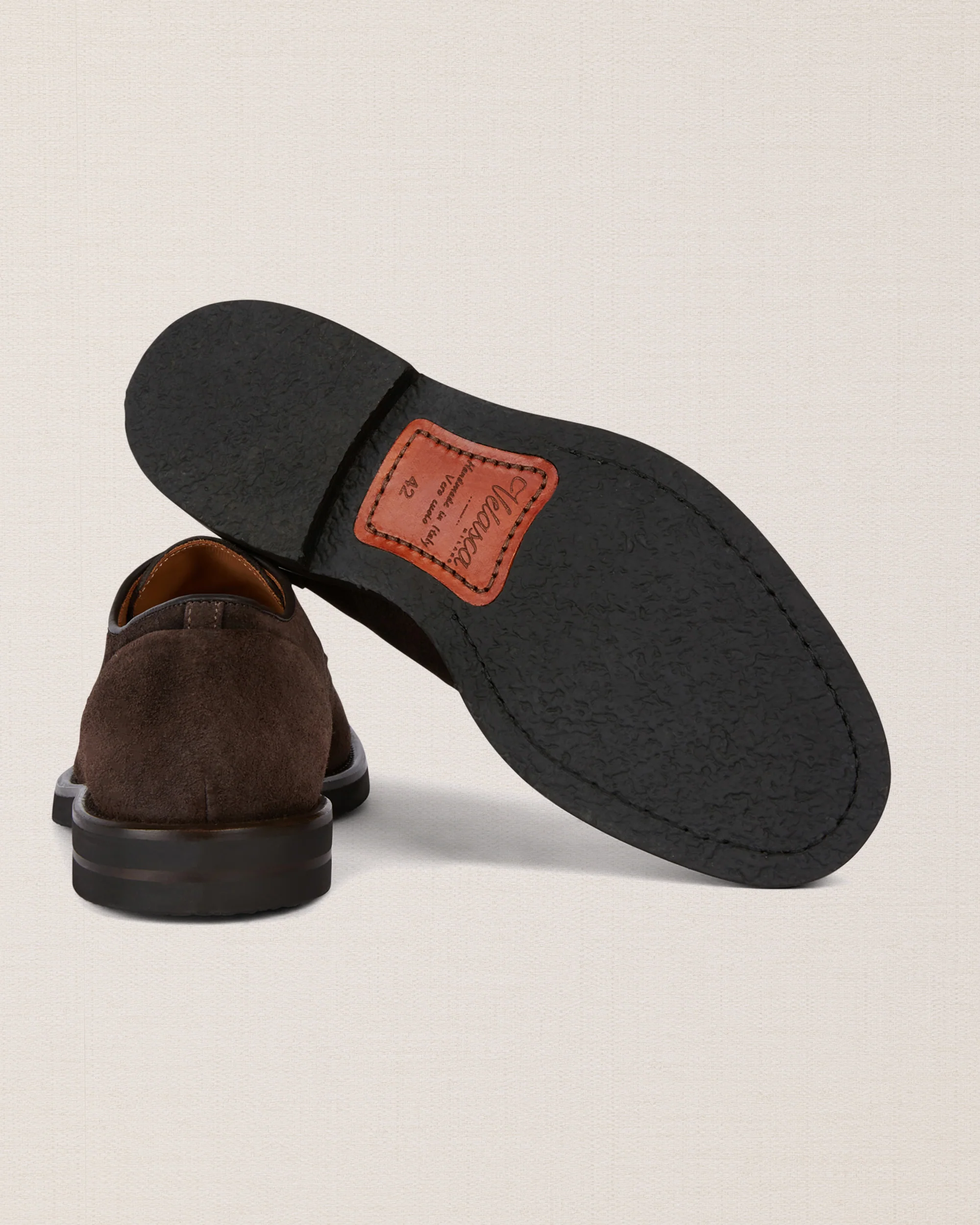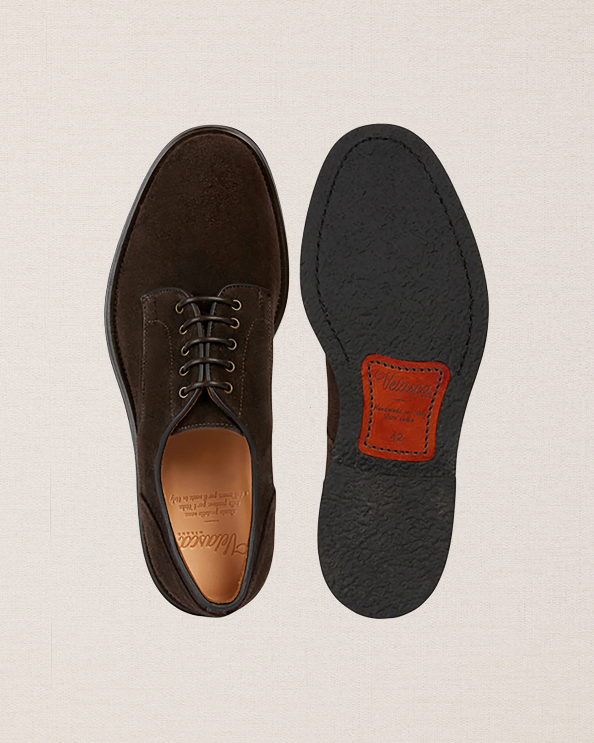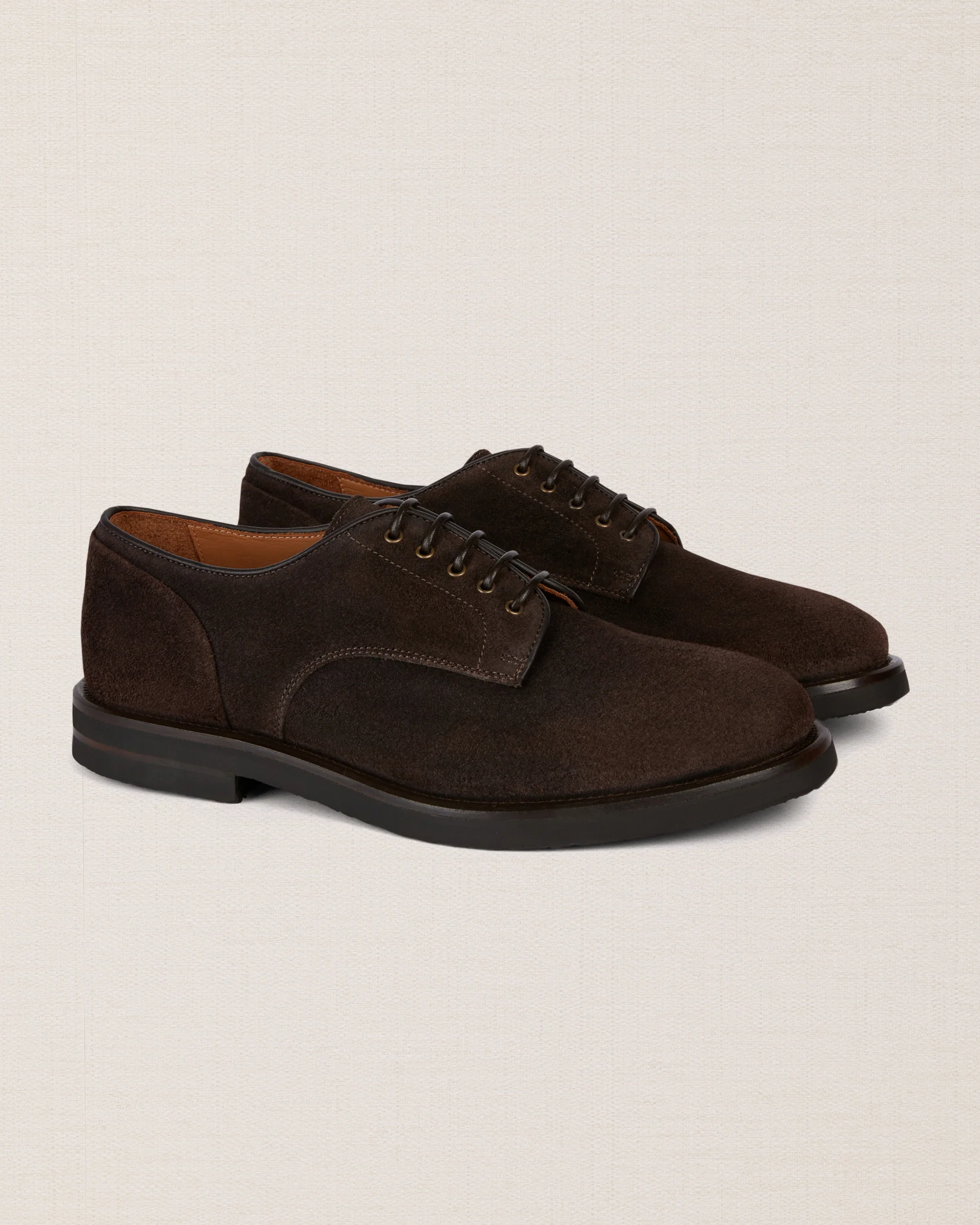 Iconiche ma rivisitate in chiave più informale, sono le derbies scamosciate ingrassate color testa di moro. Sanno esprimere perfettamente anche le anime più rock. E con la suola in gomma caucciù è un piacere passeggiare.
