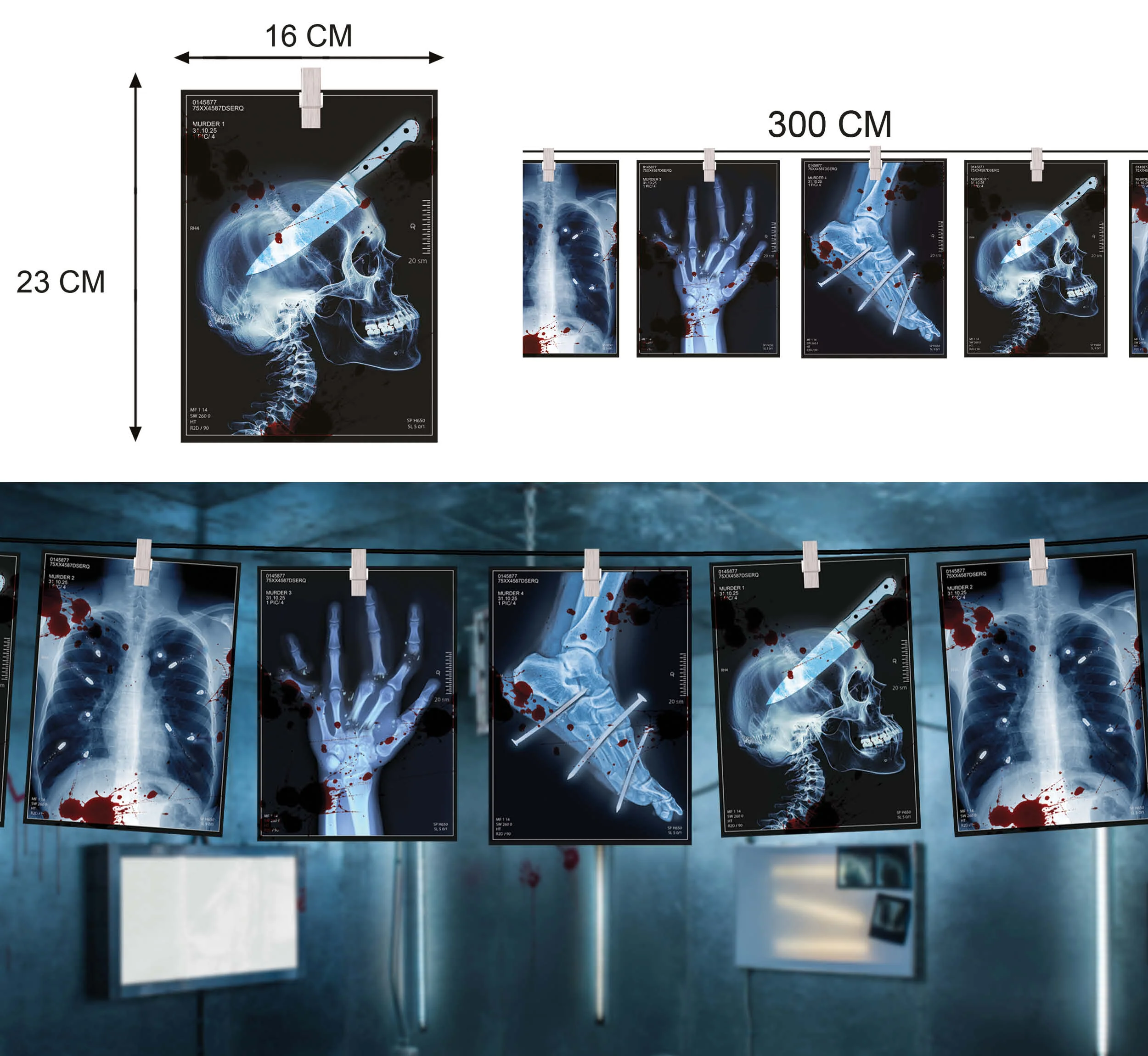 Stai cercando una ghirlanda terrificante per la tua festa di Halloween? Con la ghirlanda di 300cm con radiografie di lesioni spaventose avrai il complemento perfetto per decorare la tua casa o il tuo negozio nel modo più spaventoso questo Halloween.