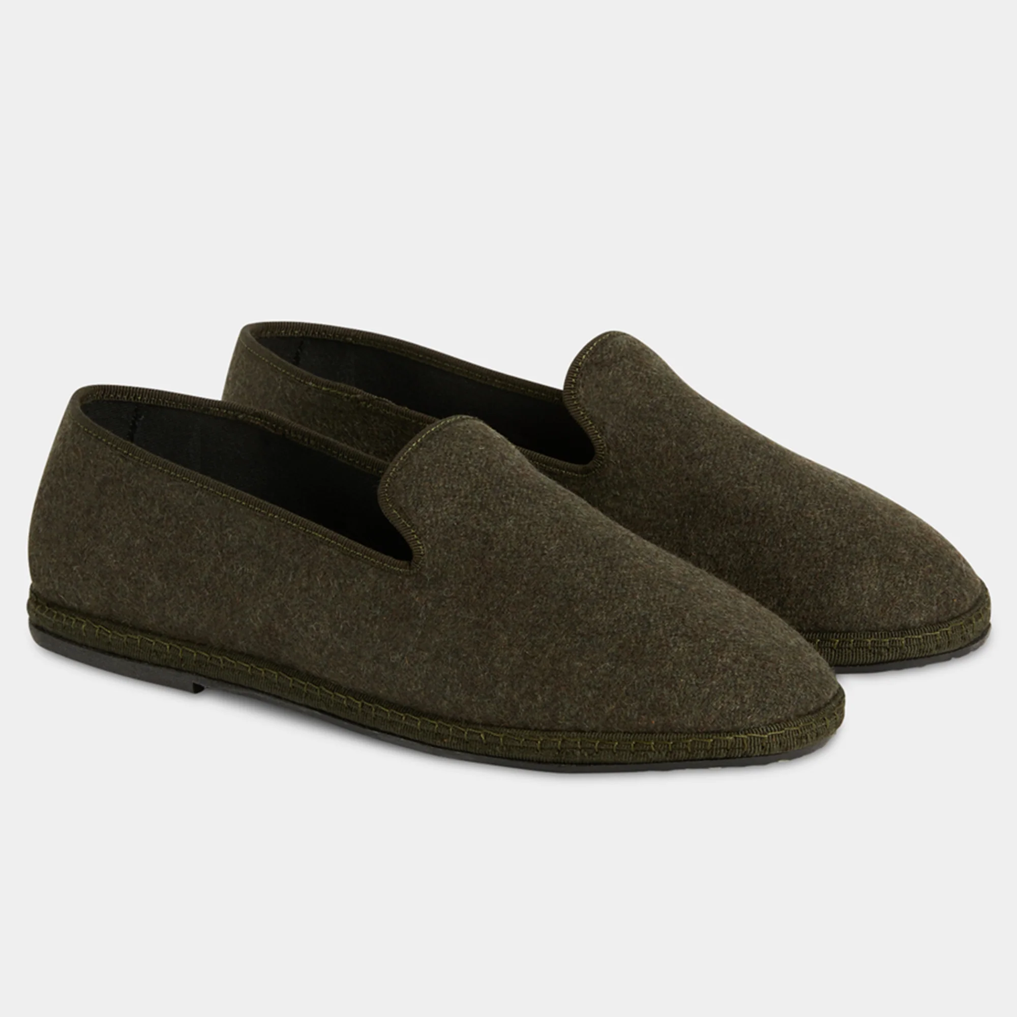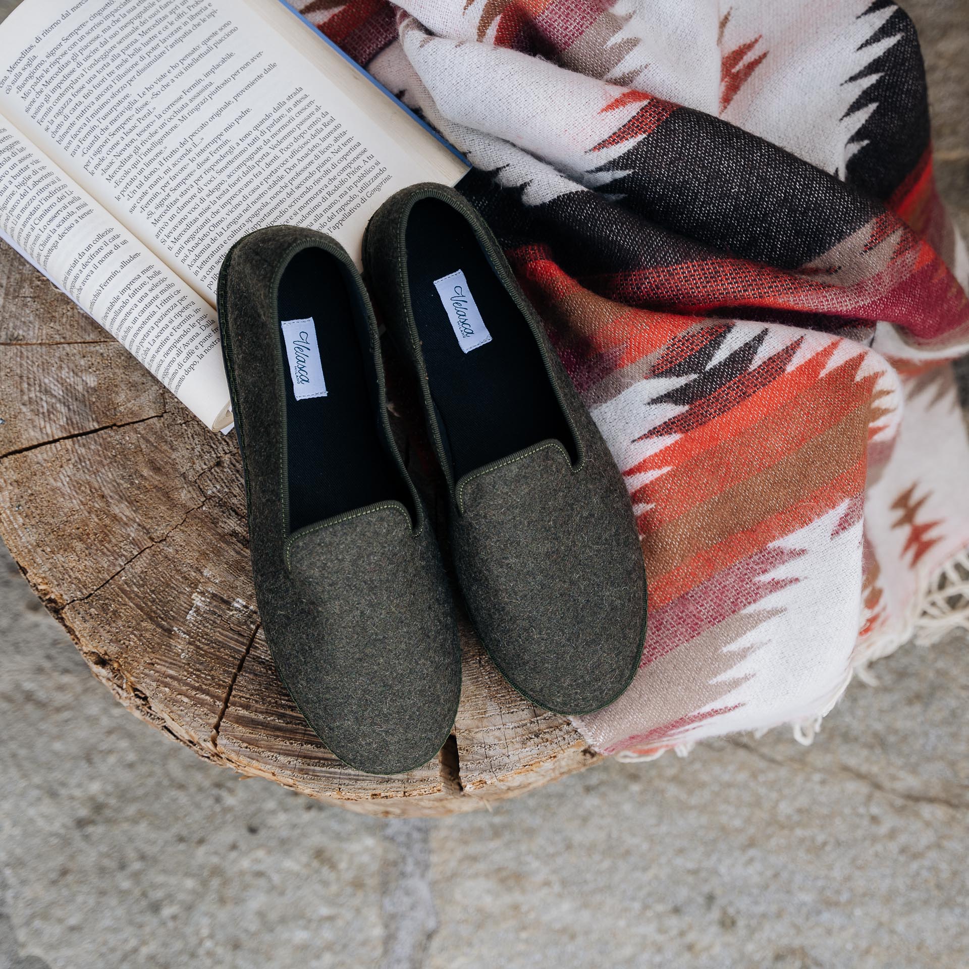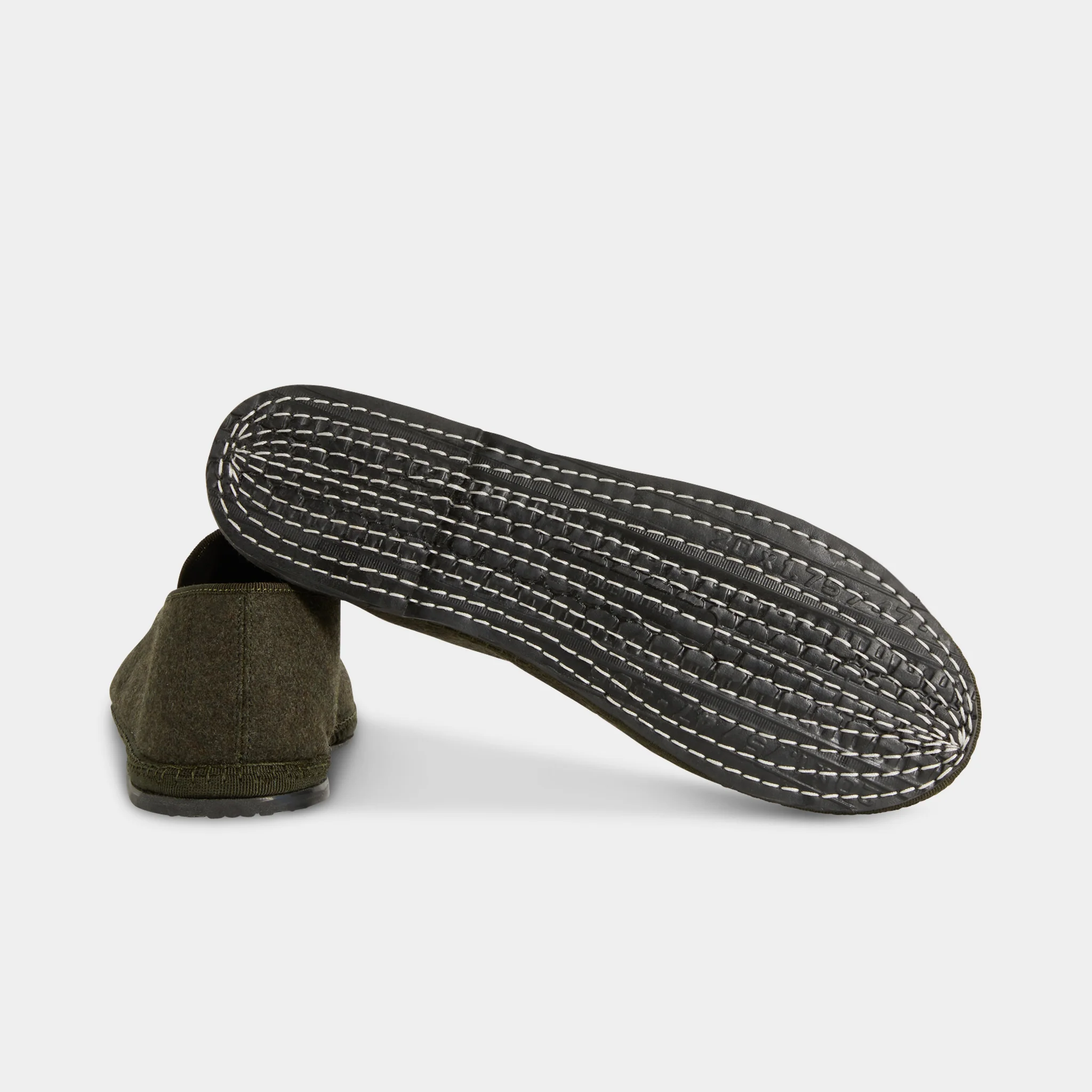 Le Friulane in lana cotta verde a coste e suola in gomma con cuciture a vista. Sono scarpe della tradizione del Friuli che originariamente venivano fatte in casa dalle signore dei paesini di montagna, poi trovarono nuova vita tra i canali veneziani: i gondolieri avevano bisogno di una scarpa comoda, stabile e delicata sul legno. La cucitura artigianale, con la sua andatura irregolare, rende ogni scarpa un pezzo unico. Comode e avvolgenti con la linguetta che copre fino al collo del piede, quasi non le senti; perfette per rilassarsi a casa dopo una giornata in mezzo alla neve.