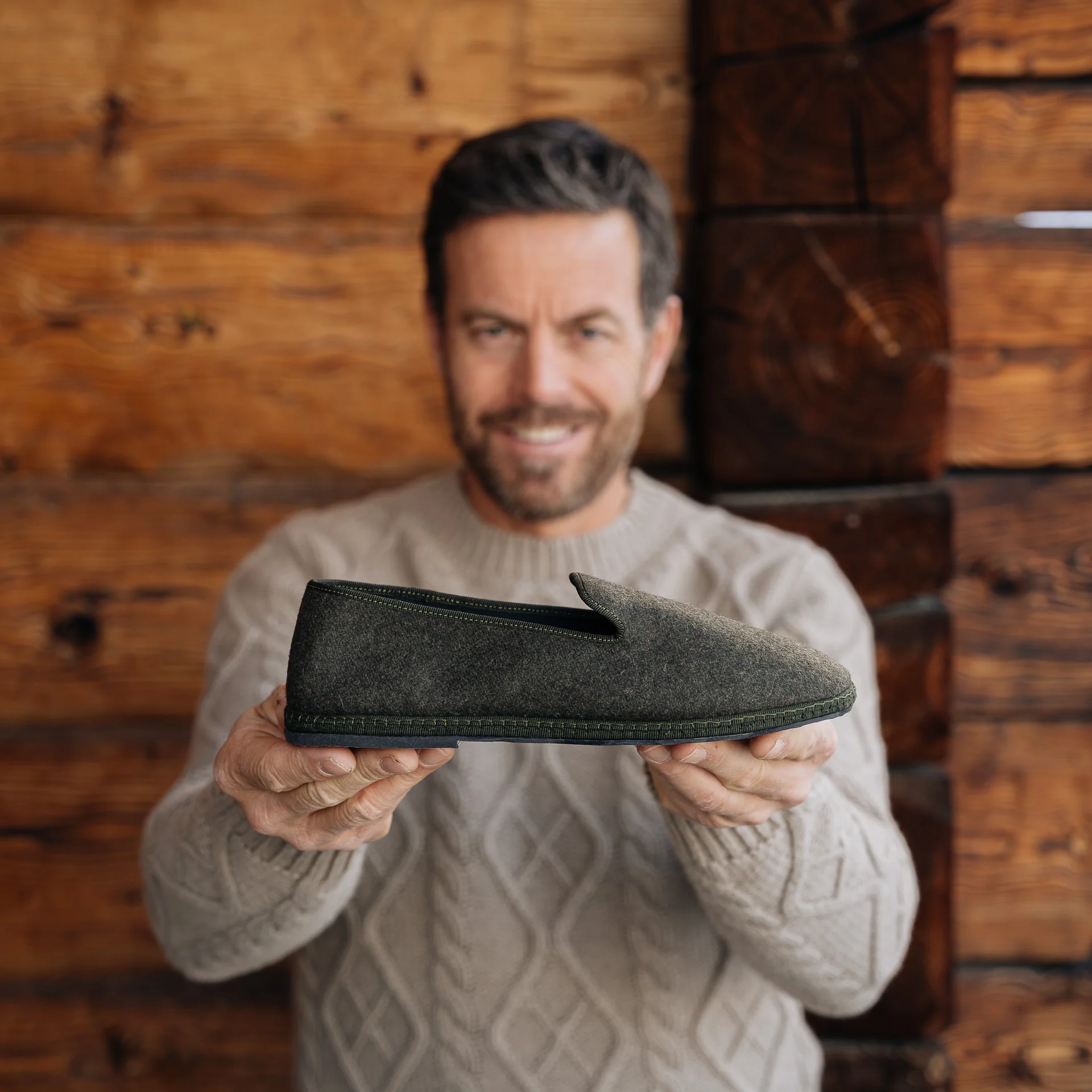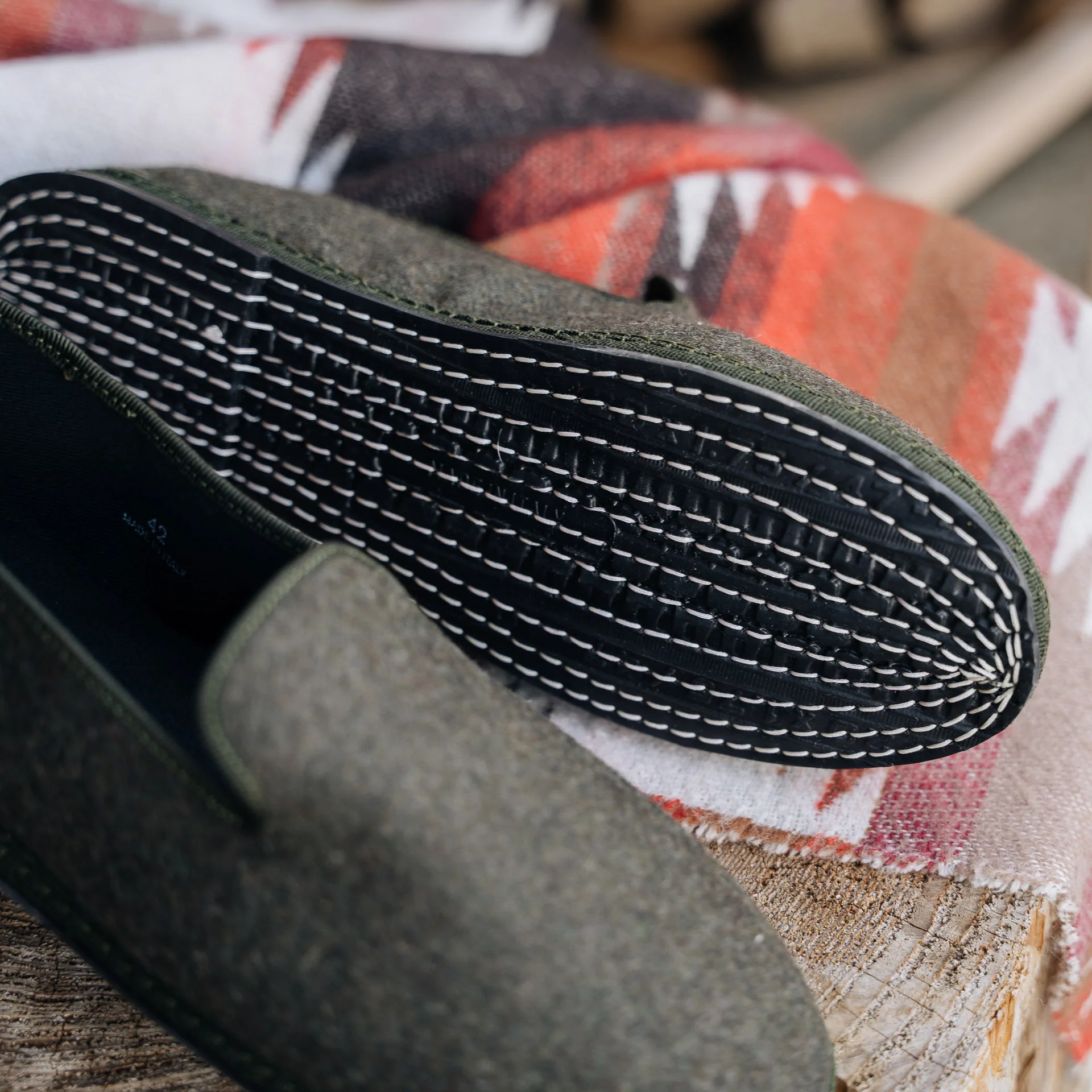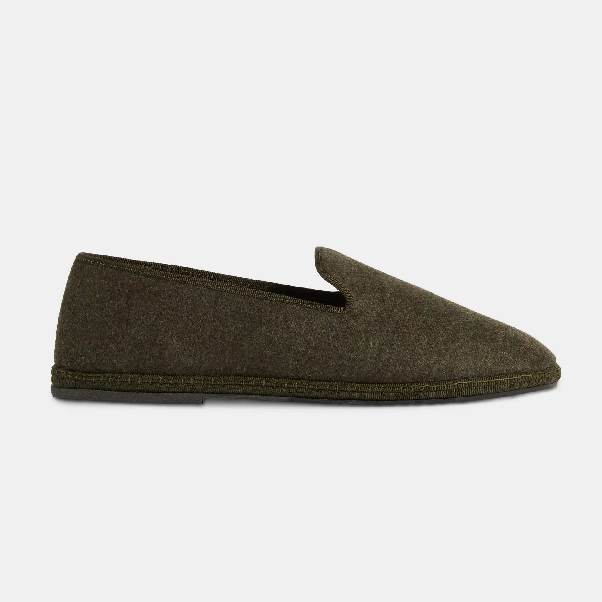 Le Friulane in lana cotta verde a coste e suola in gomma con cuciture a vista. Sono scarpe della tradizione del Friuli che originariamente venivano fatte in casa dalle signore dei paesini di montagna, poi trovarono nuova vita tra i canali veneziani: i gondolieri avevano bisogno di una scarpa comoda, stabile e delicata sul legno. La cucitura artigianale, con la sua andatura irregolare, rende ogni scarpa un pezzo unico. Comode e avvolgenti con la linguetta che copre fino al collo del piede, quasi non le senti; perfette per rilassarsi a casa dopo una giornata in mezzo alla neve.