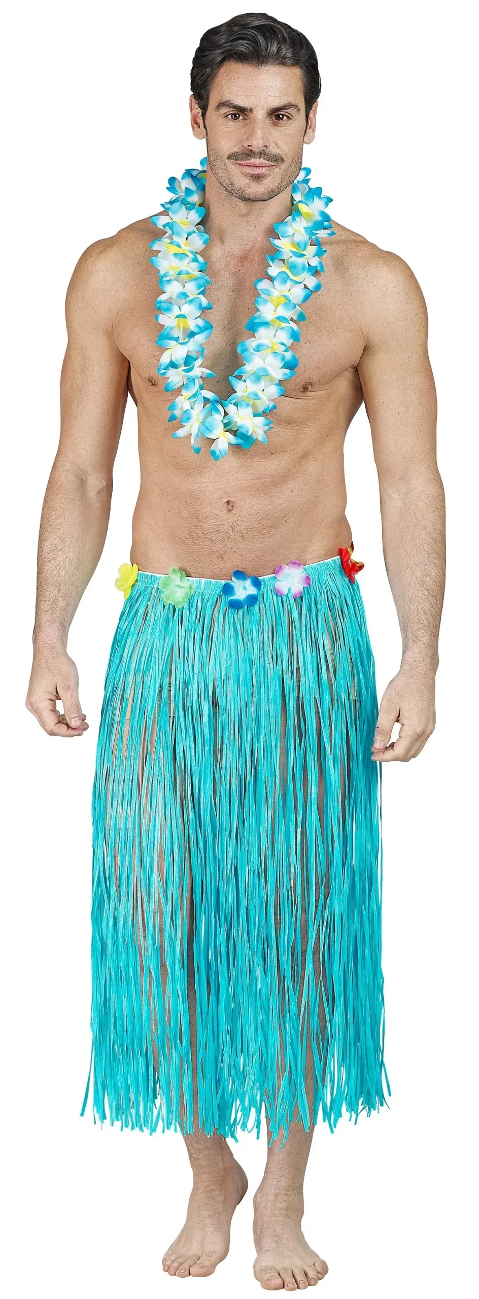Stai cercando una gonna hawaiana per il tuo costume? Con la gonna hawaiana di colore blu con fiori colorati in vita avrai il complemento perfetto per il tuo costume da hawaiana o hawaiano.