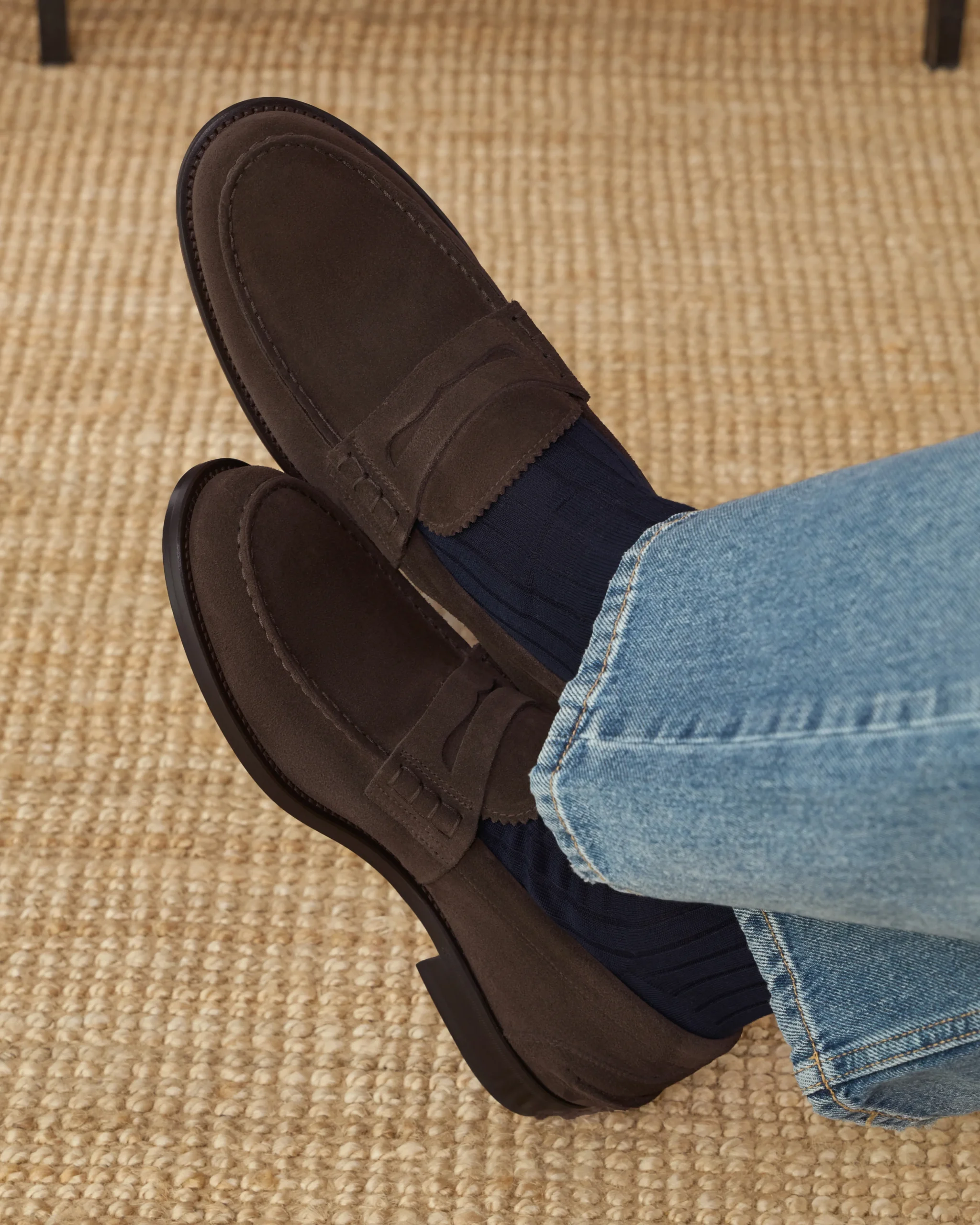 Il Penny Loafer con la tradizionale mascherina, una scarpa semplice che nel tempo è rimasta iconica. In pelle di vitello scamosciata e con la classica suola in cuoio, è casual per natura. Noi l’abbiamo abbinata a un total look in denim.