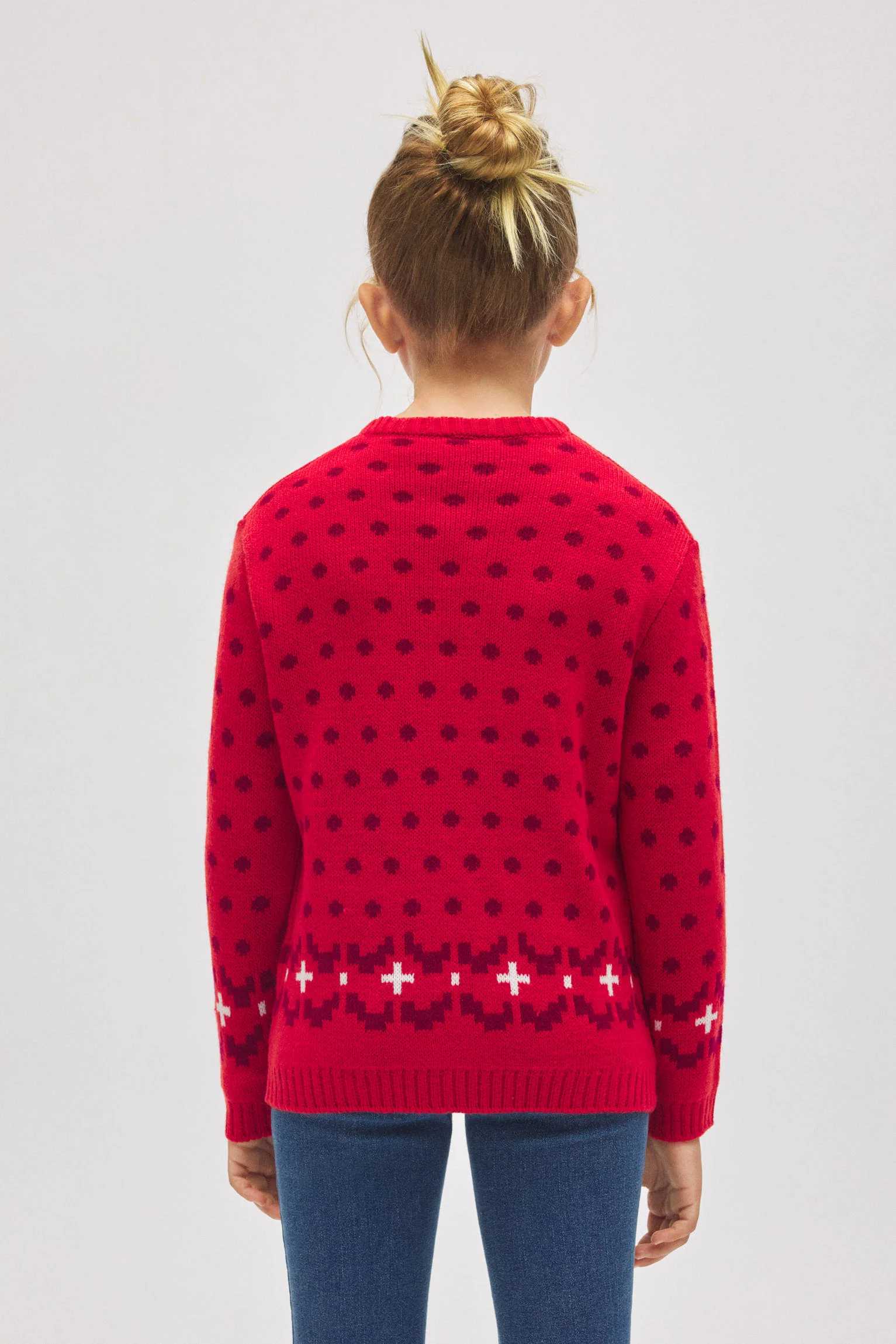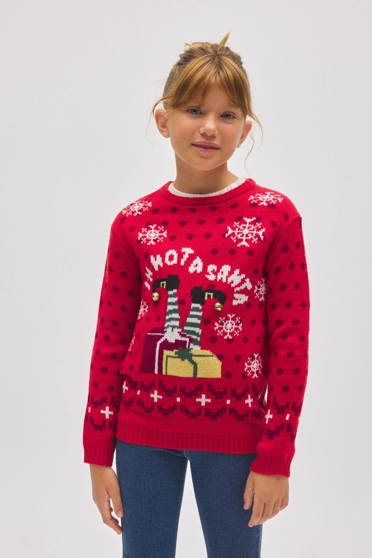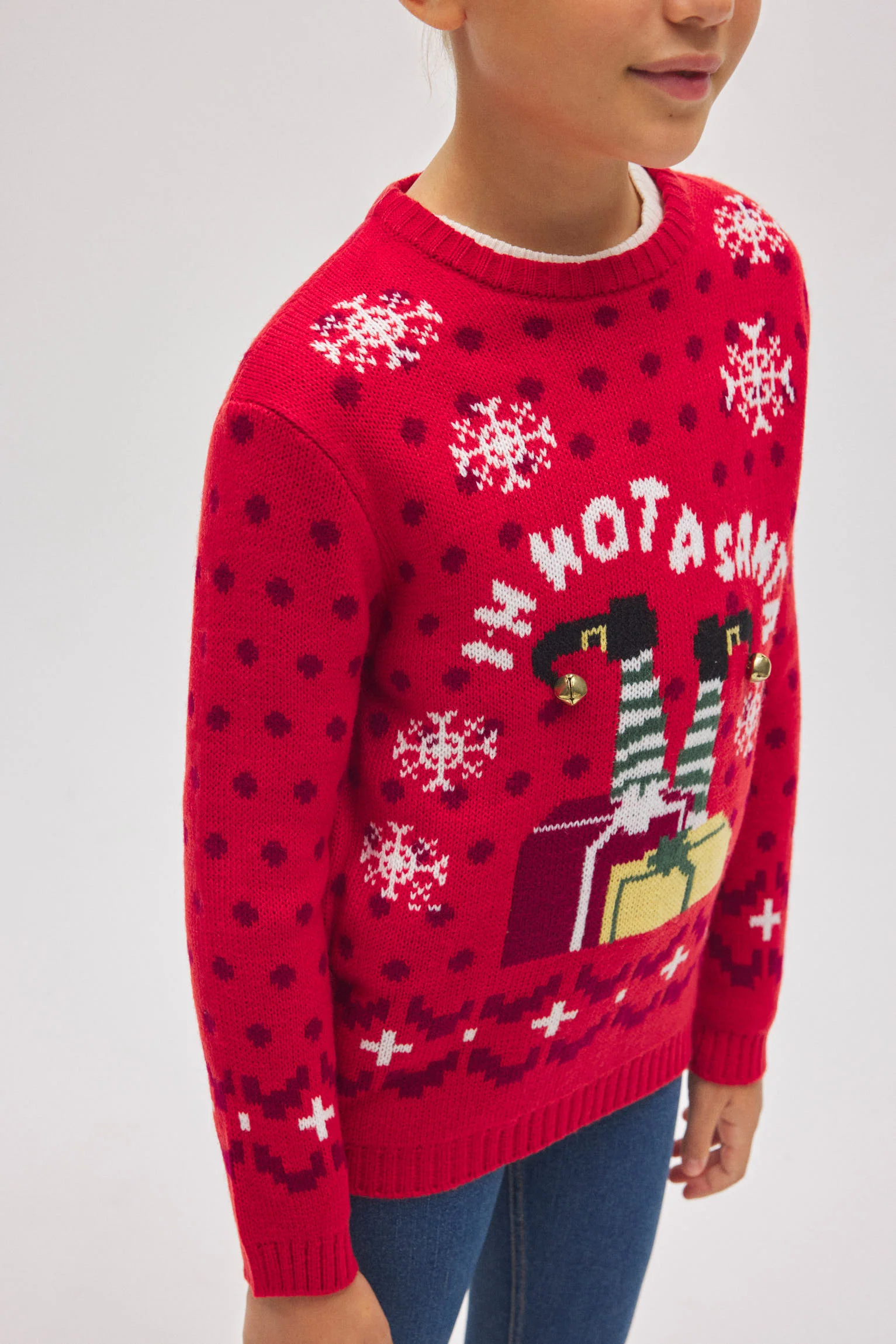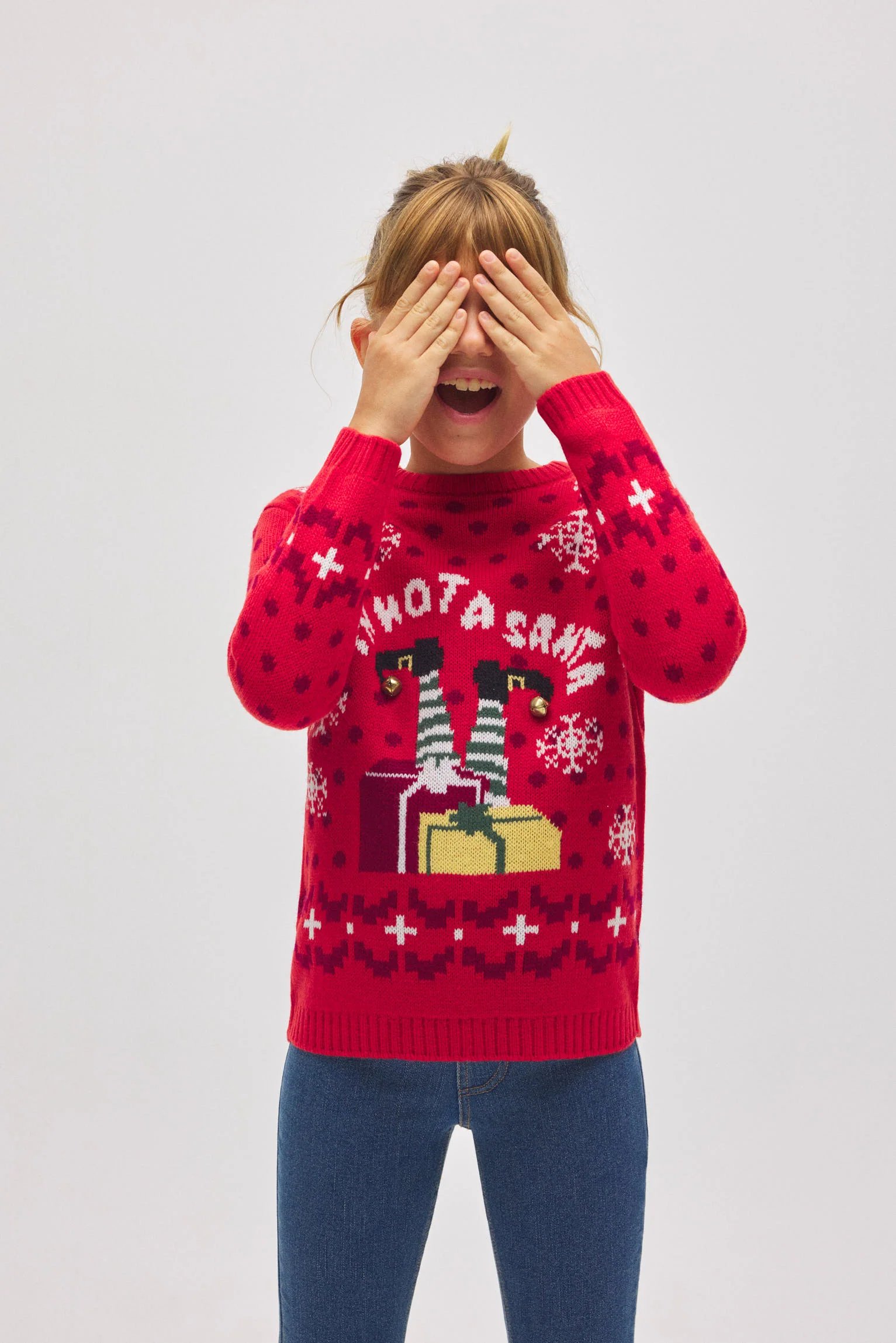 Questo maglione natalizio per bambini è perfetto per i più piccoli che festeggiano il Natale con entusiasmo e voglia di giocare. In un rosso intenso, presenta un motivo con gambe di elfo che spuntano dai regali, fiocchi di neve e la scritta “Non sono Babbo Natale”. Il dettaglio più divertente: veri campanellini incorporati nei piedi dell’elfo, che tintinnano mentre si muove.