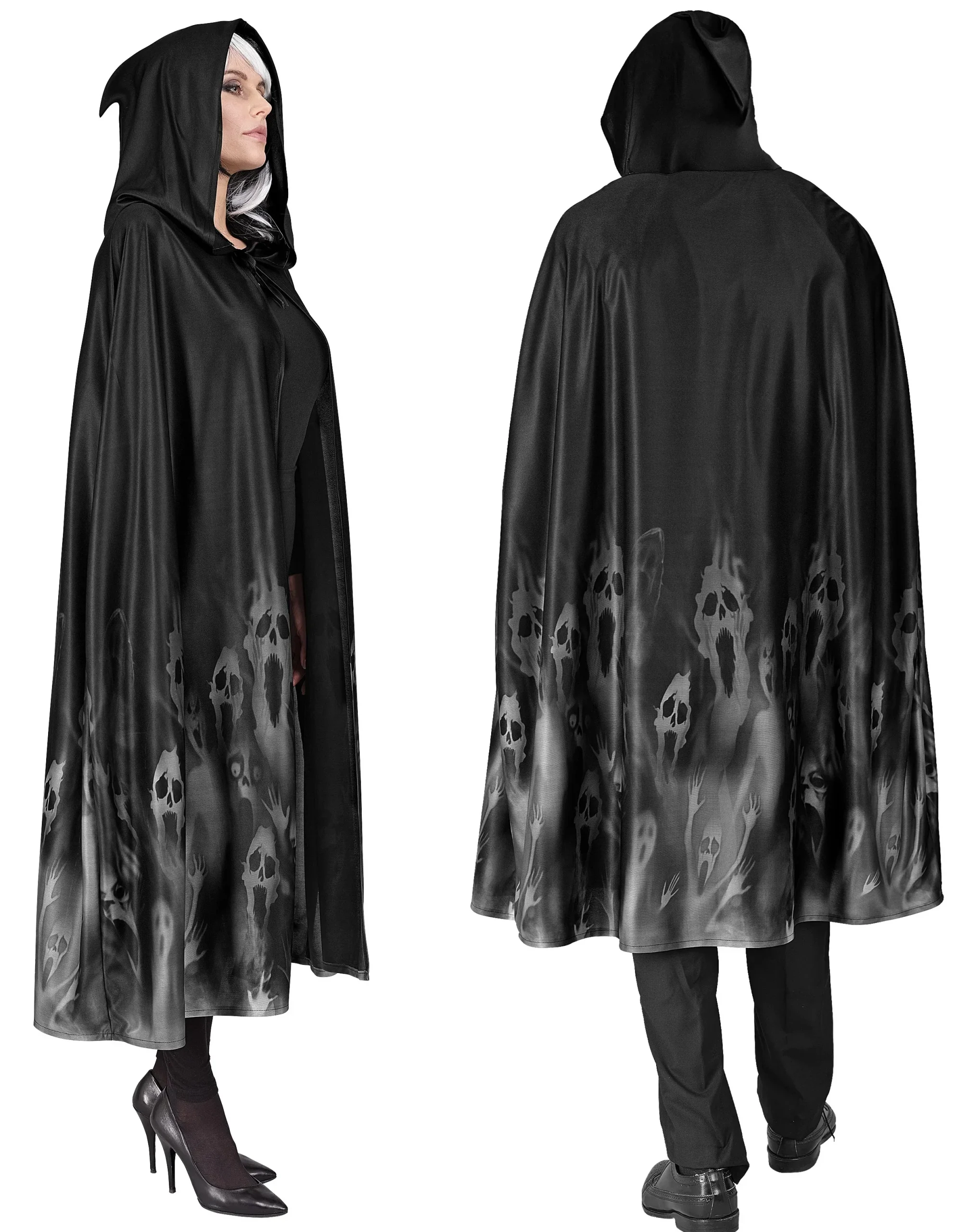Stai cercando un mantello nero con cappuccio per il tuo costume da strega o stregone? Con il mantello con cappuccio per uomo o donna di colore nero con fantasmi bianchi avrai l’accessorio perfetto per una grande varietà di costumi di Halloween come la morte o stregone e strega negromante praticanti della magia nera e trionferai alla tua festa in maschera.