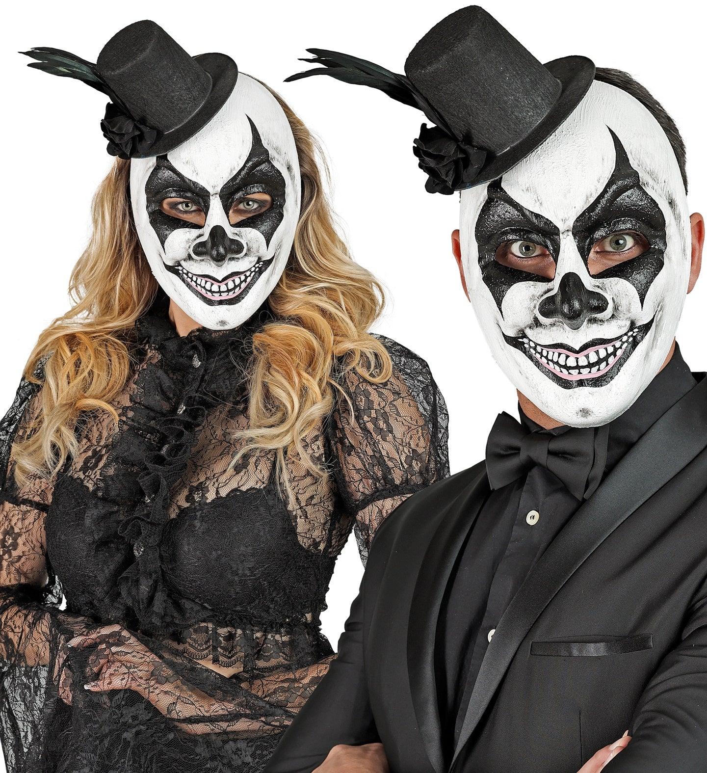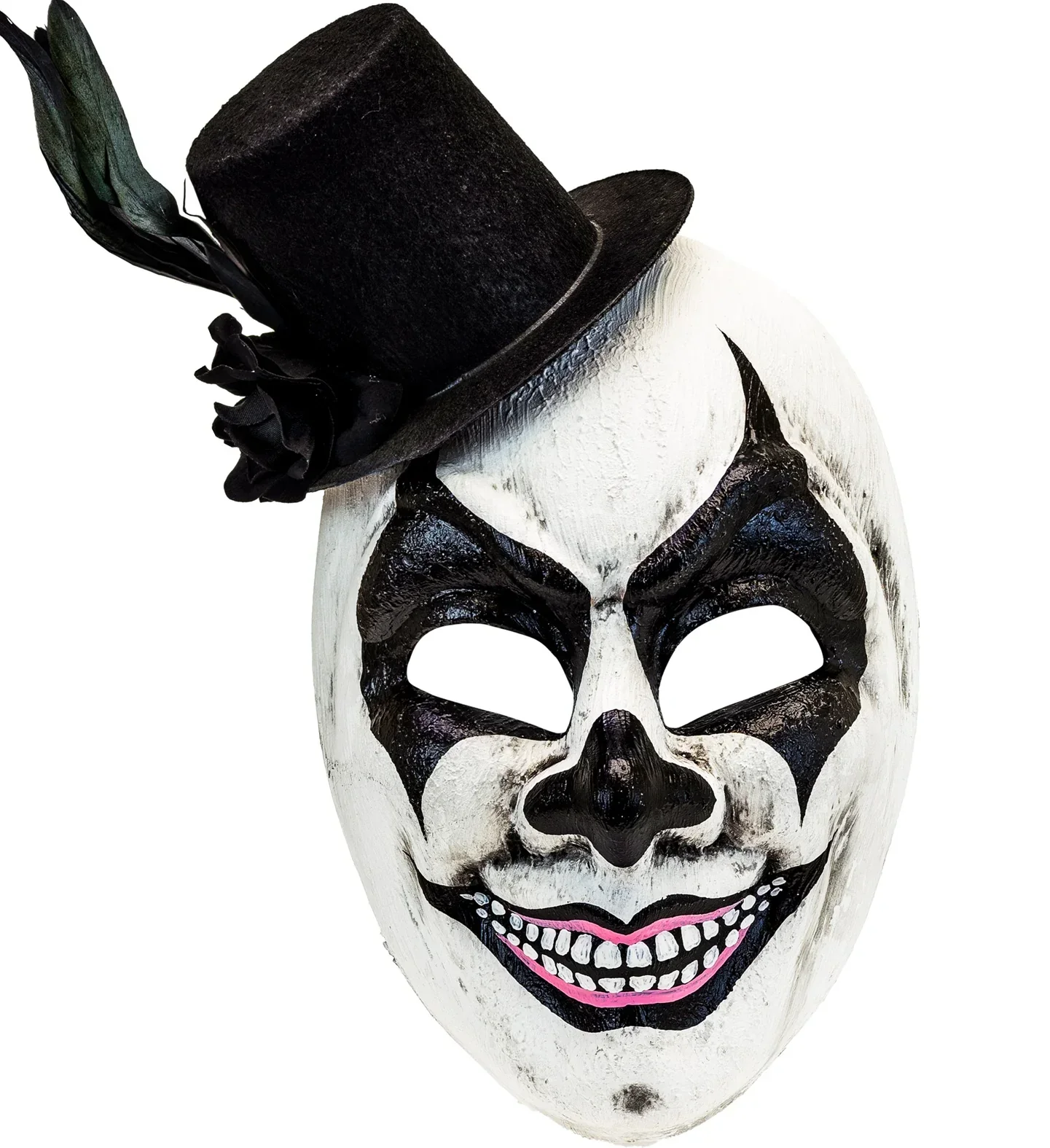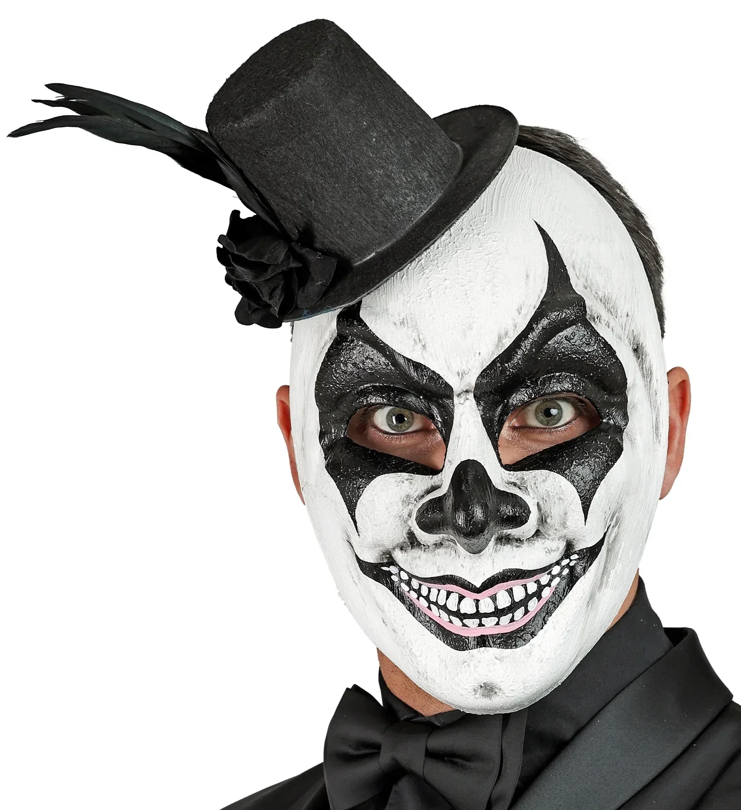 Stai cercando una maschera da pagliaccio assassino per il tuo costume di Halloween? Con la maschera da pagliaccio assassino bianco e nero con cilindro avrai l’accessorio perfetto per travestirti da elegante pagliaccio psicopatico alla tua festa di Halloween.
